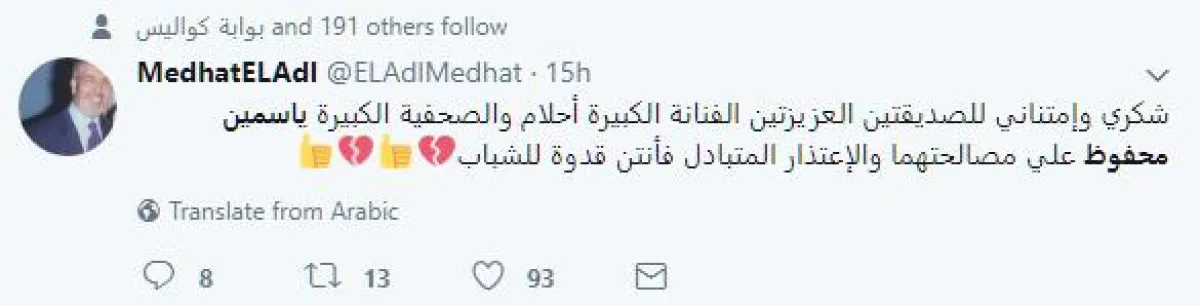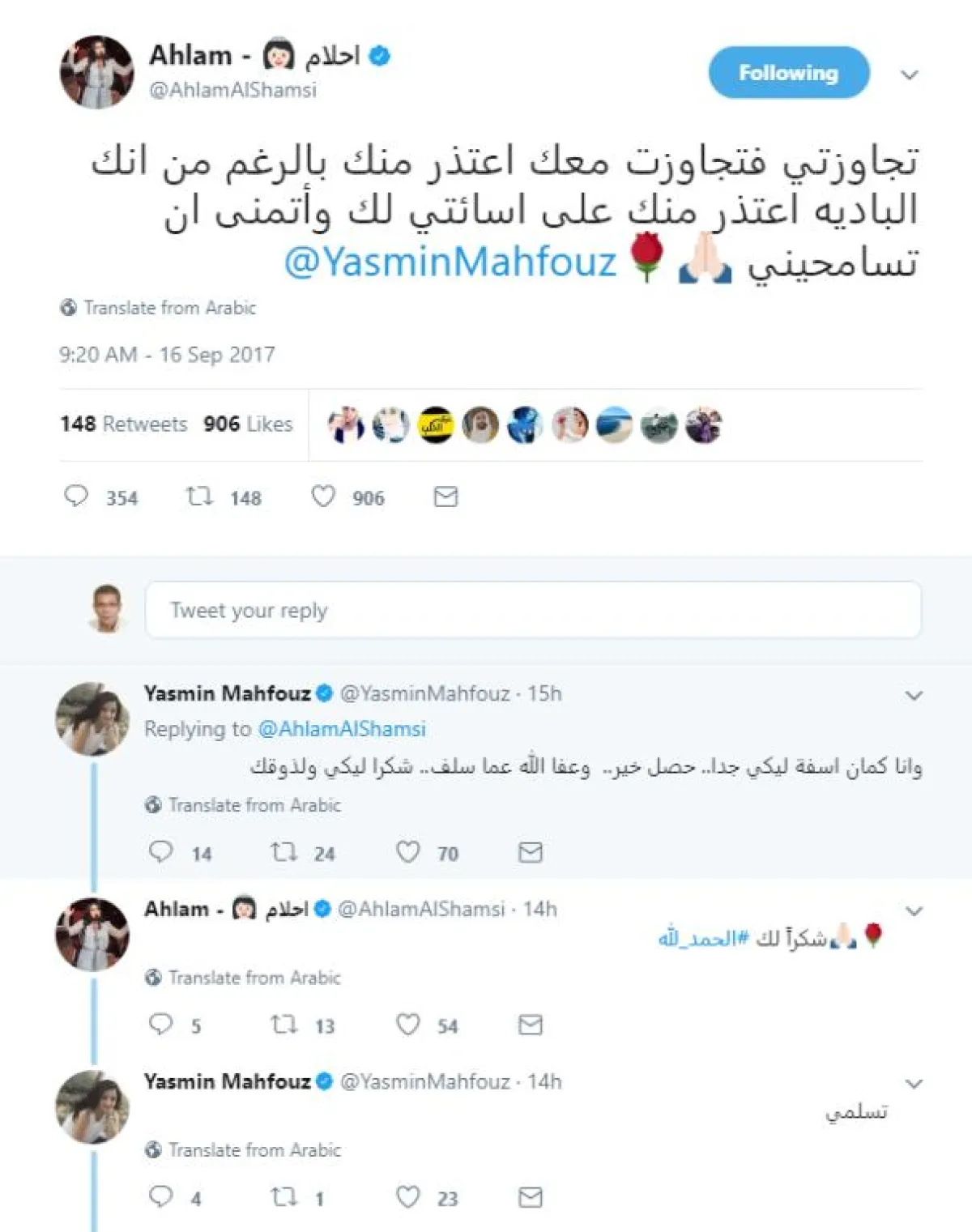 وبدأت ياسمين حملةً لحذف التغريدات المسيئة لأحلام، خاصّةً وأنّ عدداً كبيراً من رموز الفن المصري تدخّلوا لتهدئة الأجواء ومن بينهم الشاعر مدحت العدل، الذي وجّه الشكر لأحلام ومحفوظ على تغريدات الإعتذار، قائلاً: شكري وامتناني للصديقتين العزيزتين الفنّانة الكبيرة أحلام والصحفية الكبيرة ياسمين محفوظ على مصالحتهما والإعتذار المتبادل فأنتن قدوة للشباب".