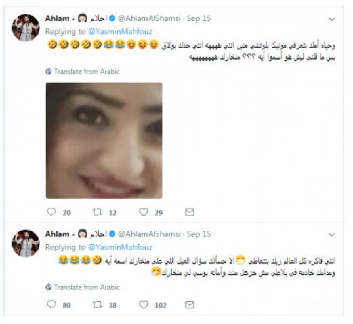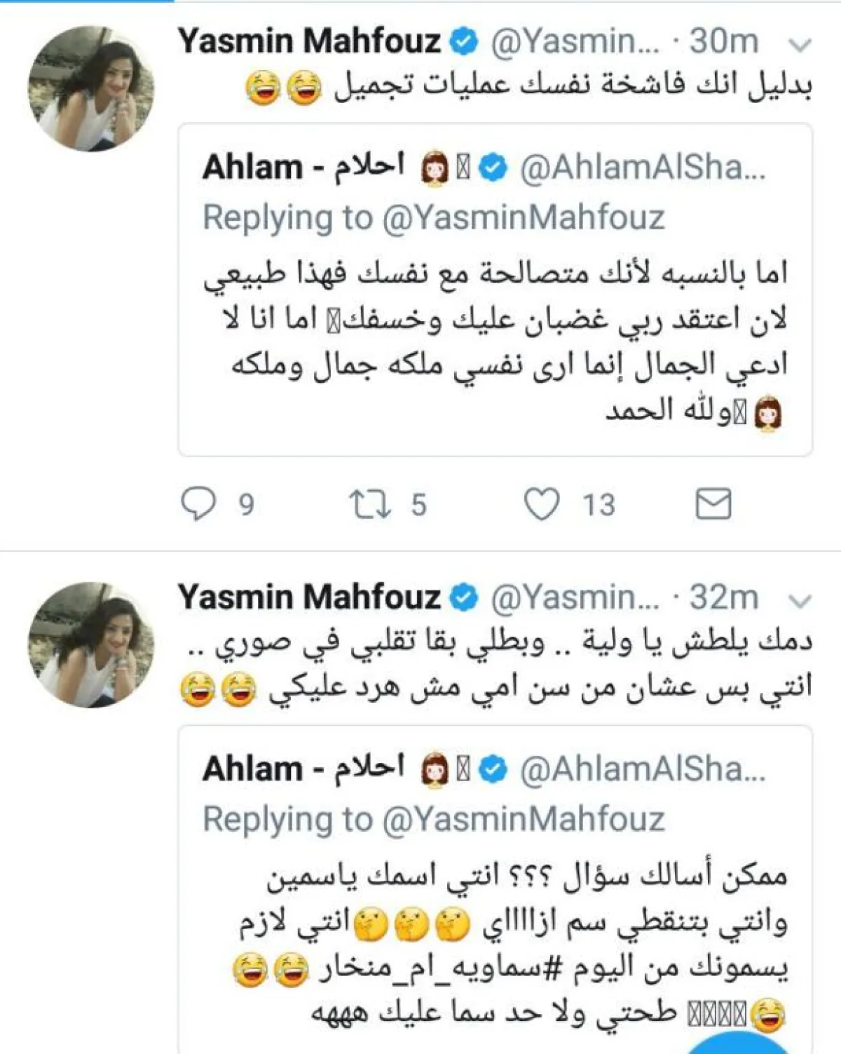 بعد 48 ساعة من تبادل السّباب ونشر الصور الجارحة، إنتهت أخيراً معركة المطربة الإمارتية أحلام مع الإعلامية المصرية ياسمين محفوظ، باعتذارٍ متبادل من الطرفين، وحملةٍ لحذف التغريدات المسيئة بين أنصارهن، خاصةً وأنّ أحلام فتّشت في الصور القديمة للإعلامية المصرية وسخرت من شكل أنفها، فما كان من الأخيرة إلّا نشر الصّور القديمة لأحلام قبل جراحات التجميل، وتضامن معها عددٌ كبيرٌ من المصريين بعبارات السخرية الجارحة، و لم تتحمّل الملكة عناء الإستمرار في تلقي التجريح بعدما بدا أنّ ياسمين لن تتأثّر بهجمات "الحلوميين".