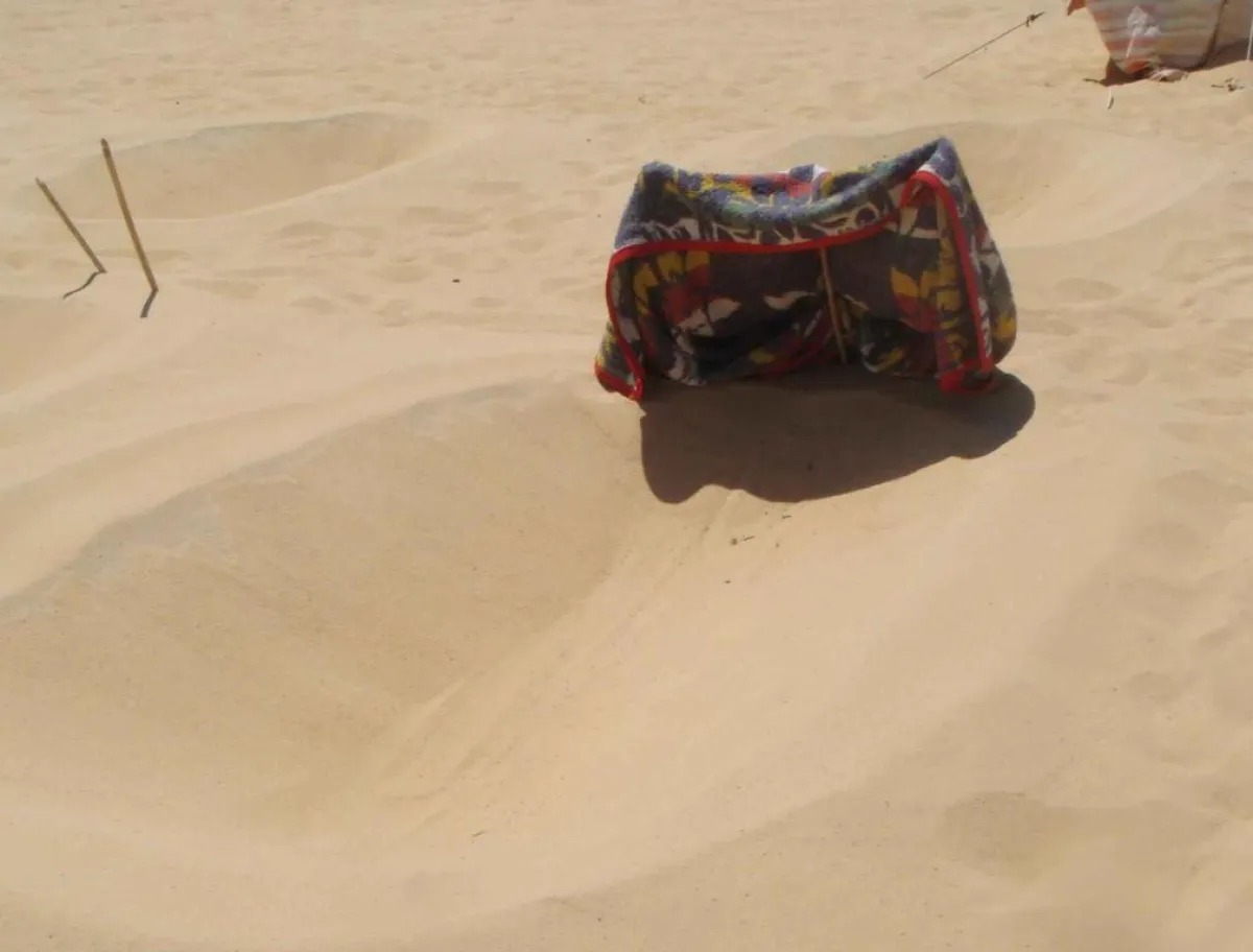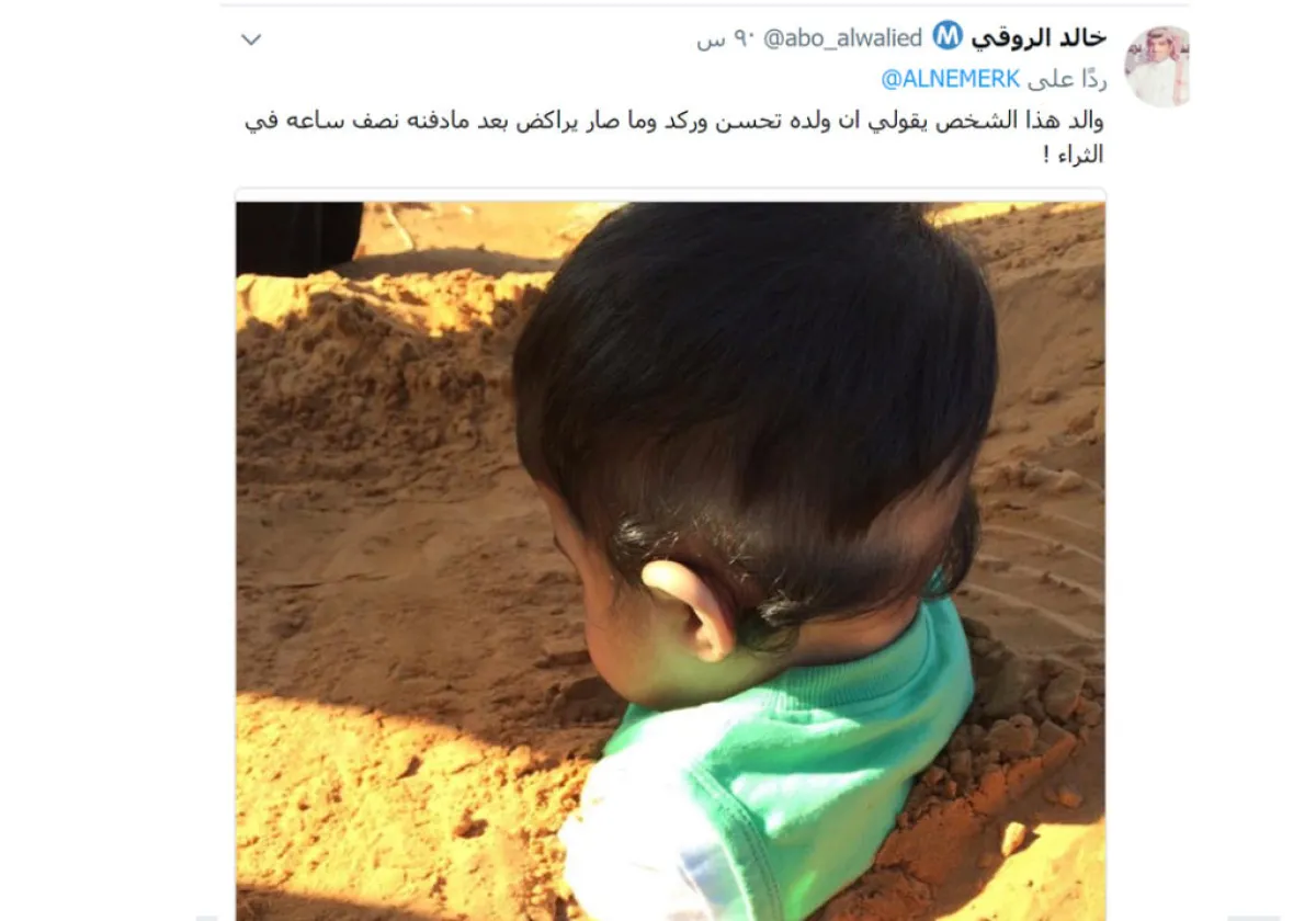 وقد غرَّد أحد النشطاء بصورة أخرى للطفل، وهو يجلس هادئاً أثناء دفنه في الرمال، وأورد عن والد الطفل قوله: "إن ولده تحسَّن، وتوقف عن الركض بعد أن قام بدفنه لمدة نصف ساعة في الرمال". ما أثار استياء المغردين الذين وجهوا له انتقادات شديدة على تصرفه غير المسؤول.