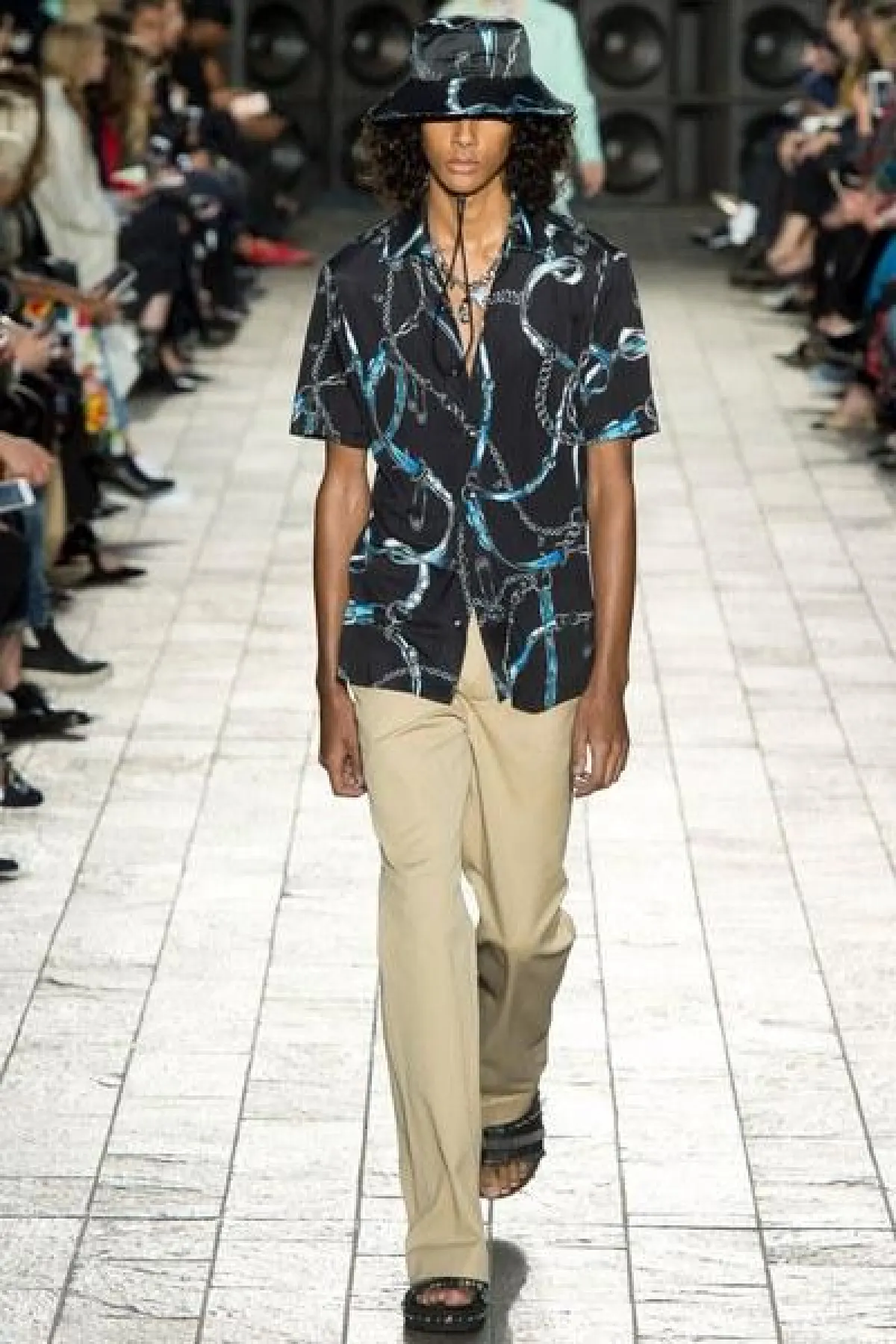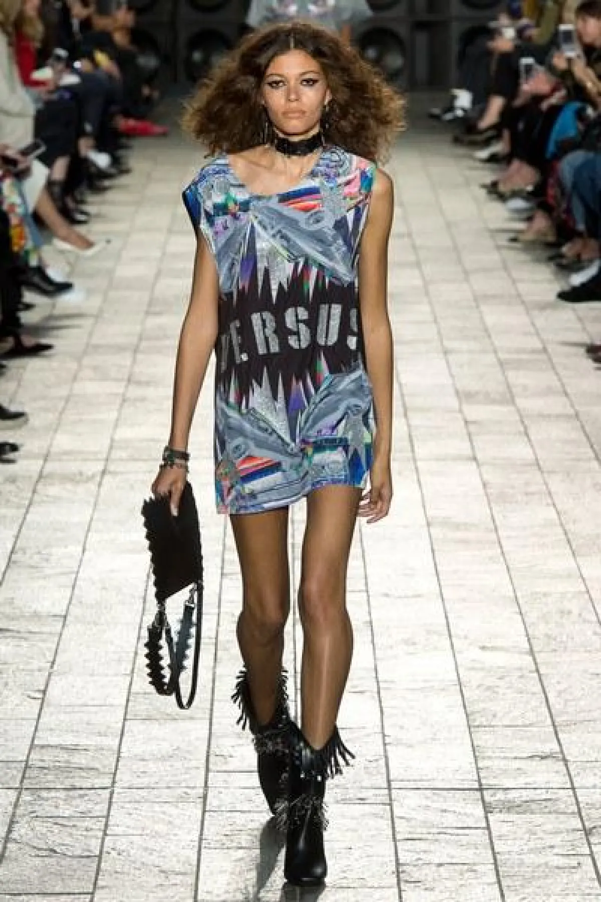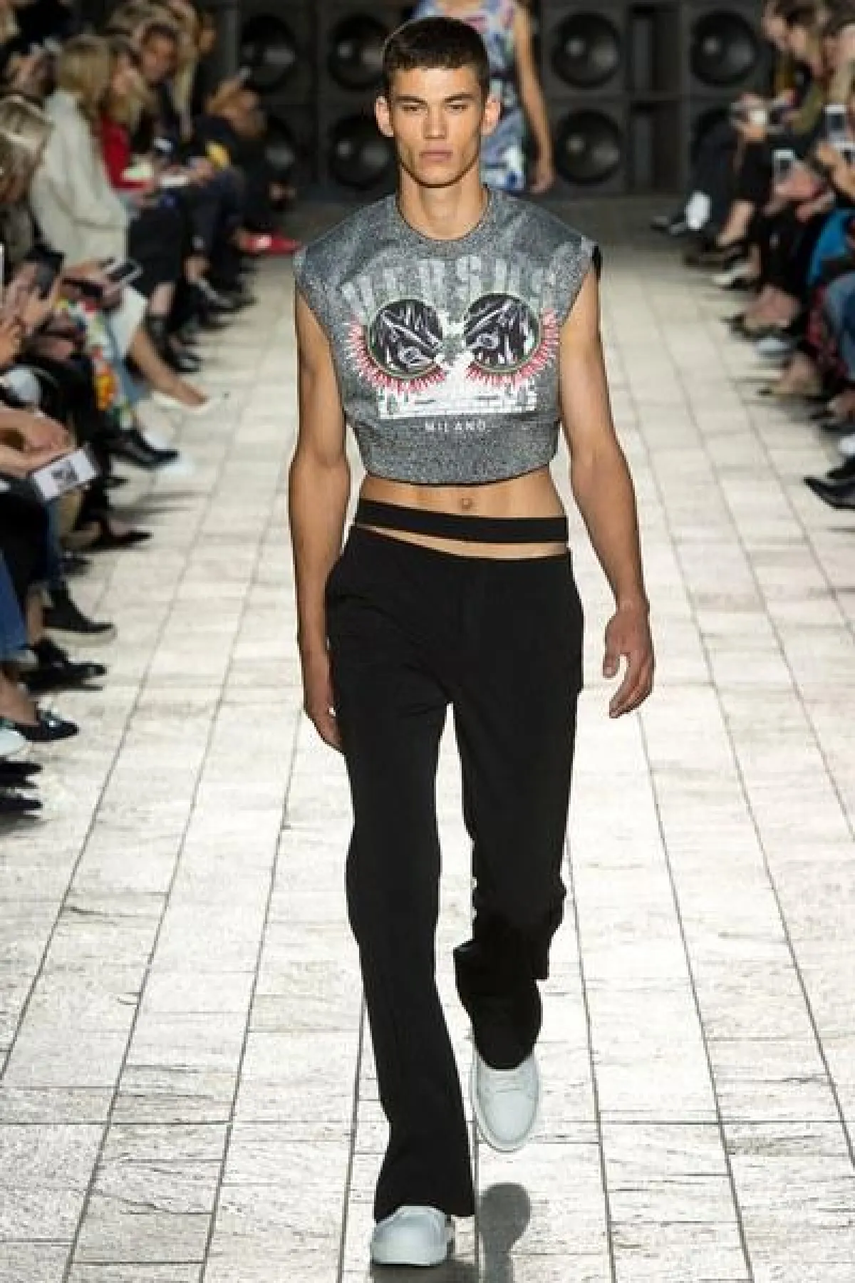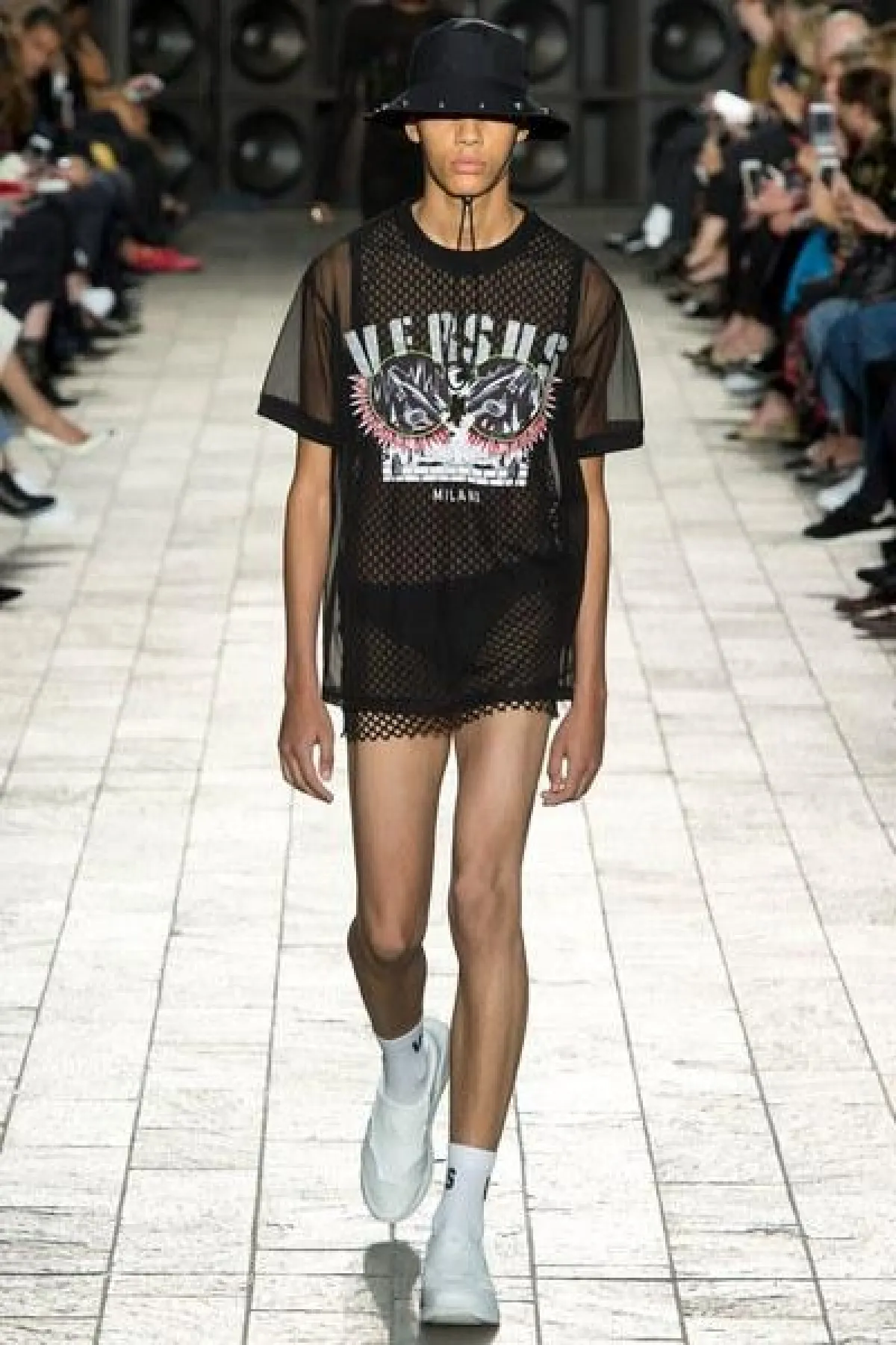 لكن الملفت في عرض فيرساتشي "التوب" القصيرة المكشوفة عند البطن لدى السيدات، والقميص المطبع مع القبعة عند الرجال.