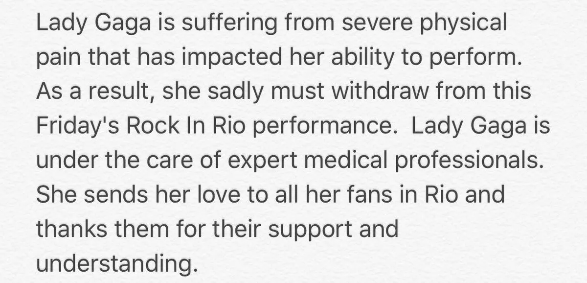 وقال البيان: "تعاني ليدي غاغا من ألمٍ جسدي شديد أثّر على قدرتها على الأداء". وأضاف "إنها لا تزال تحت رعاية الخبراء الطبيين المختصين الذين أوصوا تأجيل الجولة. لقد شعرت ليدي غاغا بالخيبة لأن عليها أن تنتظر فترةً قبل لقاء معجبيها الأوروبيين. وهي تخطط لقضاء الأسابيع السبعة المقبلة بشكل استباقي مع أطبائها للشفاء من هذا الألم خاصةً وأنّ الصدمات السابقة لا تزال تؤثر على حياتها اليومية، وتؤدي إلى ألمٍ شديد في جسدها. إنها تريد أن تعطي معجبيها أفضل ما لديها في العرض الذي حضّرته لهم عند استئناف الجولة ".