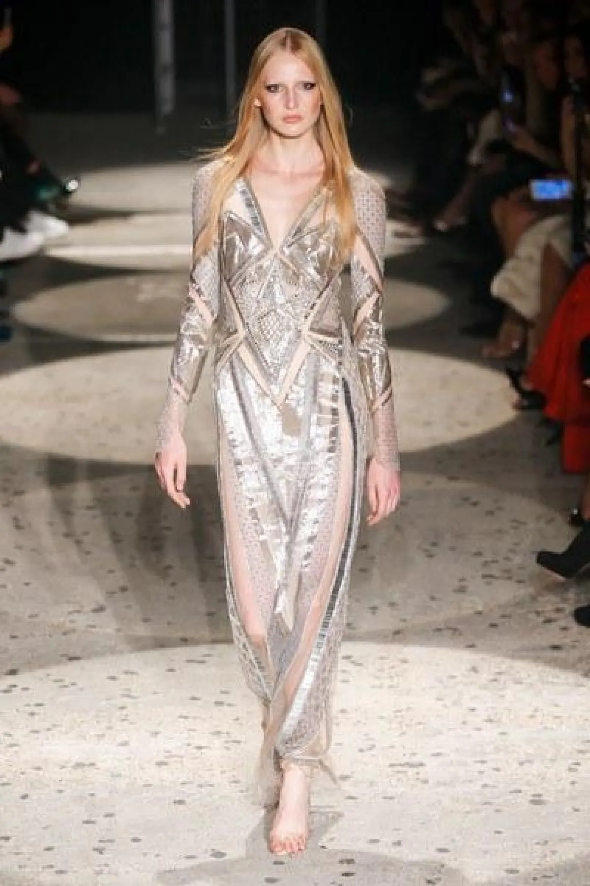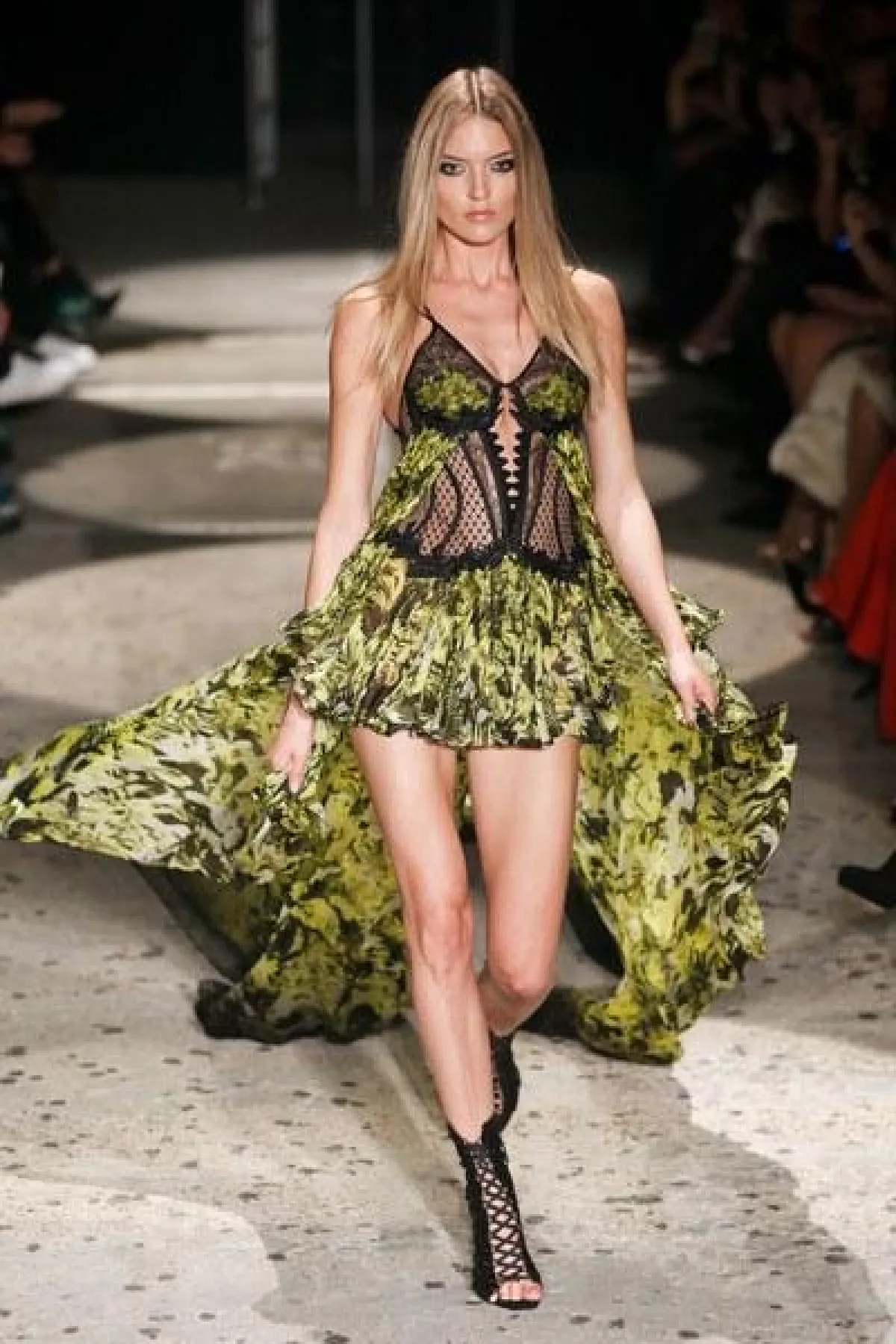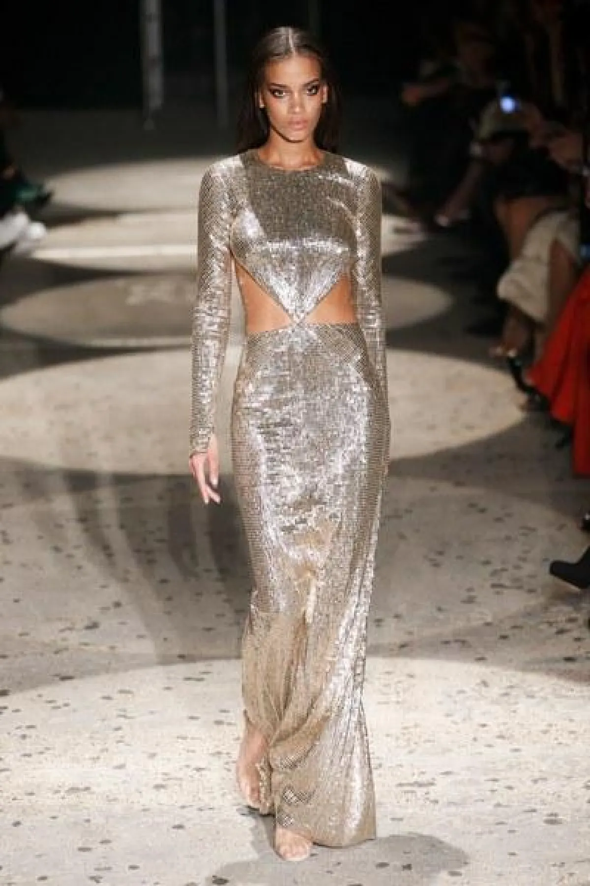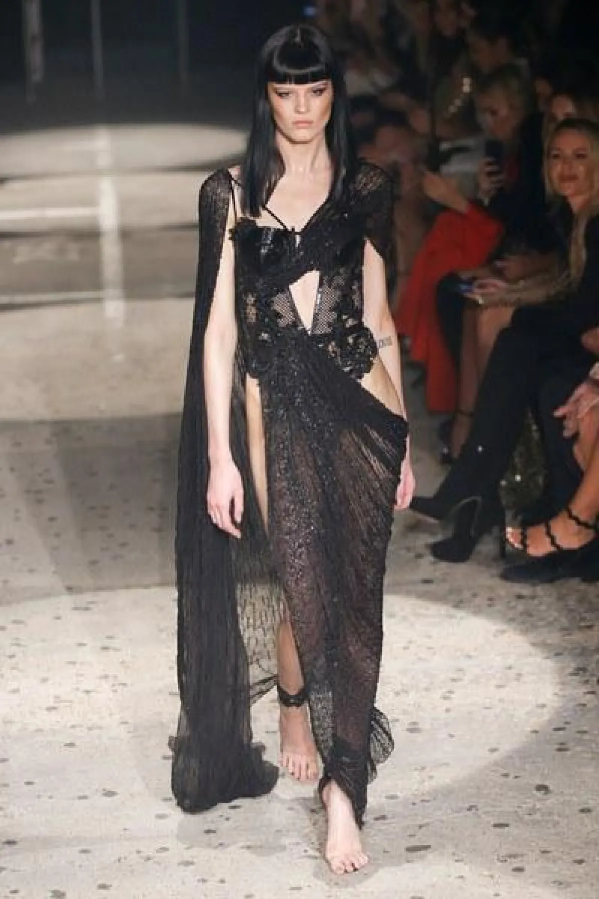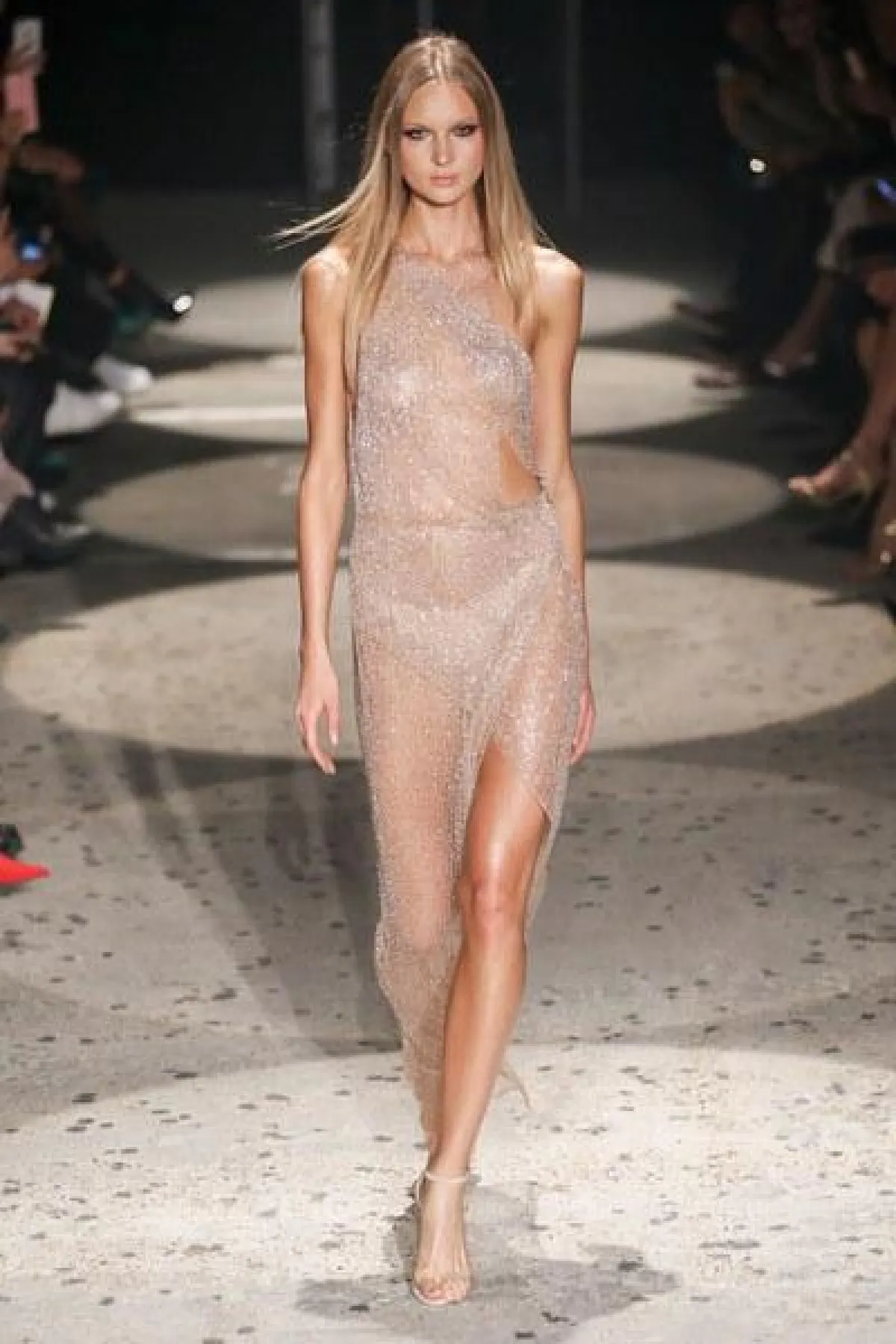 وتنوعت الأقمشة بين التول والكوبير، والدانتيل والشفاف، مع الستراس الناعم، كما ركّز ماكدونالد على الفتحة عند الفخذ والأكمام المخرّمة في أغلب فساتينه.