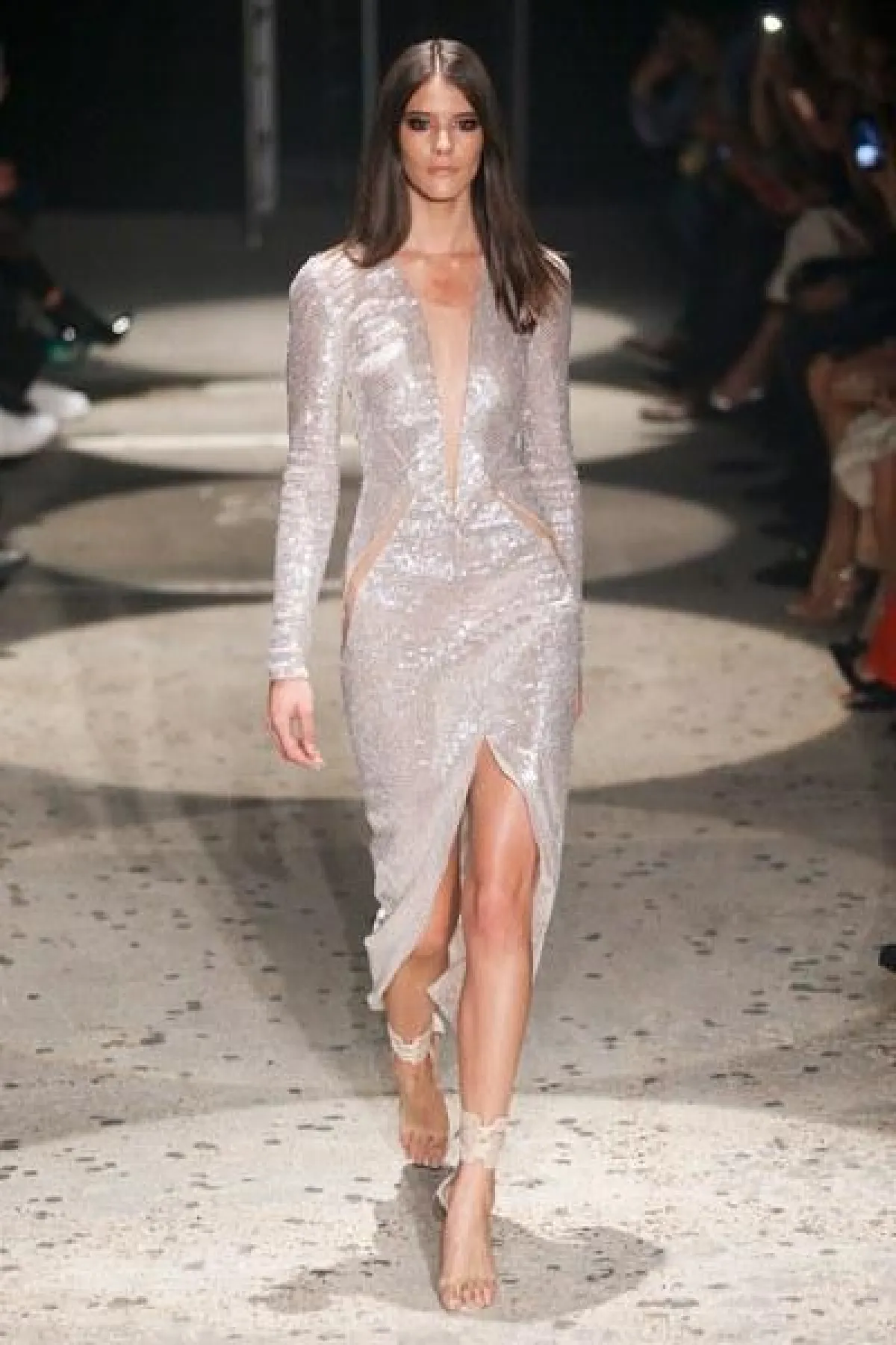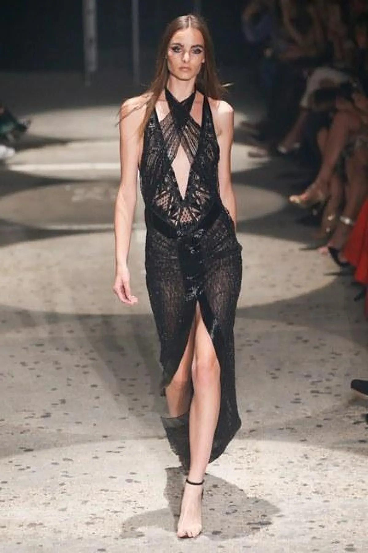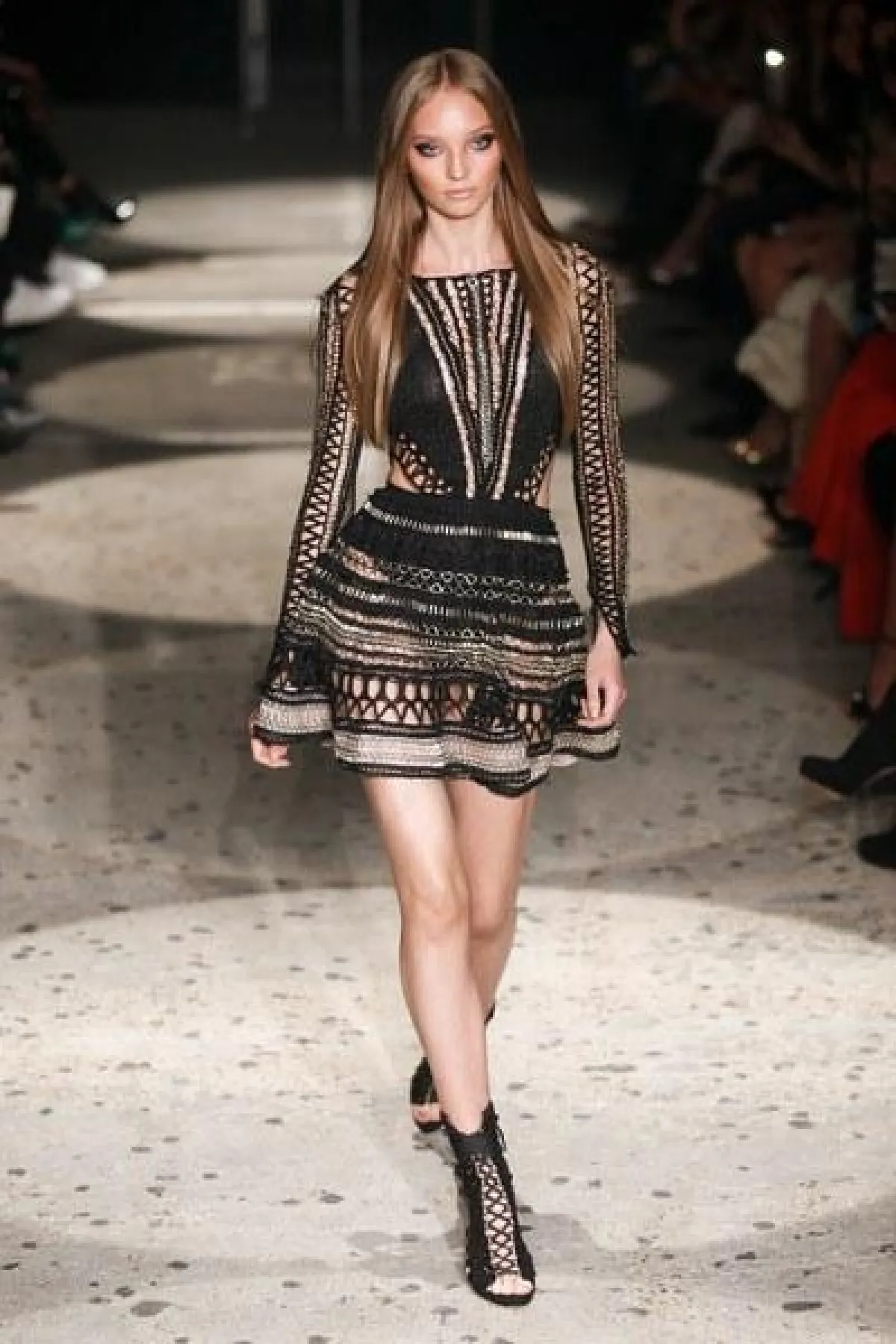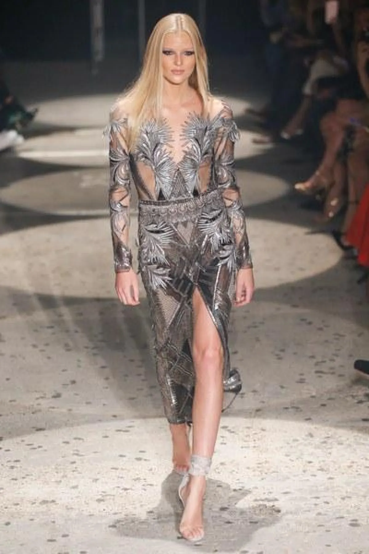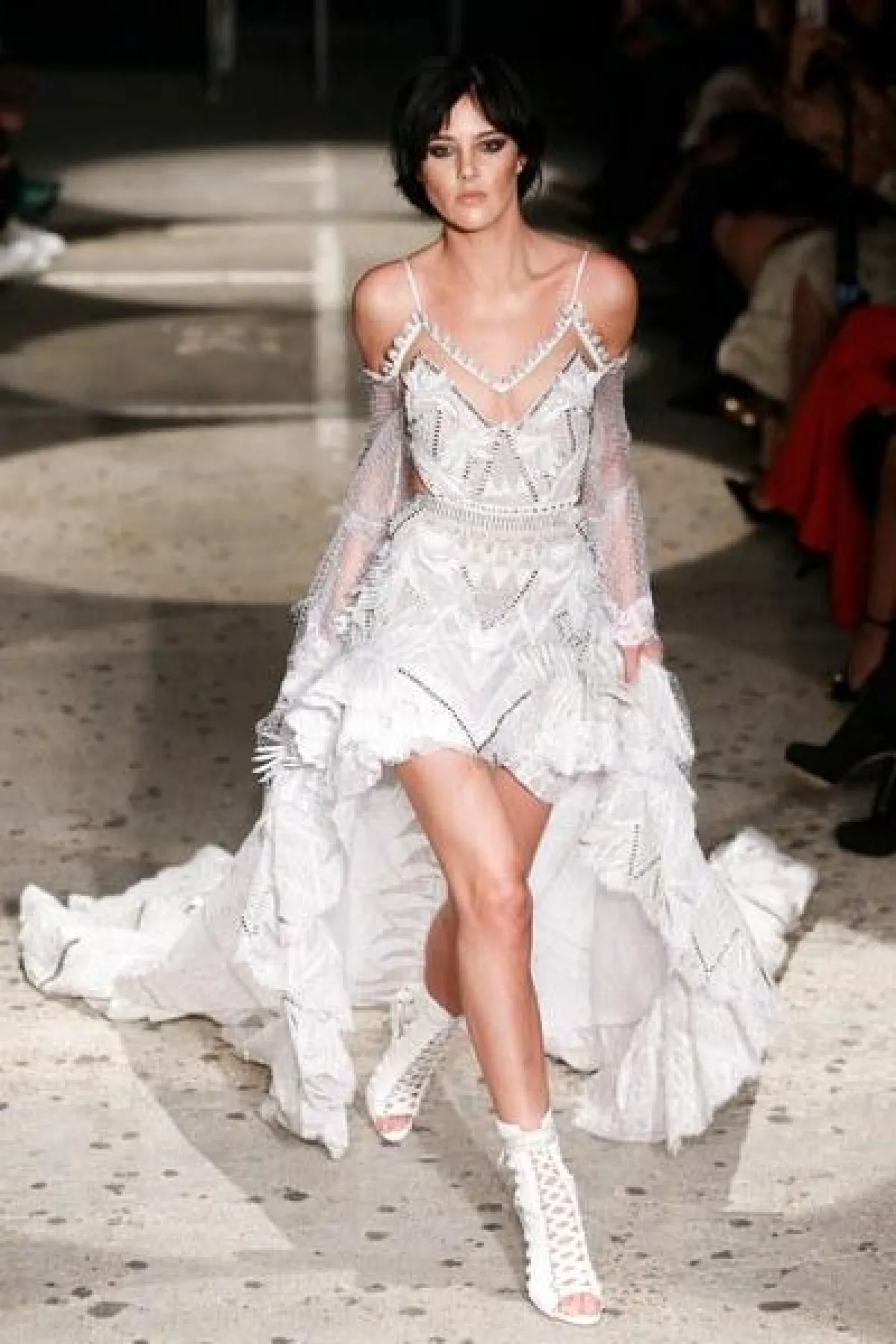 وتنوعت الأقمشة بين التول والكوبير، والدانتيل والشفاف، مع الستراس الناعم، كما ركّز ماكدونالد على الفتحة عند الفخذ والأكمام المخرّمة في أغلب فساتينه.