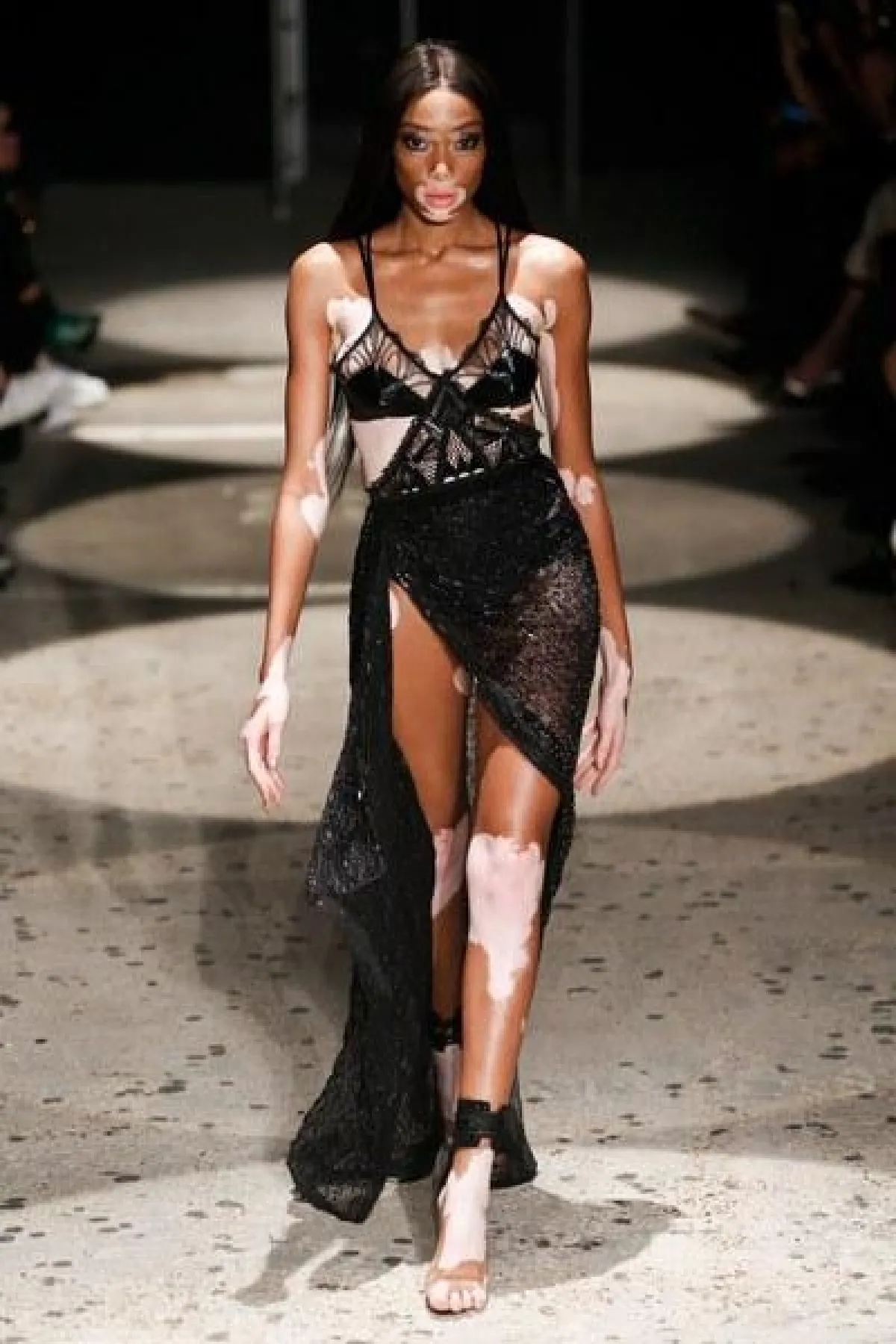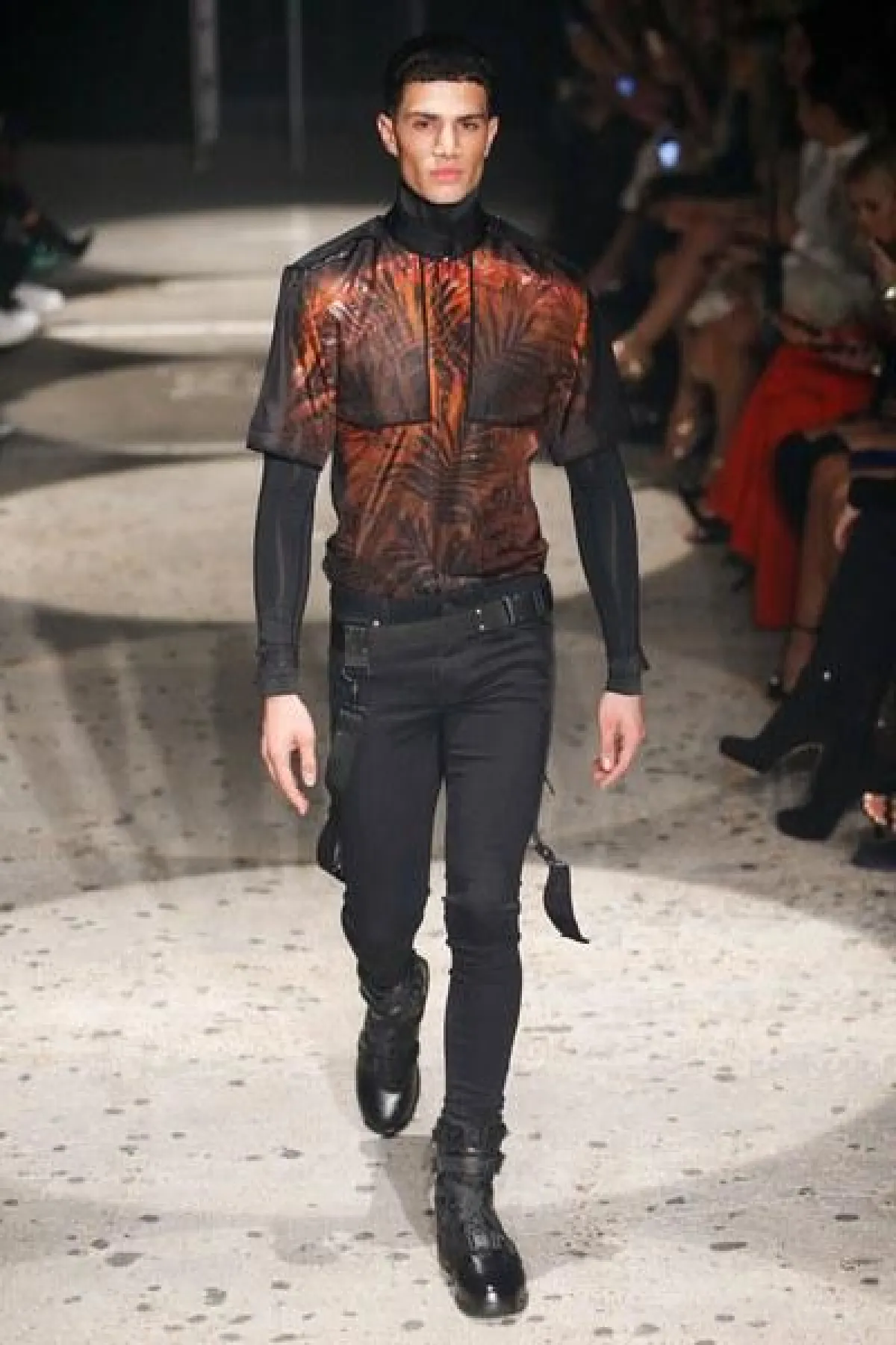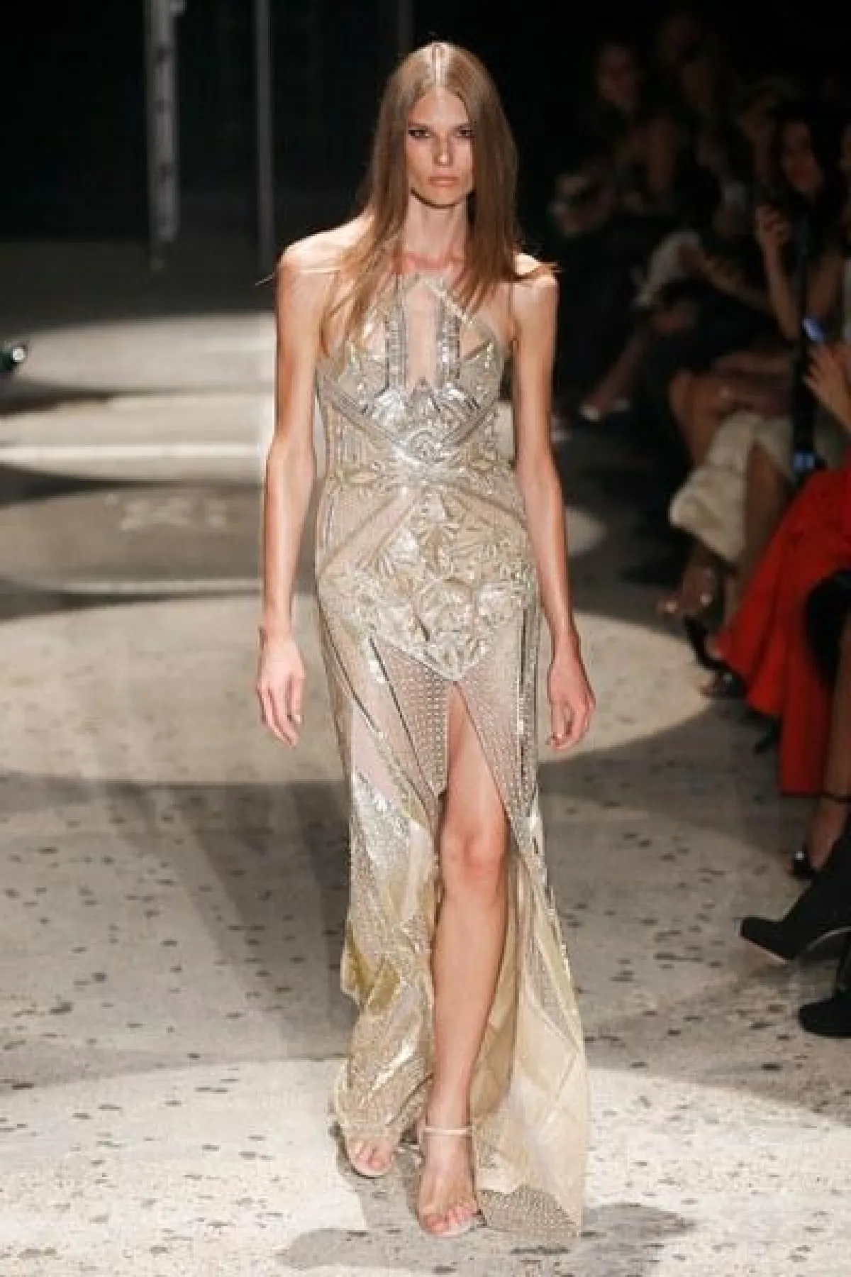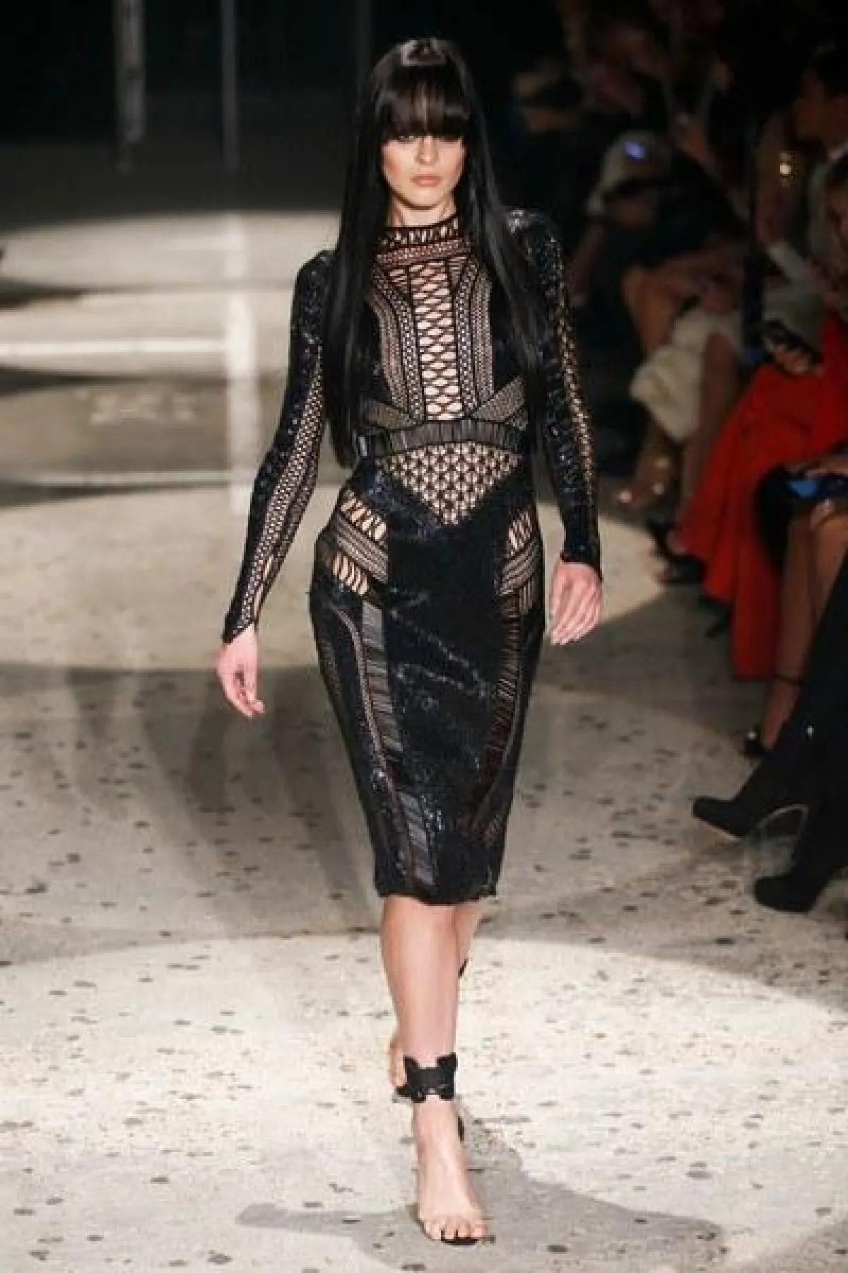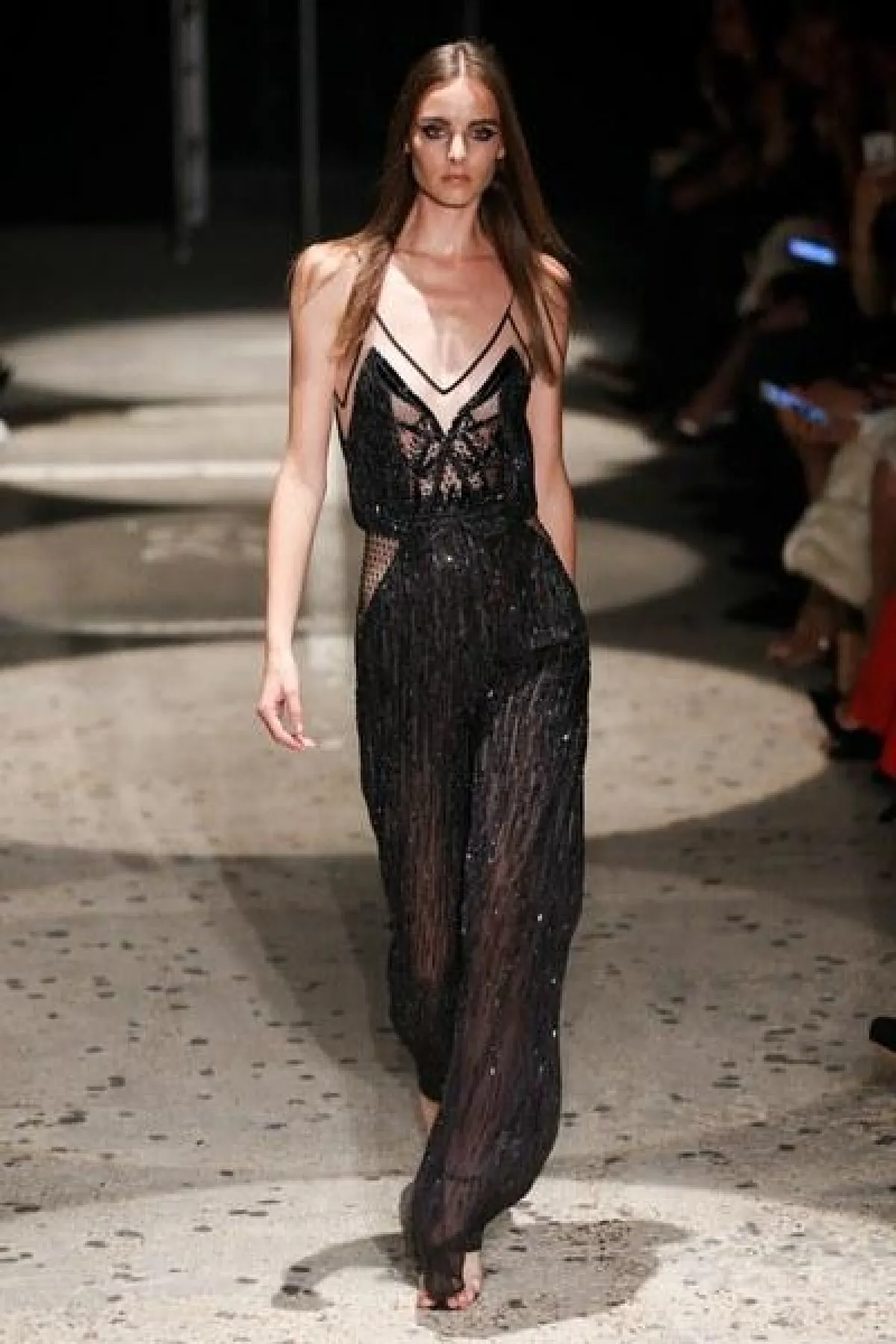 وتنوعت الأقمشة بين التول والكوبير، والدانتيل والشفاف، مع الستراس الناعم، كما ركّز ماكدونالد على الفتحة عند الفخذ والأكمام المخرّمة في أغلب فساتينه.