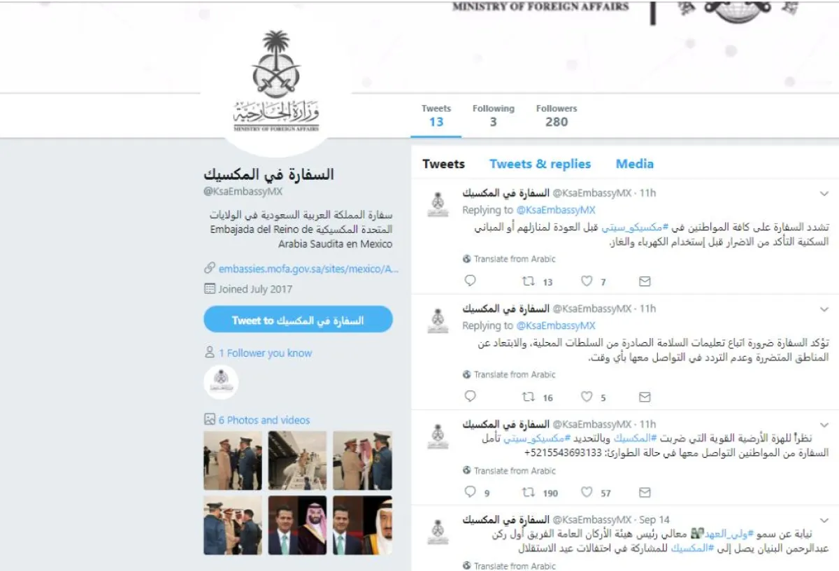 بعد الهزة الأرضية القوية التي ضربت المكسيك، وتحديداً العاصمة مكسيكو سيتي، نشرت السفارة السعودية في المكسيك رقماً ليتواصل السعوديون عبره معها في حالة الطوارئ، وهو 5215543693133+.