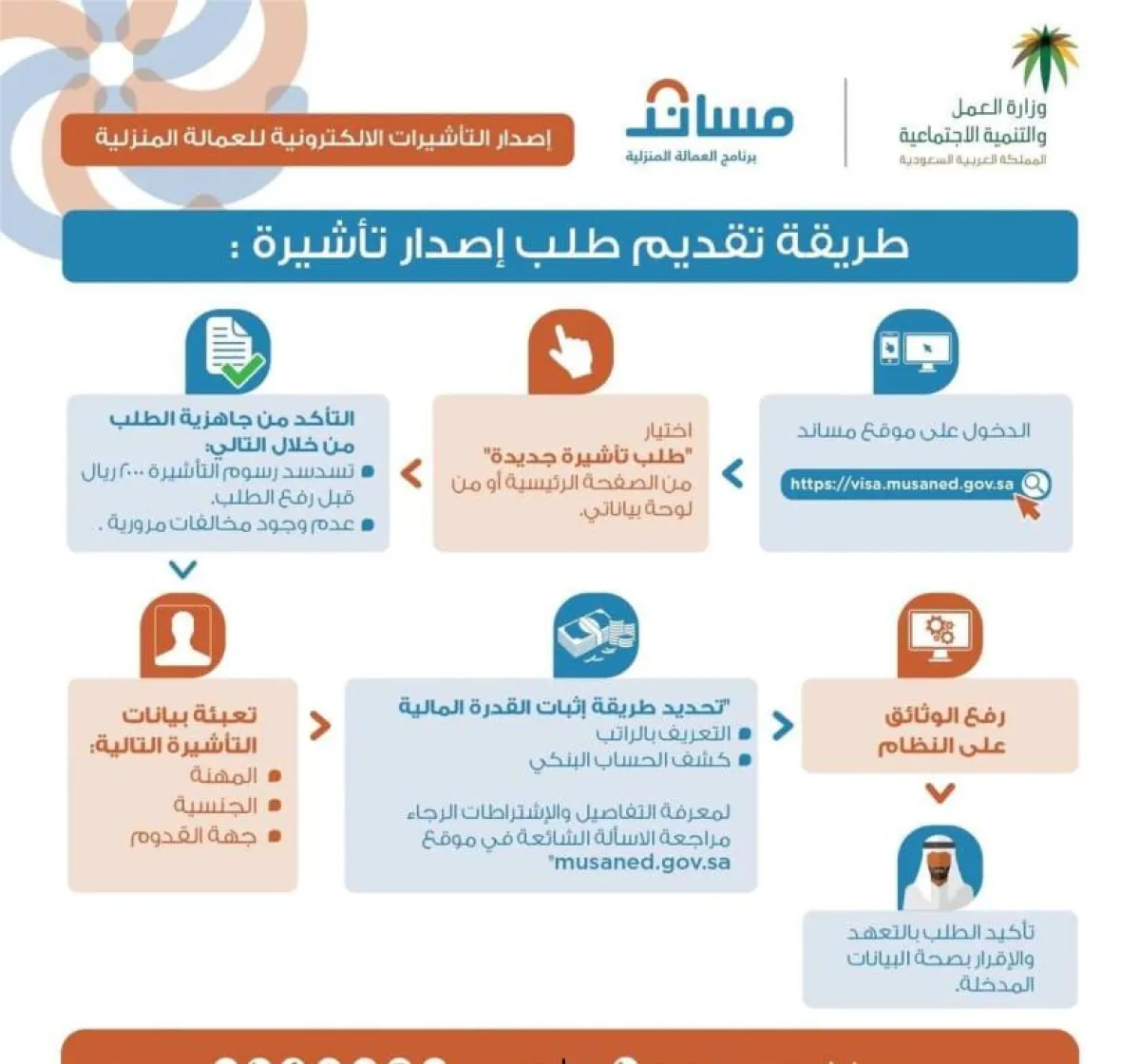 أعلنت وزارة العمل والتنمية الاجتماعية السعودية أمس الثلاثاء عن بدء تقديم خدمة إصدار التأشيرات المعفاة من الرسوم للأشخاص ذوي الإعاقة إلكترونياً، وذلك عبر البوابة الإلكترونية لبرنامج العمالة المنزلية "مساند" اعتباراً من اليوم الأربعاء.