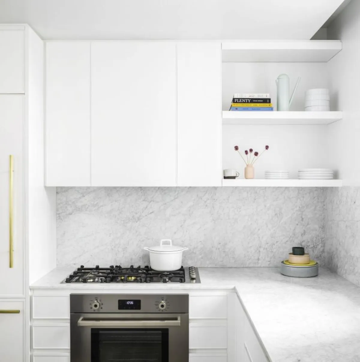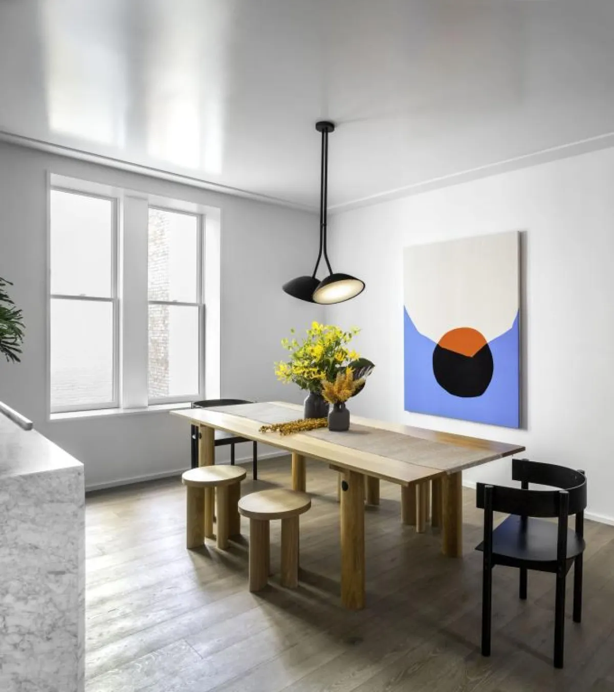 يضيء الأبيض المطبخ، حيث خزائن الخشب وأسطح الرخام. وتضفي المقابض العصرية المطلية بالنحاس المذهب فخامة إضافية في الأرجاء. ومن الملاحظ حضور لمسات صناعية في المساحة العصرية، من خلال استخدام الخشب الفاتح ذي العروق البارزة فيها، بالإضافة إلى بعض التفاصيل المتمثّلة بتصاميم وحدات الإضاءة المبهرة. ومن اللافت خطوط التصاميم الهندسية الواضحة، إلّا أنّ الألوان تكسر من حدة المشهد.