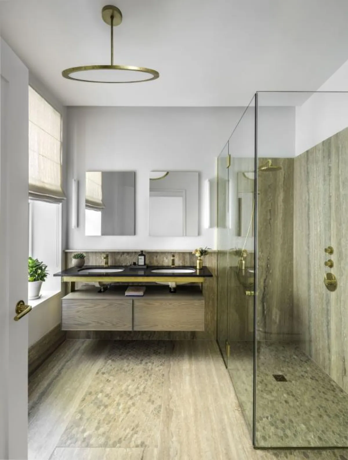 وفي الحمّام، يبرز عامل الفخامة والرفاه، من خلال المواد الشفافة المستخدمة التي تضفي فسحة على المساحة، والخامات الثقيلة البارزة على الأسطح.