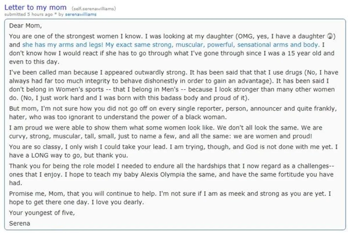 كتبت ويليامز في رسالتها: "أمي العزيزة، كنت واحدة من أقوى النساء أنا أعلم، كنت أنظر إلى ابنتي، يا إلهي أنا أملك طفلة ولديها يداي وقدماي، تملك نفس قوتي وعضلاتي وطاقتي والذراعان المثيران والجسد، أنا لا أدري كيف يكون رد فعلي إذا مرت بما مررت به منذ أن كنت في الـ 15 حتى هذا اليوم".