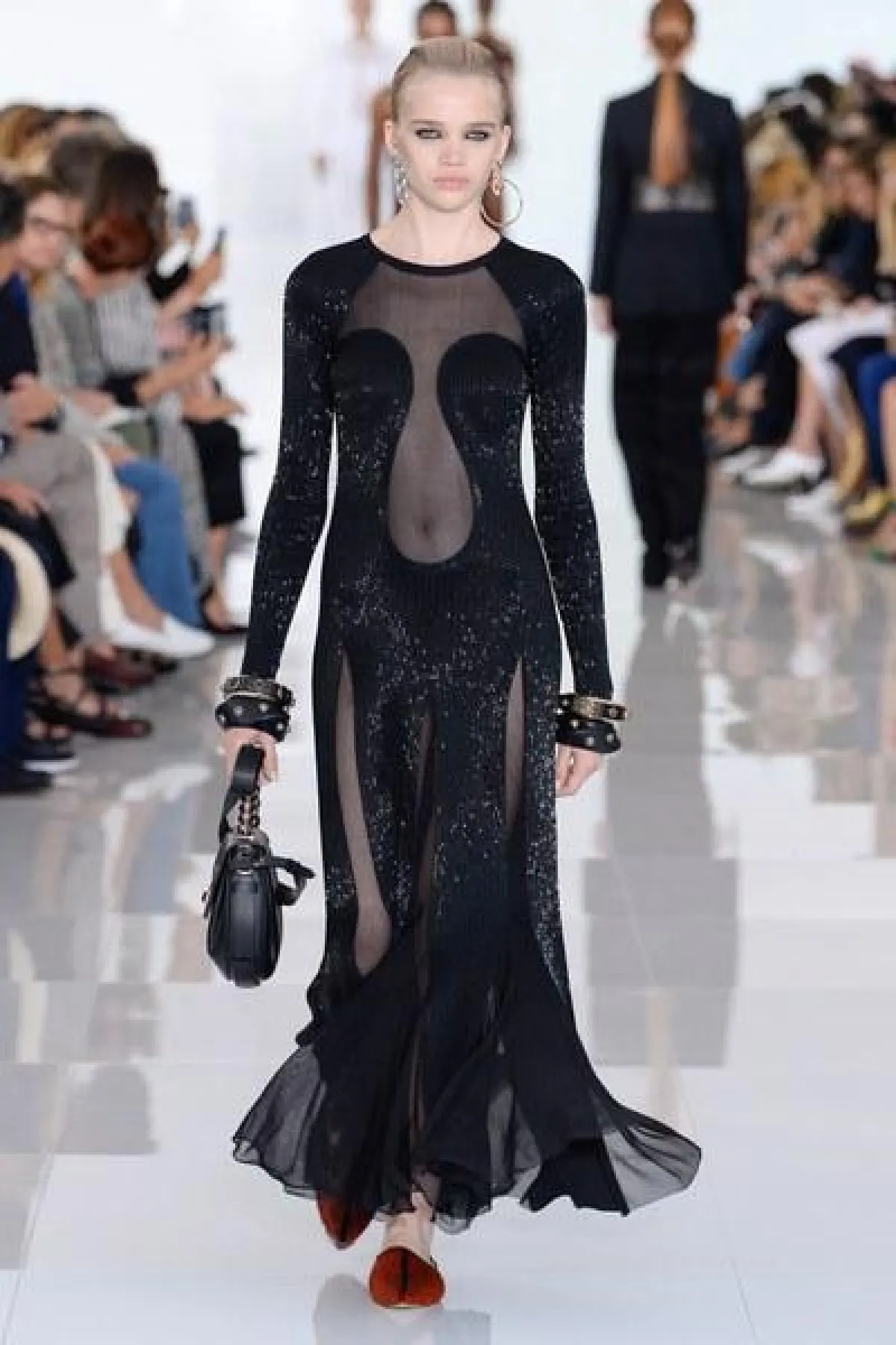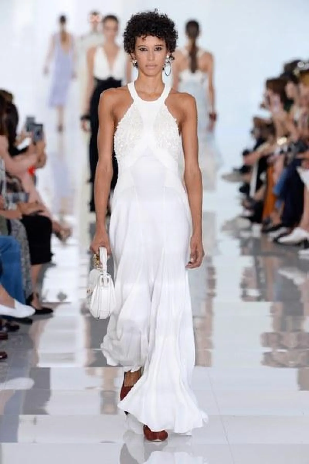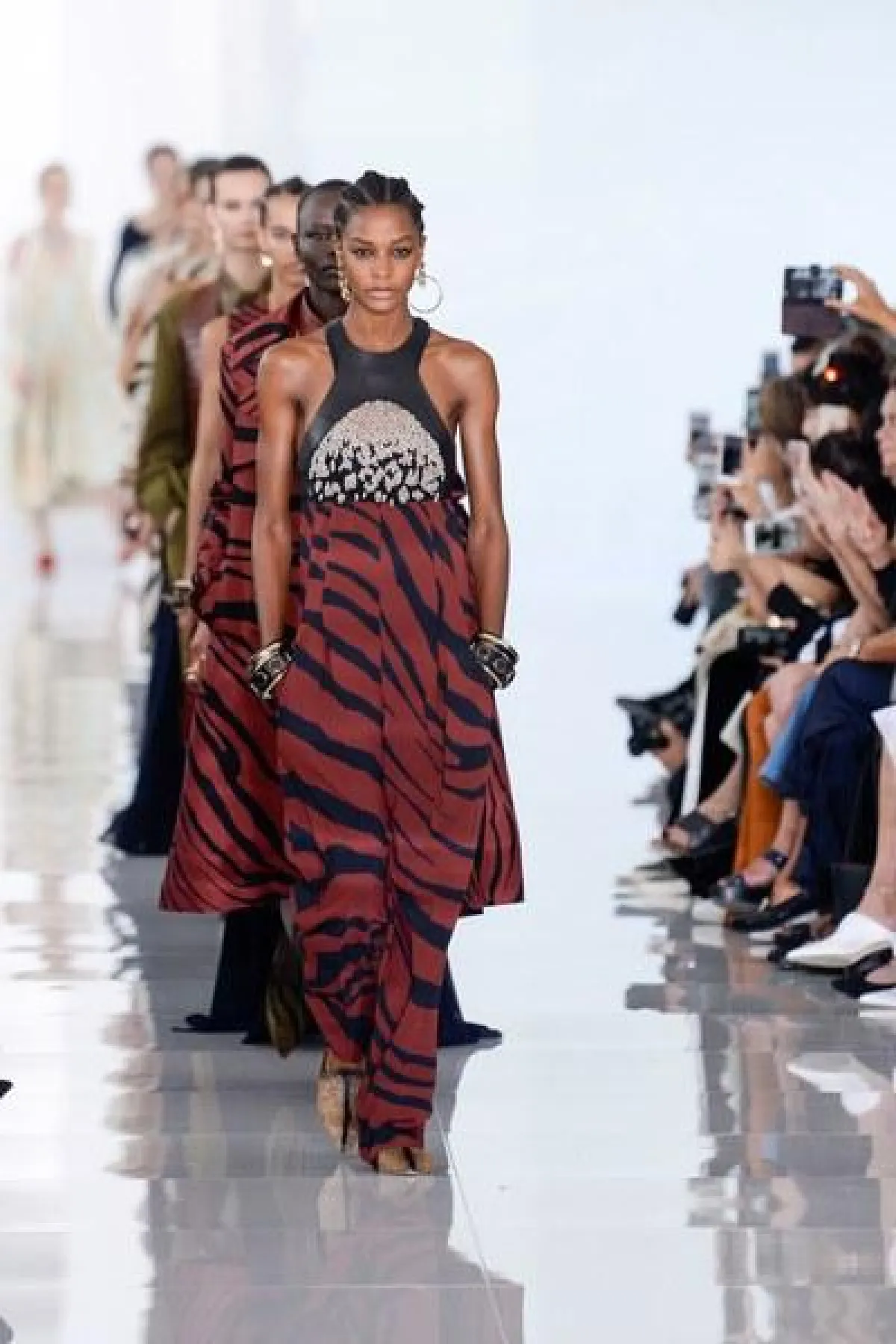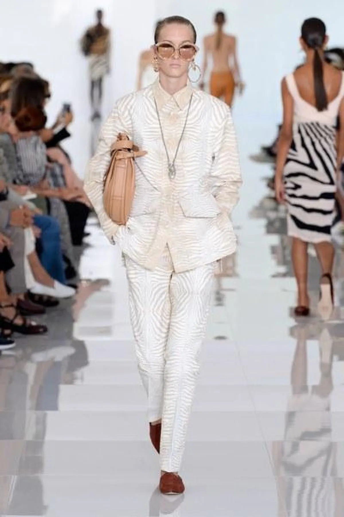 وتنوعت التصاميم بين الفساتين والجمبسوت المصمم من أقمشة الحرير والشيفون والشفاف، أما الألوان فتأرجحت بين الأبيض والأسود والبني القاتم.