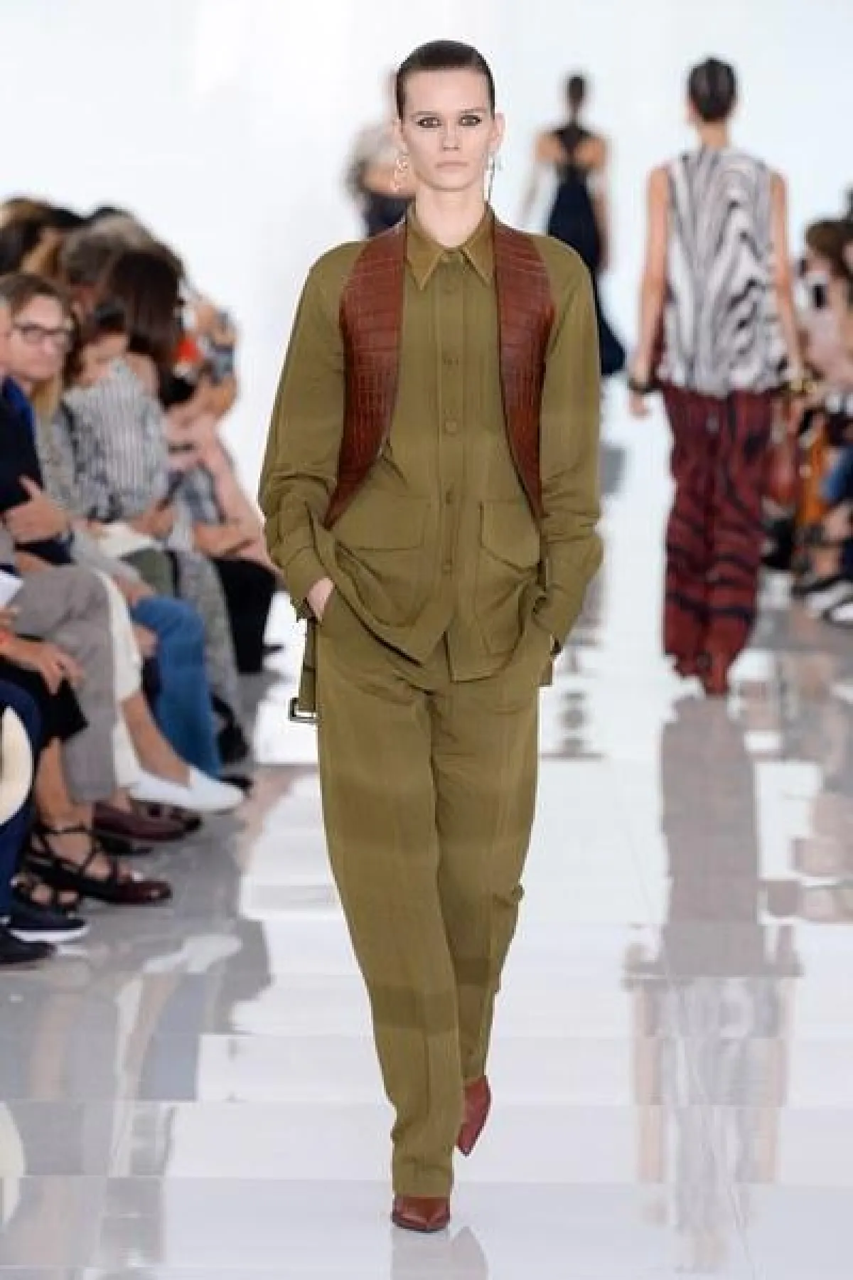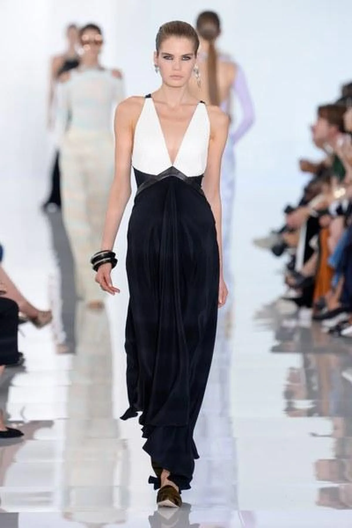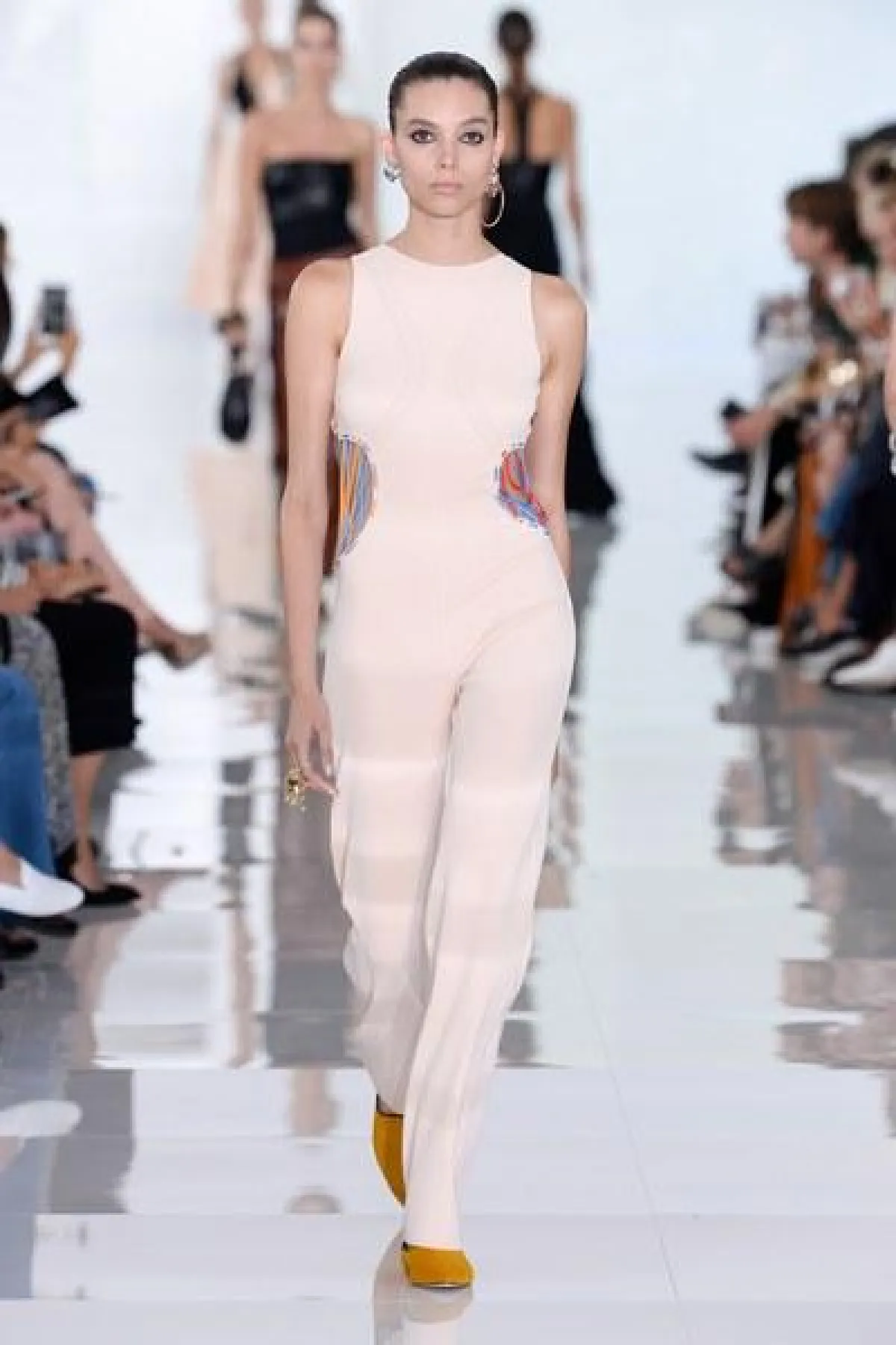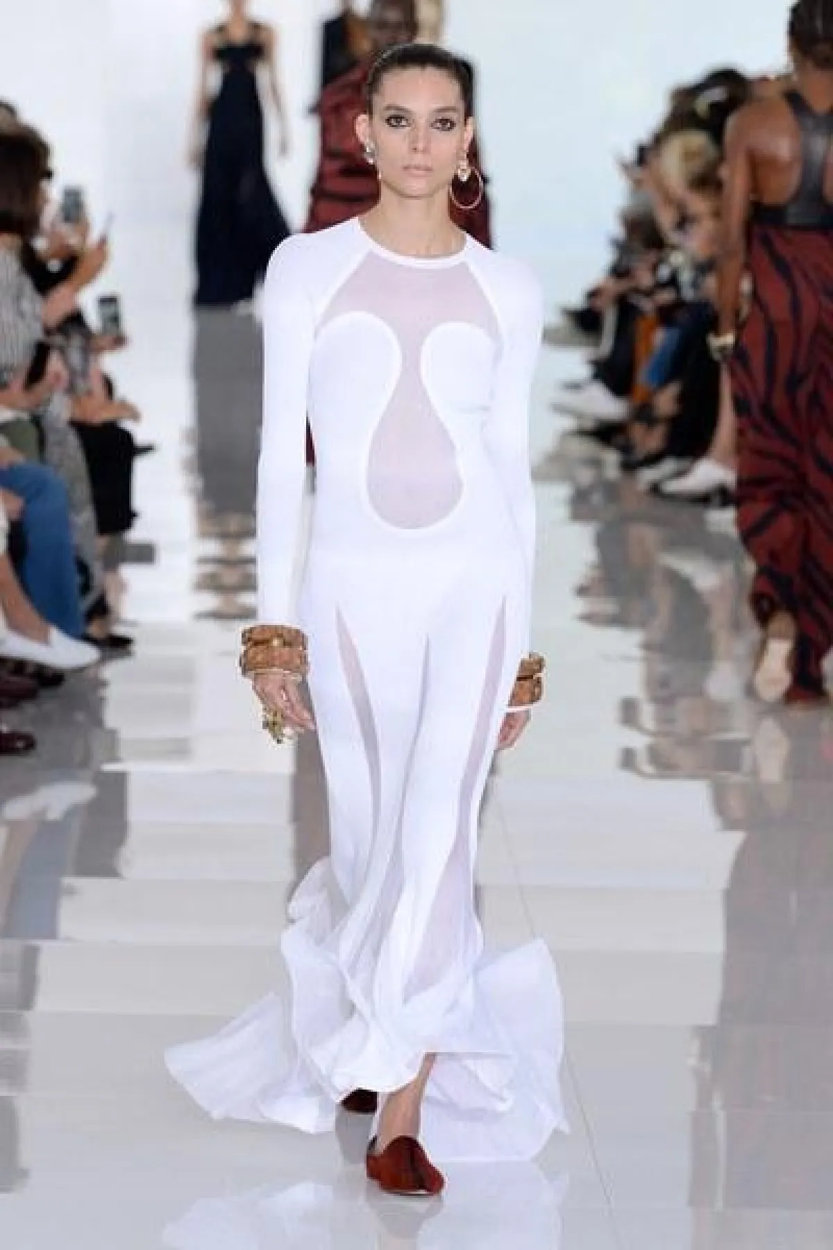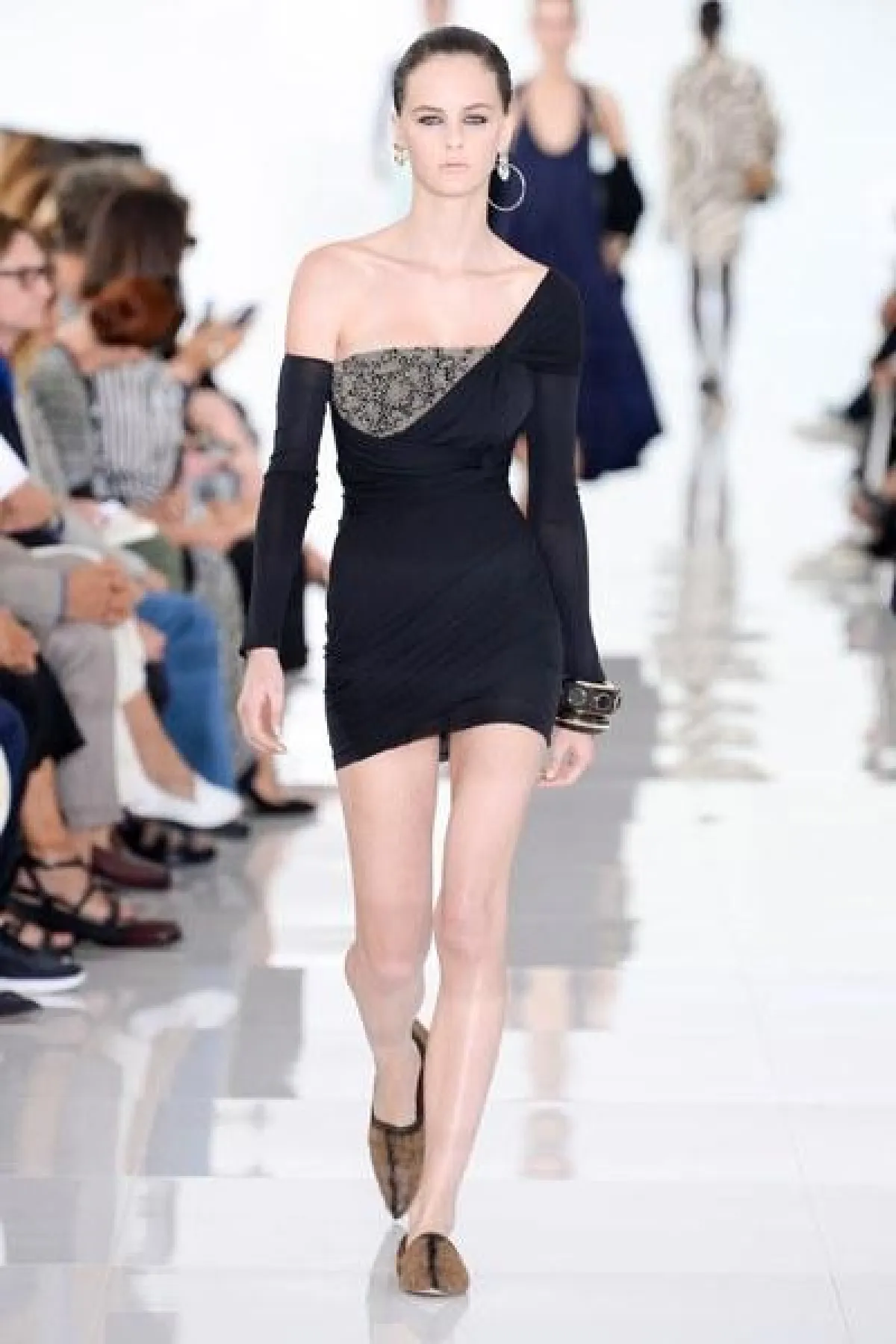 وتنوعت التصاميم بين الفساتين والجمبسوت المصمم من أقمشة الحرير والشيفون والشفاف، أما الألوان فتأرجحت بين الأبيض والأسود والبني القاتم.