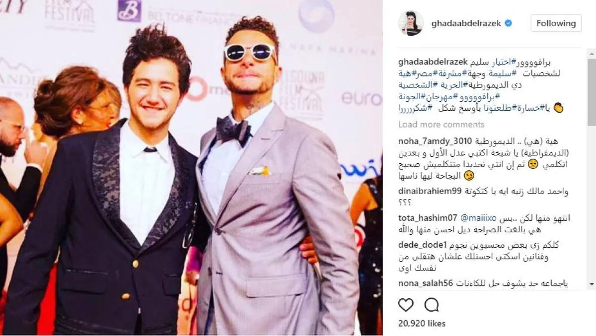 غادة لم تتواجد ضمن نجوم الدورة الأولى لمهرجان الجونة السينمائي الدولي، واستخدمت حسابها على موقع إنستقرام للتعليق أوّلاً بأوّل على أحداث حفل الافتتاح، وفور ظهور النجم أحمد الفيشاوي وإطلاقه وصفاً خارجاً قبل العرض الأول لفيلمه "الشيخ جاكسون" أعادت غادة نشر صورة له برفقة الفنان أحمد مالك وعلقت عليها قائلة: برافوووور اختيار سليم لشخصيات سليمة وجهة مشرفة مصر هية دي الديمورطية الحرية الشخصية برافووووو مهرجان الجونة يا خسارة طلعتونا بأوسخ شكل شكرررررا !!
