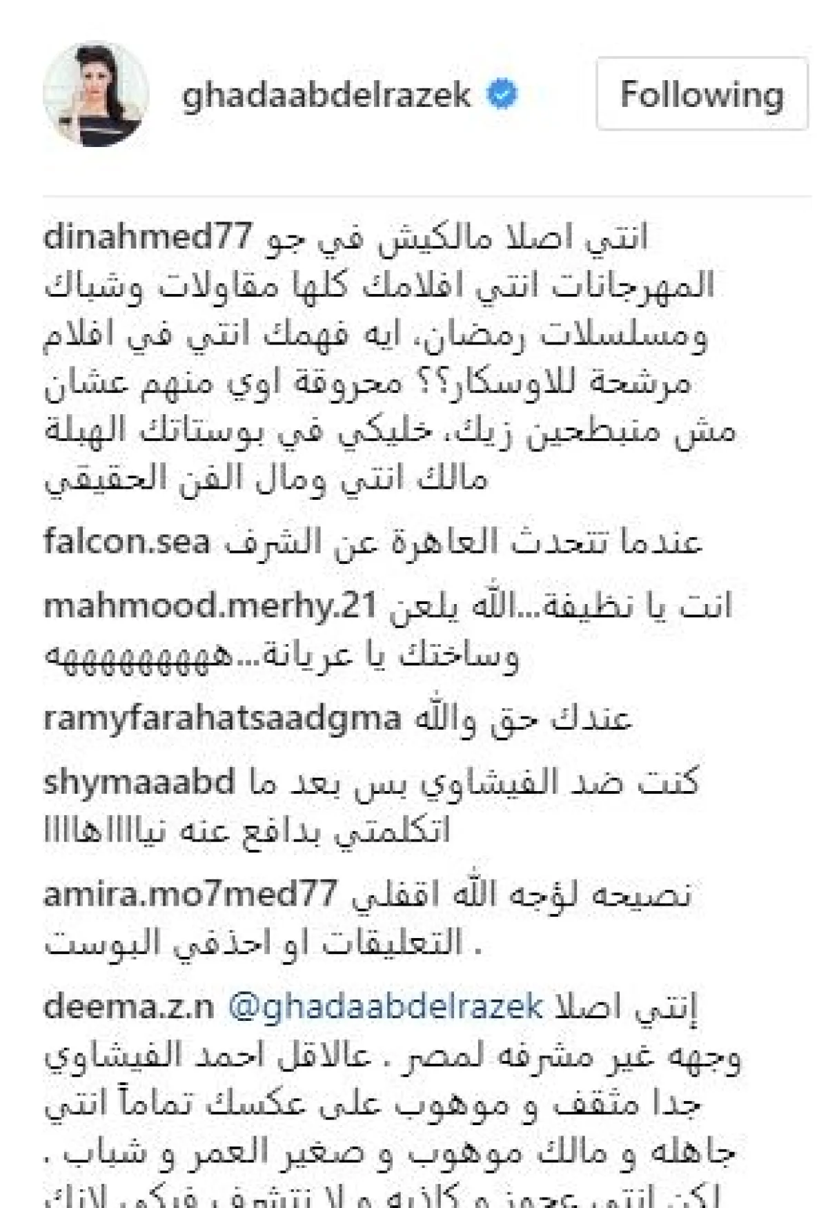 المتابعون لحساب غادة خالفوها الرأي وطالبوها بتحسين قدرتها على الكتابة، حيث قالت الديمورطية وتقصد الديموقراطية، كما رفضوا توجيه الإهانة لأحمد مالك لأنه ليس طرفاً في الأزمة، وأكد أكثر من متابع أنّ غادة تحديداً ليس لها أن تعلّق على الألفاظ الخارجة والمواقف المحرجة، وقالت متابعة تدعى دينا:" انتي اصلا مالكيش في جو المهرجانات انتي افلامك كلها مقاولات وشباك ومسلسلات رمضان، ايه فهمك انتي في افلام مرشحة للاوسكار؟؟ محروقة اوي منهم عشان مش منبطحين زيك، خليكي في بوستاتك الهبلة مالك انتي ومال الفن الحقيقي.."
