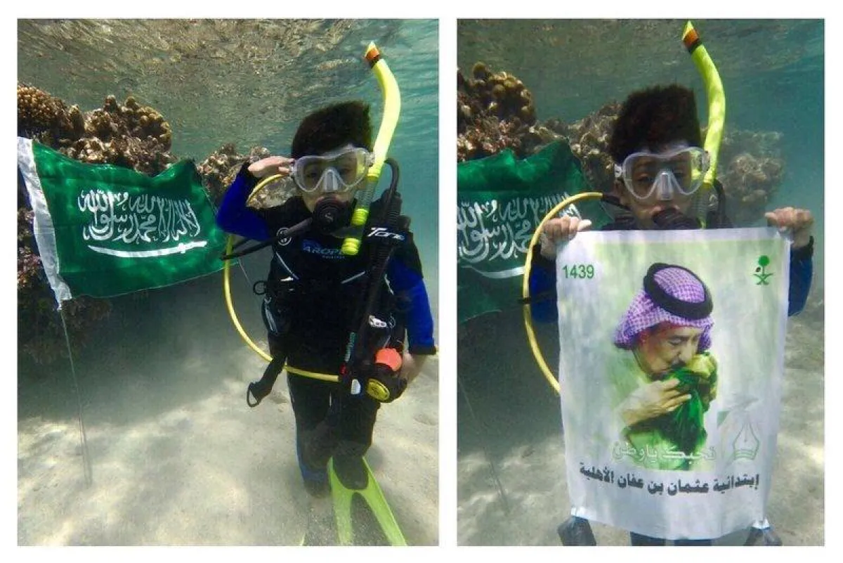 احتفل الطفل بتال عبد الرحمن الأحمري، الذي حصد لقب أصغر غواص في العالم قبل عامين بعمر الخمس سنوات، بـ اليوم الوطني السابع والثمانين للمملكة العربية السعودية، على طريقته الخاصة، حيث غاص في أعماق البحر الأحمر في منطقة تبوك، رافعاً صورة قائد الوطن خادم الحرمين الشريفين الملك سلمان بن عبد العزيز آل سعود.