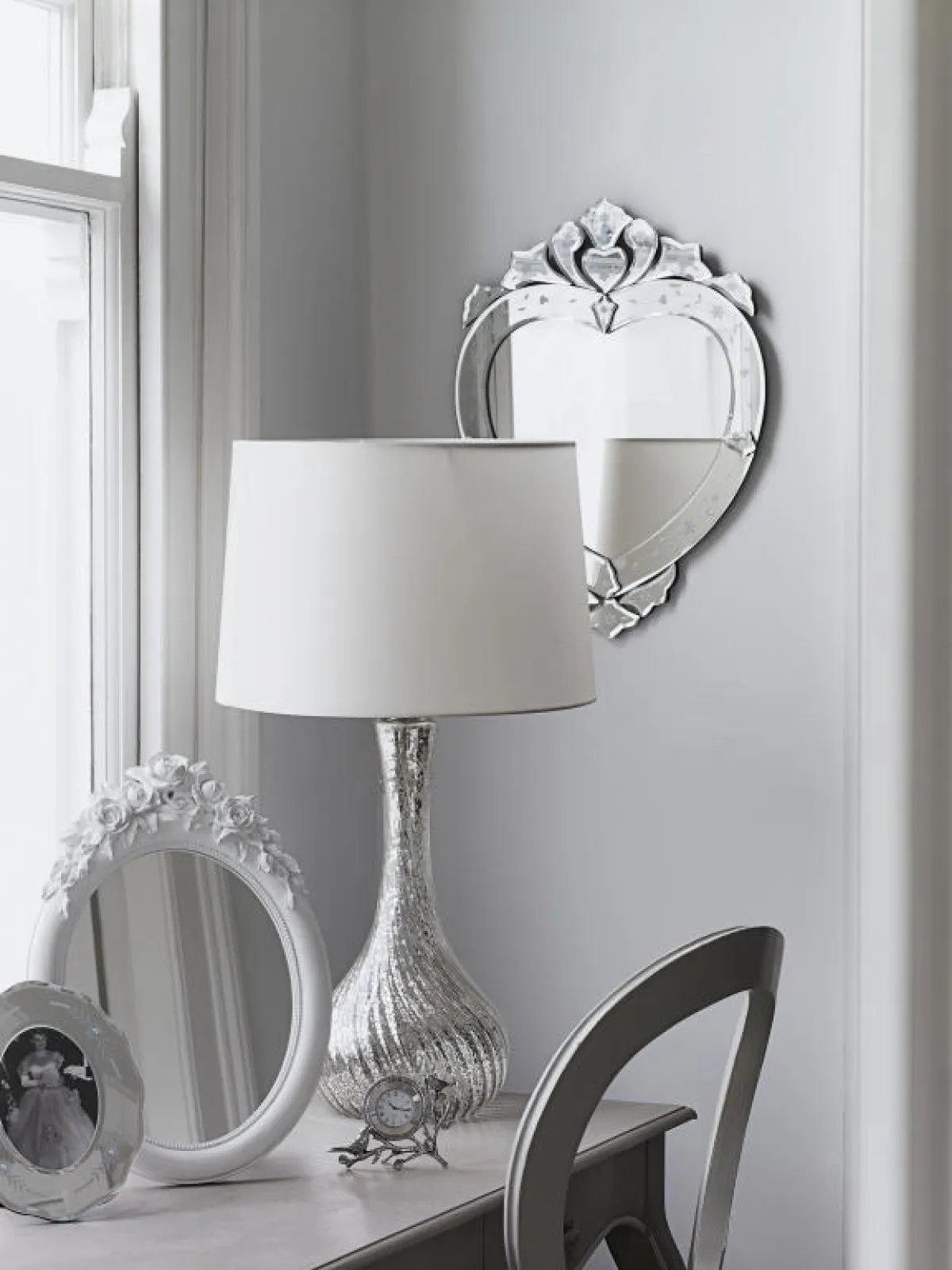 حوار يجمع بين الكلاسيكية والمعاصرة في هذه الزاوية التي تضمّ أريكة ذات خطوط ثلاينية ومنضدة بلمسات حديثة ومرآة تحاكي الأسلوبين.