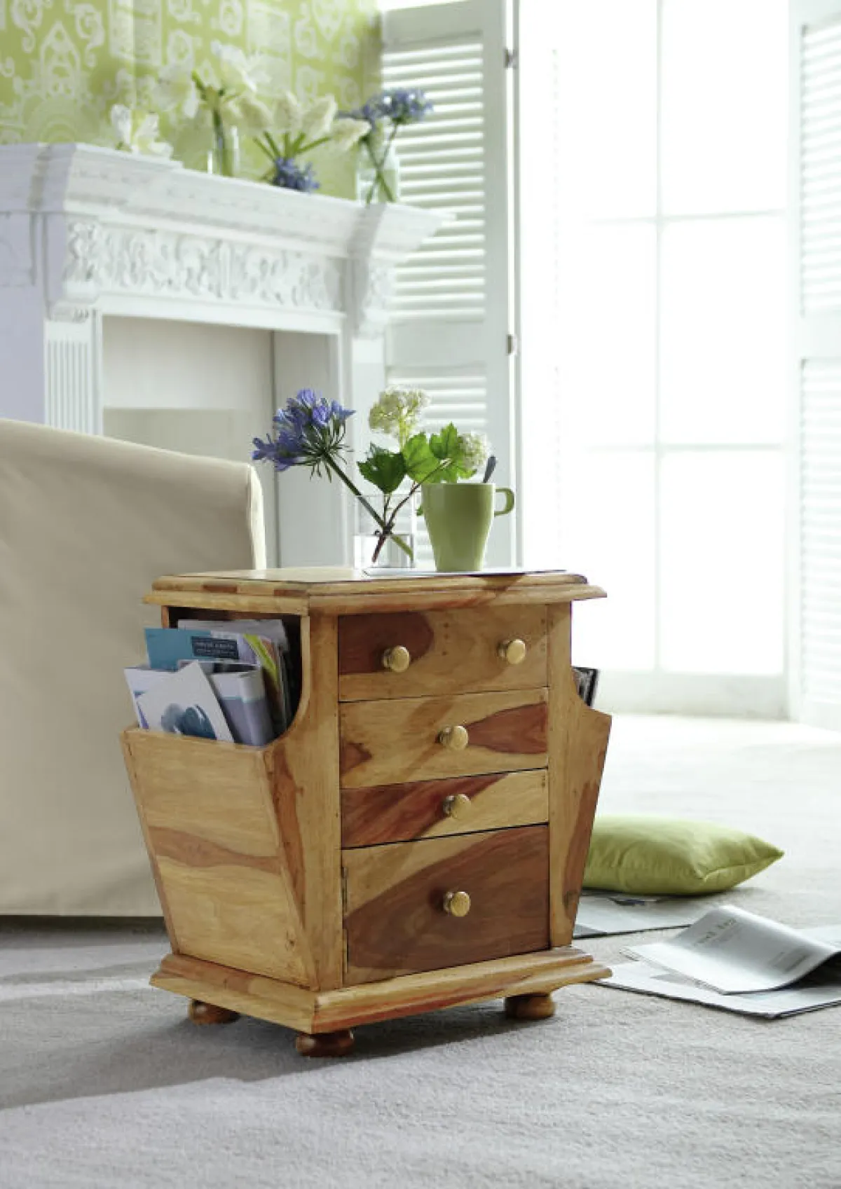 ركن للقراءة والإسترخاء: الأريكة ثلاثينية الخطوط ومغلّفة بقماش منقوش بالمربعات الخضر والزرق والرمادية، ويتقدّمها مقعد صغير لإراحة القدمين مغلّف بالقماش عينه. وتفترش الأرضيّة سجّادة خضراء، تنسجم مع بقيّة قطع الأثاث.