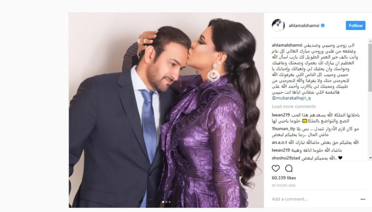 نشرت الفنانة الإماراتية أحلام صورة لها مع زوجها مبارك الهاجري وهي تقبّل رأسه وتبارك له بعيد ميلاده، داعيةً أن يطيل الله في عمره، ويبقيه بجانبها دوماً.