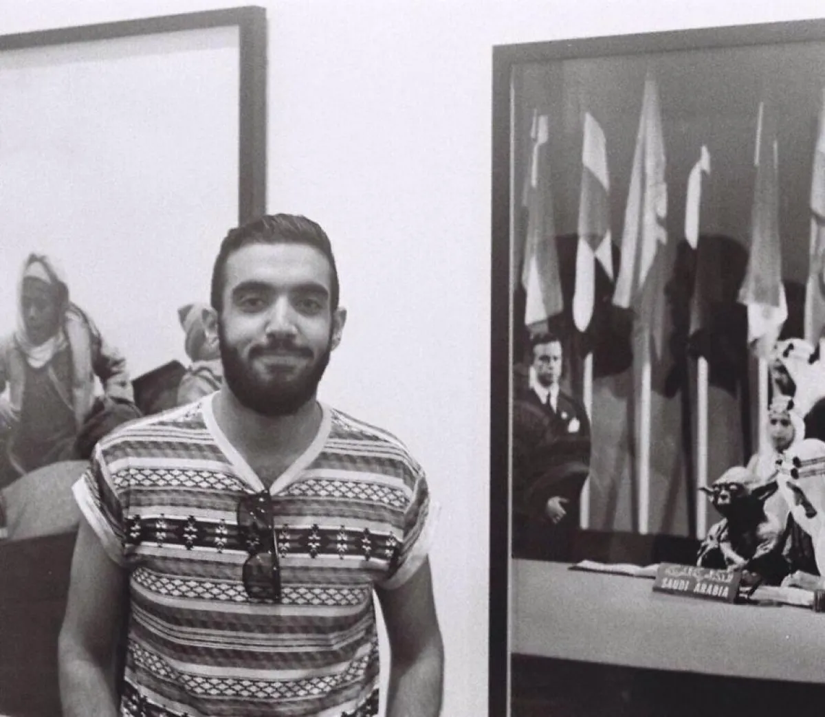 وتابع: "الصورة المذكورة كانت ضمن سلسلة من الصور تضم (5) صور جاءتني الفكرة عندما كنت أجمع صور من أرشيف الأمم المتحدة والتايمز، وحينها شاهدت صورة واحدة للرئيس المصري السابق أنور السادات وبجانبه شخصيات ديزني لاند. كانت مختلفة عن باقي الصور التي كانت أغلبها تعبّر عن الحزن والصراع وعن الحروب واللاجئين. من تلك الصورة راودتني فكرة الدمج بين الواقع والخيال والثقافة المنتشرة في الأفلام من شخصيات ذو شعببة كبرى لنصنع جسراً بين الحاضر والمستقبل بصورة مميزة وغير نمطية بإضافة الشخصيات الخيالية إلى الصور الحقيقية لتشابههم في بعض الصفات والسمات".
