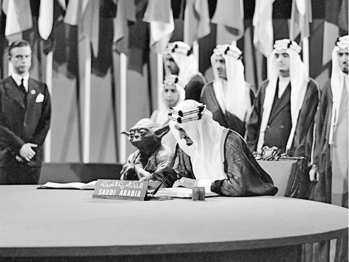 الخطأ أكيد كان غير مقصوداً من واضعها في الكتاب الدراسي، أنا وضعت نفسي مكانه وبحثت على جوجل ظهرت صورتي قبل الصورة الأصلية وبجودة عالية ولأنها بالأبيض والأسود، فأتوقع أنه حدث سوء انتباه لا أكثر، وغير مقصود لوجود الشخصية يودا بجانب الملك فيصل".