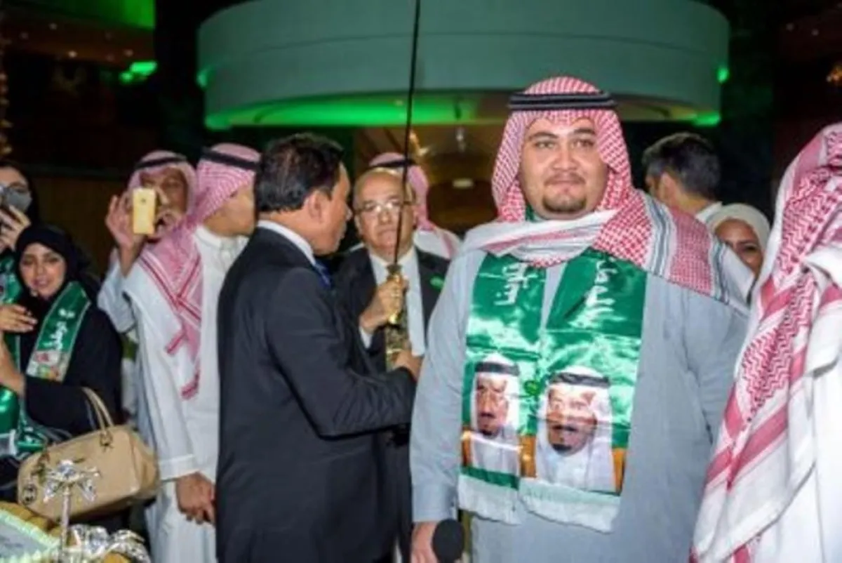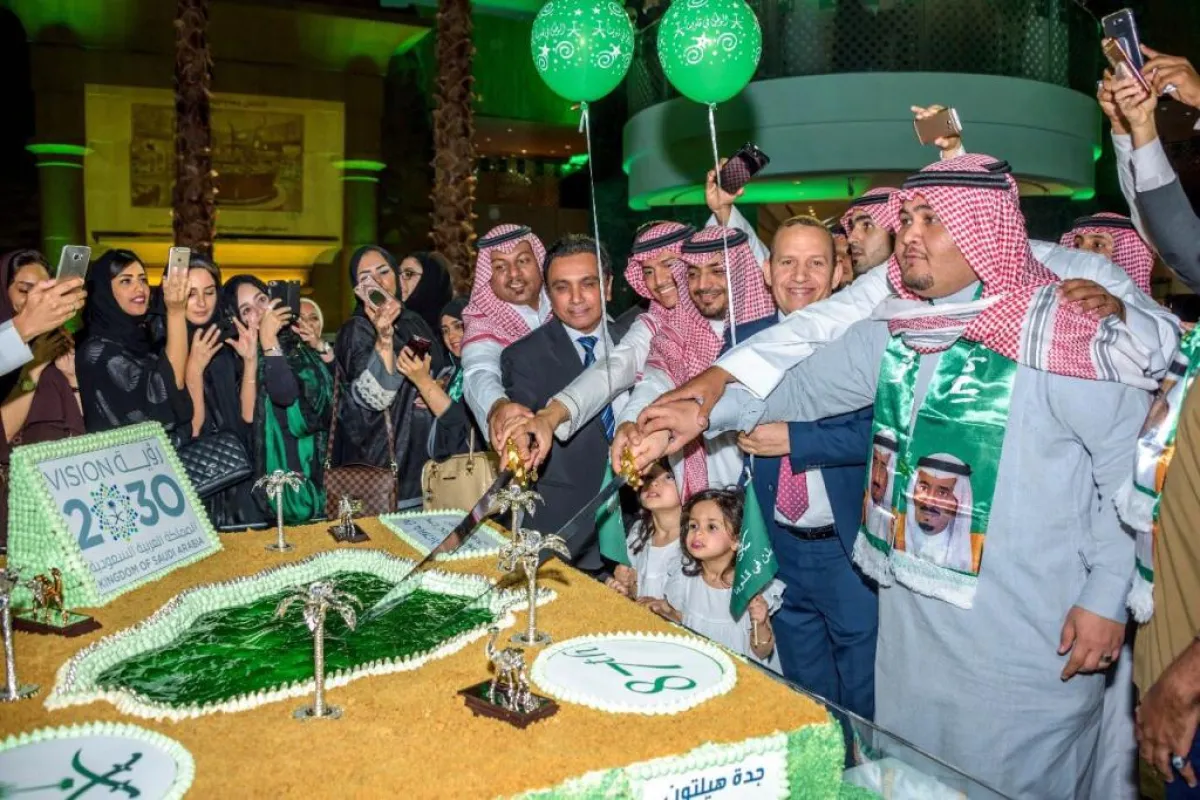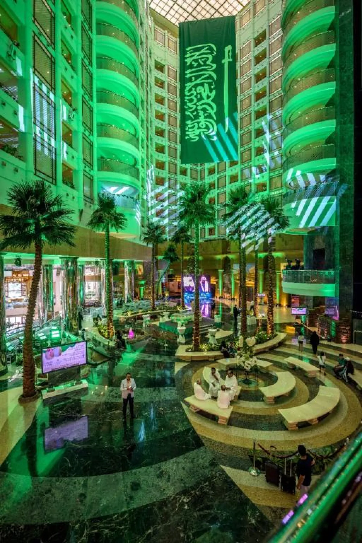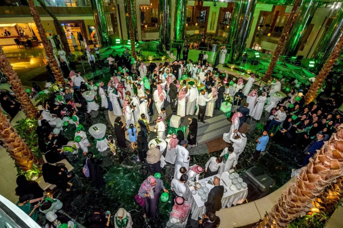 وقد عرضت صور خادم الحرمين الشريفين والأمير محمد بن سلمان في الشاشات الكبيرة في البهو الكبير؛ كما اتشح الفندقان من الداخل والخارج باللون الأخضر، ورفعت أعلام المملكة في أرجاء الفندق، كما تساقطت البالونات من أعلى الفندق على الحضور، مع ترديد النشيد الوطني من قبل الحاضرين، وقد تم تقطيع الكيكة التي مثلت في تصميمها خريطة المملكة العربية السعودية، وأبرزت رؤية 2030 وسط أجواء من البهجة والفخر بهذا الوطن.