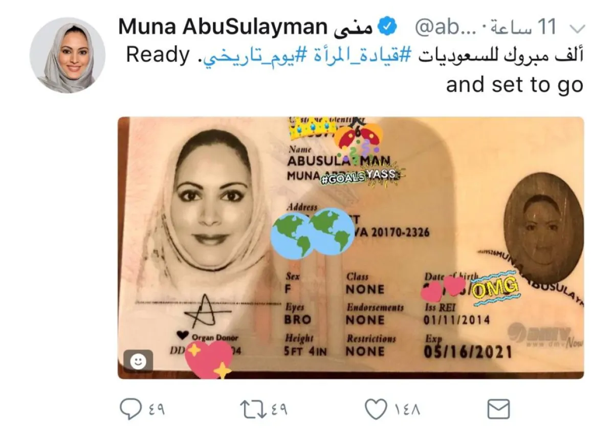 أما الإعلامية منى أبو سليمان فلقد أرفقت صورة لرخصة السياقة الأجنبية الخاصة بها وكتب معلقة عليها ألف مبروك لكل السعوديات، كما أعادت تغريد عدد من التغريدات من حسابات أخرى تؤيد قرار الملك سلمان بن عبدالعزيز فيما يخص السماح للمرأة السعودية بقيادة السيارة.