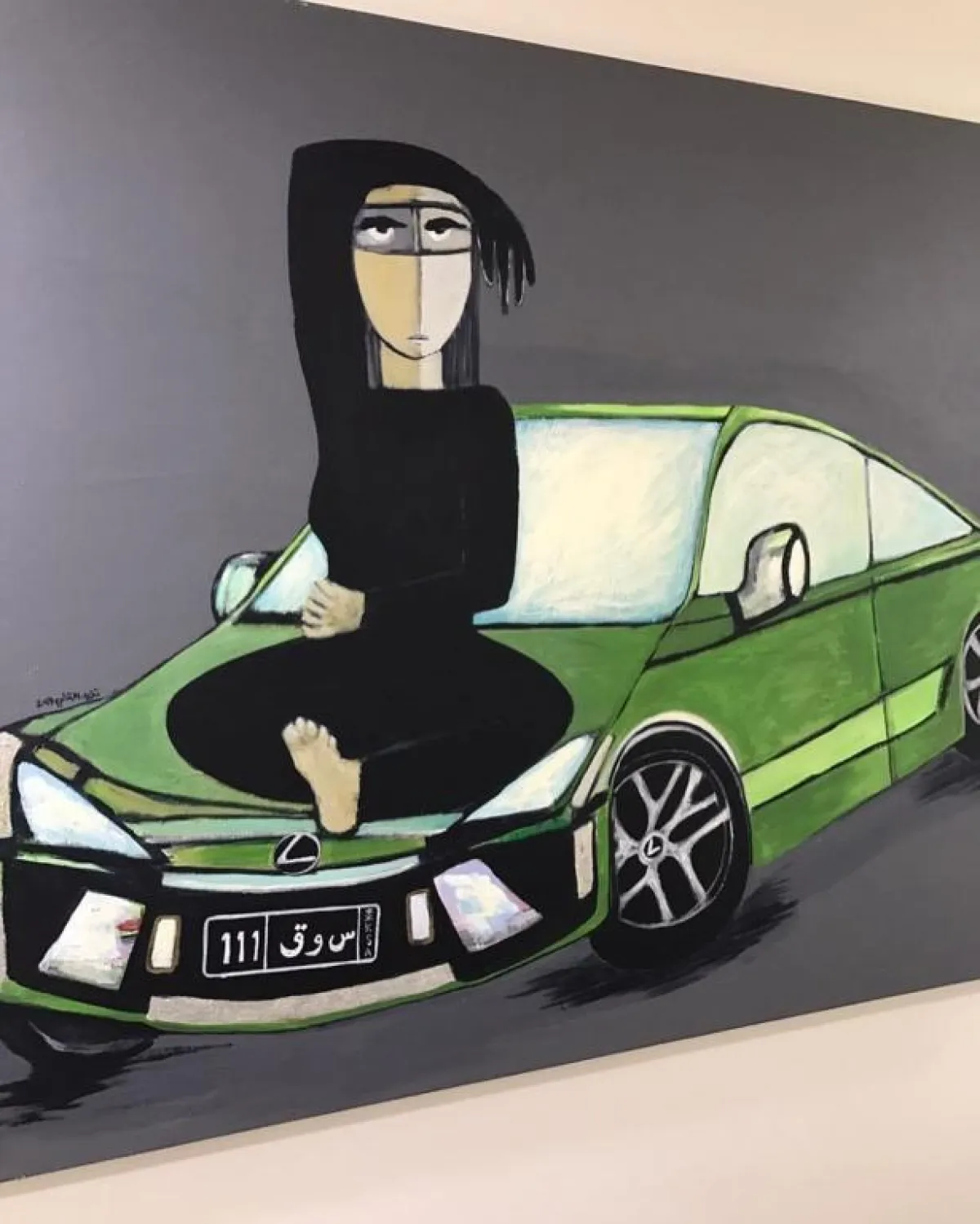 وتظهر في اللوحة، التي قامت بنشرها ريهانا، سيارة من نوع لكزس، تجلس عليها امرأة سعودية محجبة، تبدو عليها الرغبة في القيادة، وسبب رسمها رغبة الفنانة التشكيلية في أن تقود المرأة في بلادها السيارة.