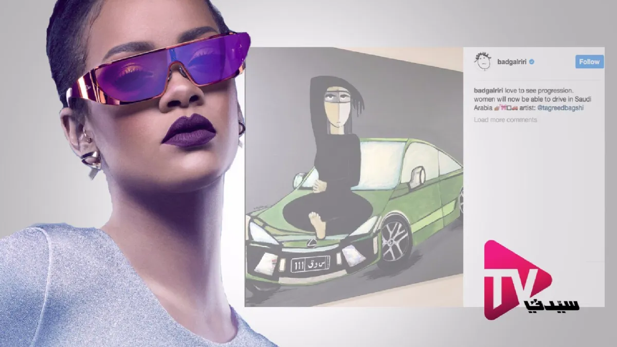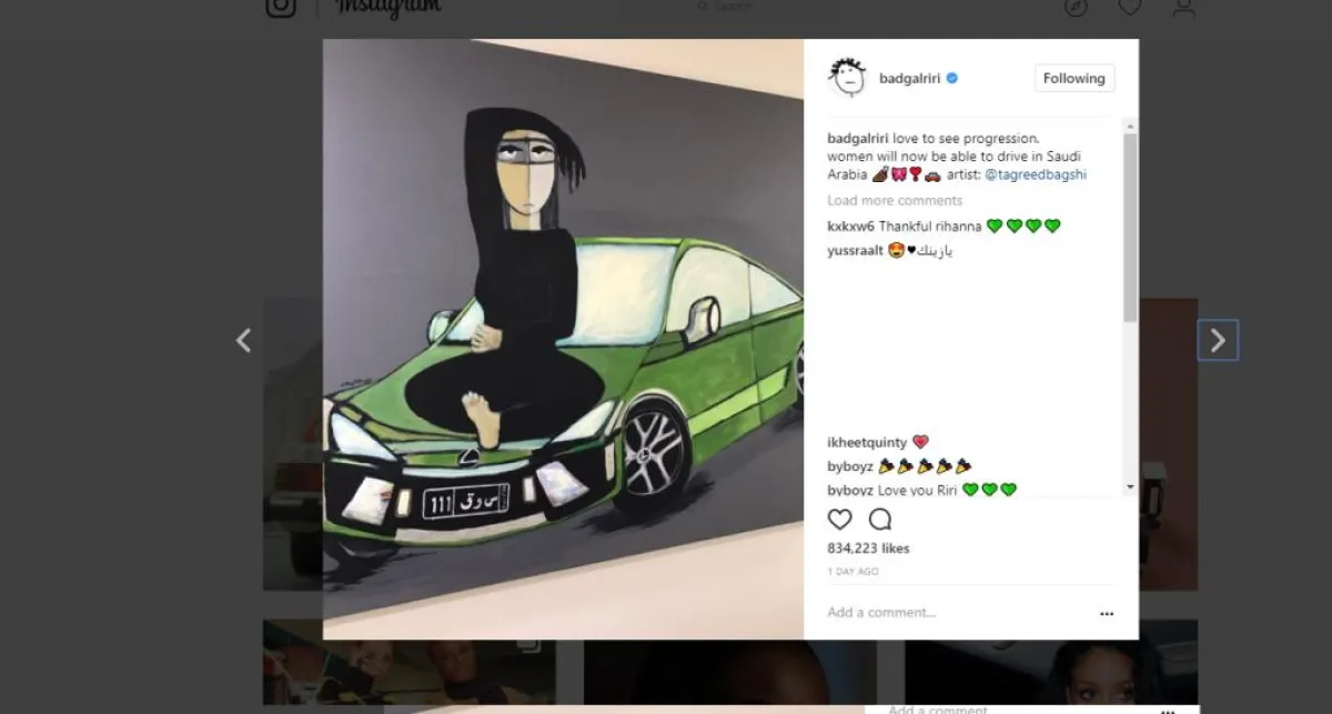 وكتبت ريهانا عبر حسابها في "انستقرام"، إلى جانب الصورة التي نشرتها: "أحببت رؤية التقدم... النساء الآن سيكنَّ قادرات على قيادة السيارات في السعودية". وأشارت إلى حساب الفنانة التشكيلية تغريد بقشي.