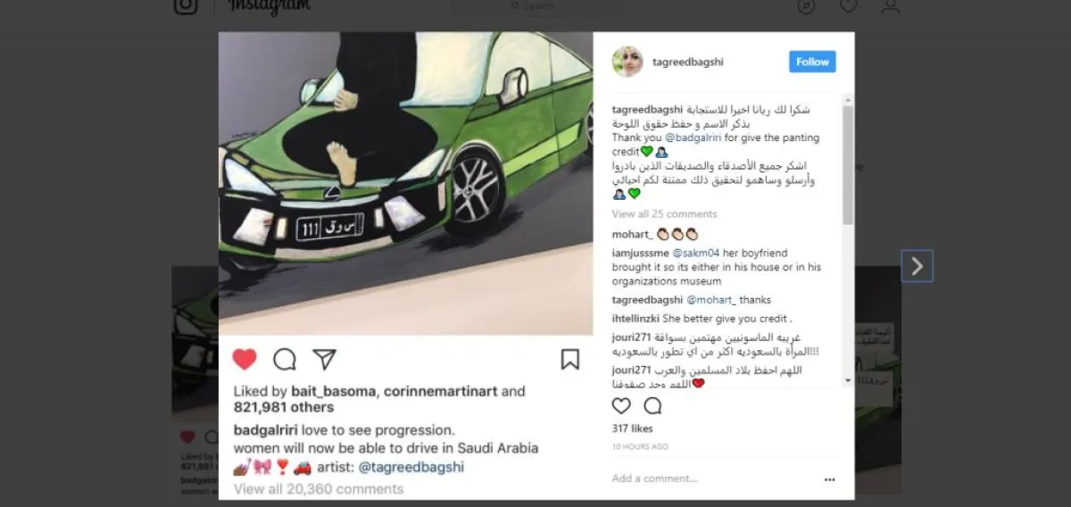نشرت المغنية الأمريكية المشهورة ريهانا صورة للوحة، رسمتها الفنانة التشكيلية تغريد بقشي، وباركت للسعوديات بقرار السماح لهن بقيادة السيارة في بلادهن.