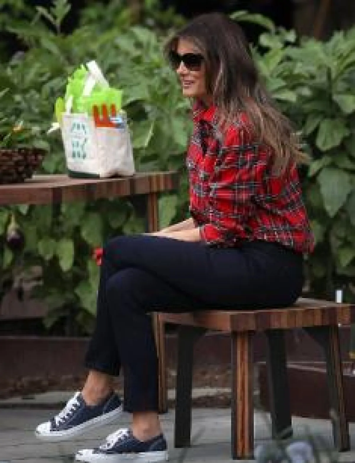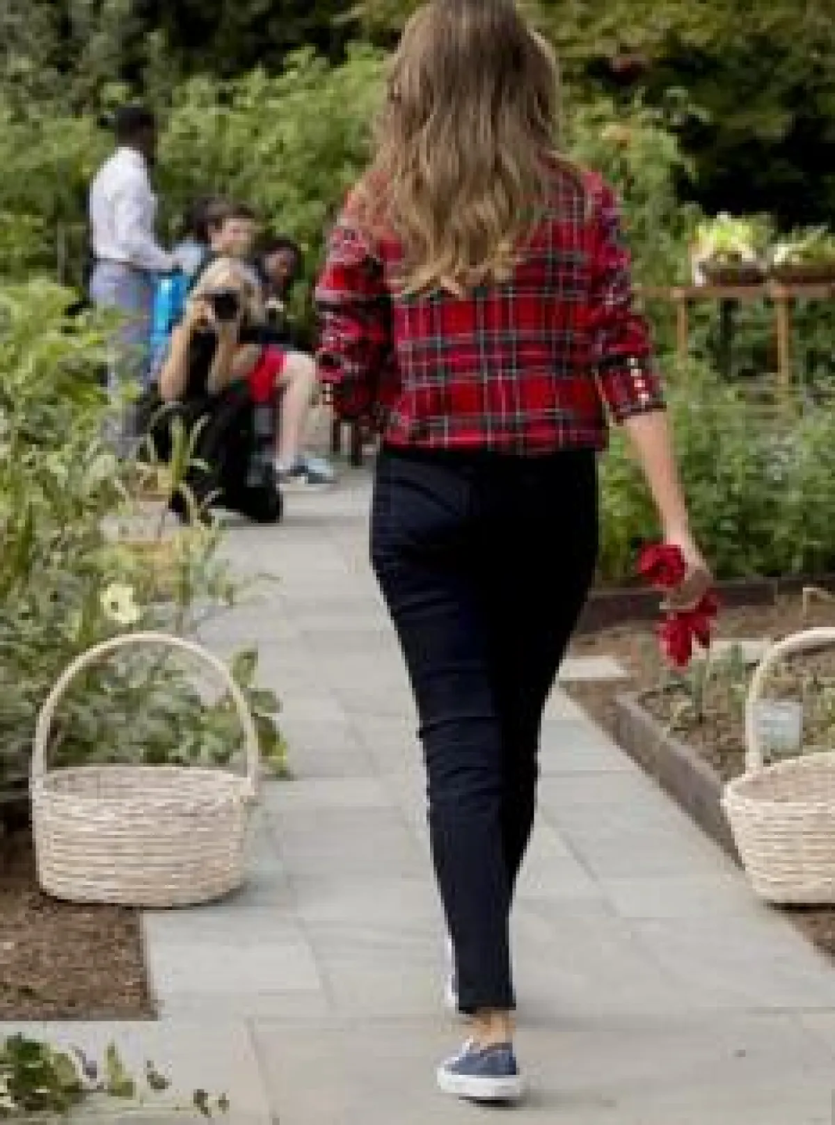 وكعادتها، لم تتخل السيدة الأولى عن أناقتها المشهورة، حيث ارتدت قميصاً أحمر وسروال جينز وحذاء رياضياً، بالإضافة إلى قفازات حمراء اللون.