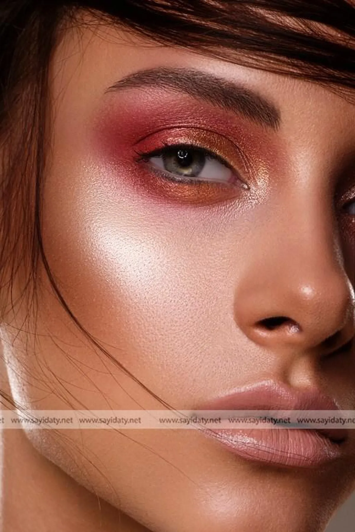 مكياج عيون وشفاه على الموضة: الألوان ناريّة صارخة تضج ُّ بالحياة والجاذبية ،كالوردي الخشبي والفوشيا والبرتقالي النارّي التي بدورها تبرز الملامح وتضيؤها.