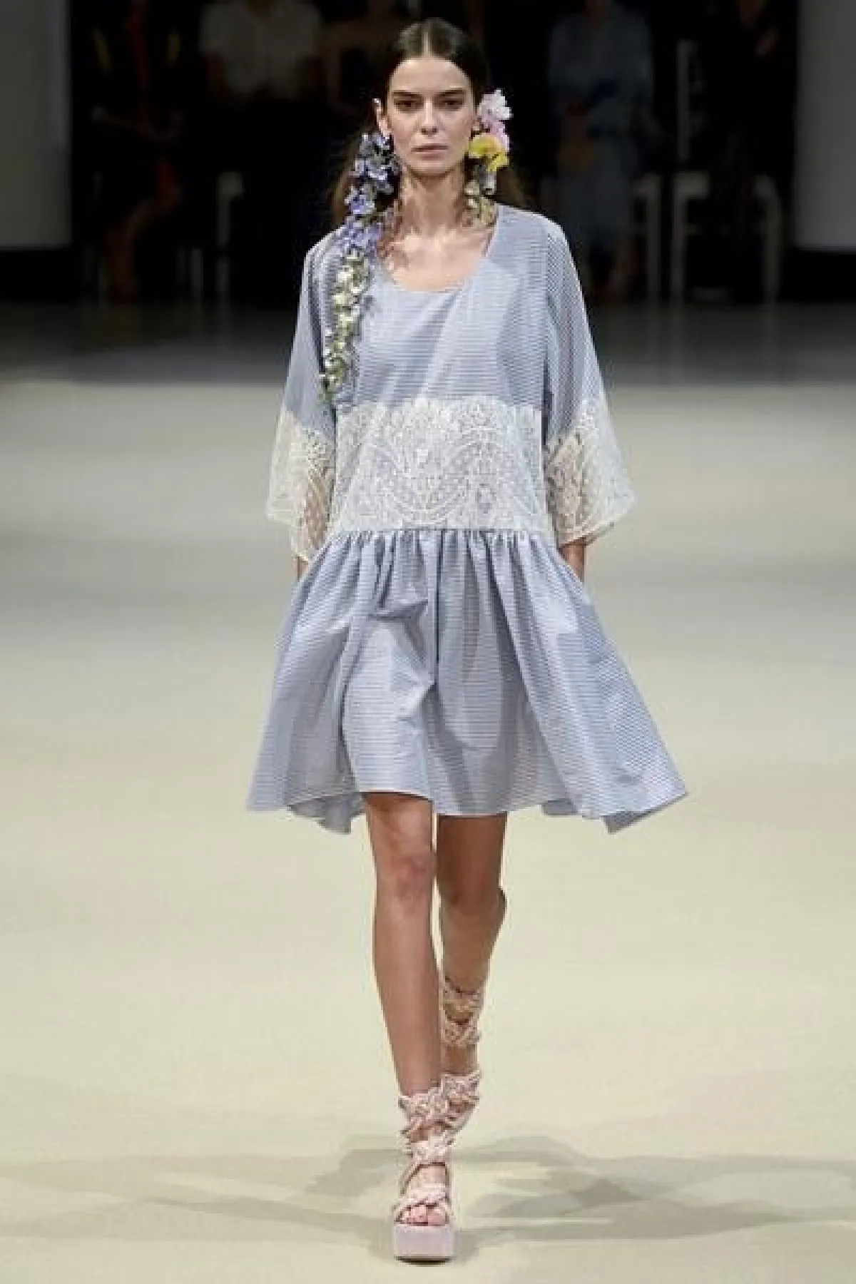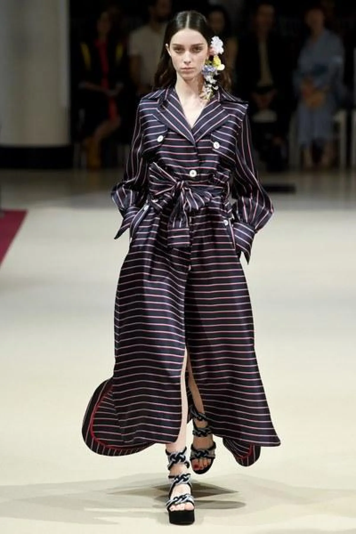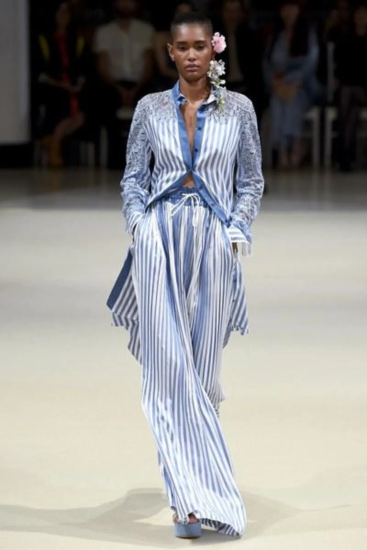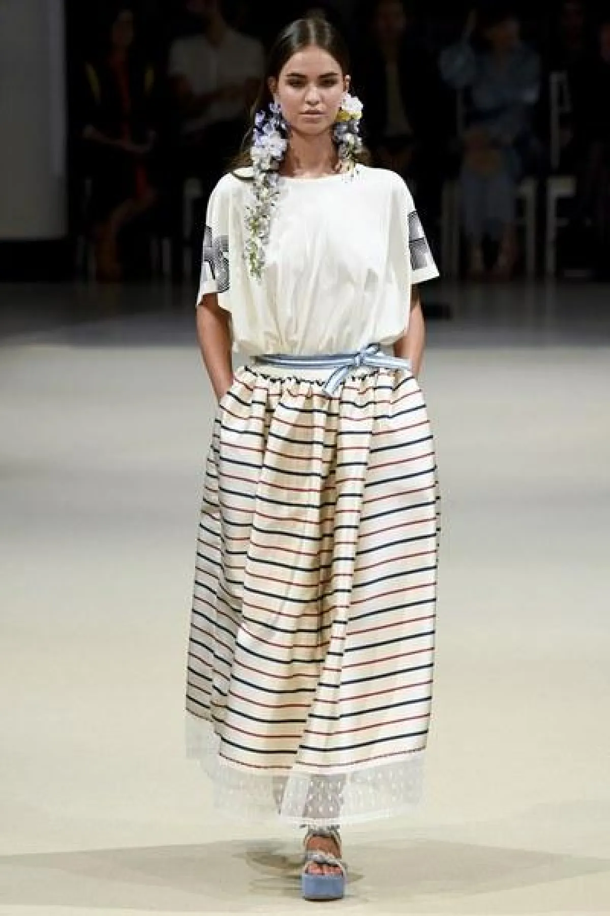 أما الأقمشة فكانت من الحرير المقلّم اللامع، والشيفون والكوبير، واللافت في العرض كان التركيز على خصر المرأة لإبراز أنوثتها، وجمال جسدها الرشيق.