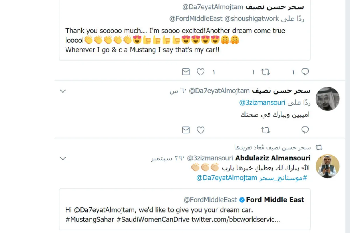 وفي التفاصيل، كشف الحساب الرسمي لشركة "فورد ميدل إيست" في "تويتر" عن مفاجأة سارة للناشطة السعودية سحر ناصيف، حيث أعلنت "فورد" عن تحقيق حلمها بإهدائها سيارة "موستنج". وأرفقت الشركة التغريدة بمقتطفات من تصريحات الناشطة السعودية لـ "BBC" وهي تعبر عن فرحتها بالأمر السامي بالسماح للمرأة بقيادة السيارة داخل السعودية، وأنها تحلم بعد هذا القرار بامتلاك سيارة من طراز موستنج.