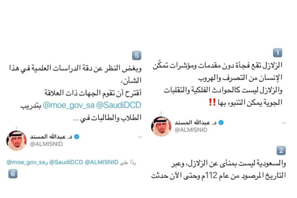 جاء ذلك في تغريدات للمسند على حسابه الشخصي في موقع التواصل الاجتماعي "تويتر"، طالب فيها كذلك الجهات المعنية بتدريب الطلاب والطالبات في المدارس على كيفية مواجهة الزلازل وإخلاء المباني.