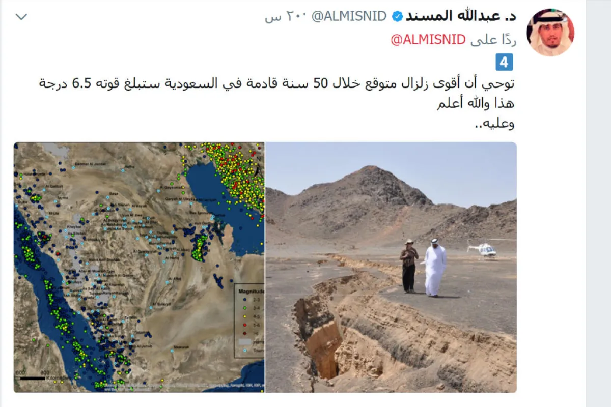 من المعلوم للجميع أن الزلازل من الكوارث الكونية المدمرة التي تحدث فجأة دون سابق إنذار، ولا يمكن التنبؤ بها، لكنَّ أستاذ الجغرافيا في جامعة القصيم الدكتور عبدالله المسند، قال: إن مؤشرات البيانات الإحصائية العلمية الجيولوجية، توحي إلى أن أقوى زلزال متوقع خلال الخمسين سنة المقبلة في السعودية ستبلغ قوته 6.5 درجة فقط.