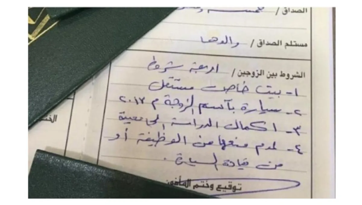 وتداول رواد في مواقع التواصل الاجتماعي صورة لعقد النكاح، الذي اشترطت فيه الفتاة المُقبلة على الزواج، 4 شروط، هي: سيارة موديل 2017 مسجلة باسمها، وعدم منعها من القيادة، وتوفير بيت خاص بها، وعدم منعها من إكمال دراستها الجامعية ثم التوظف.