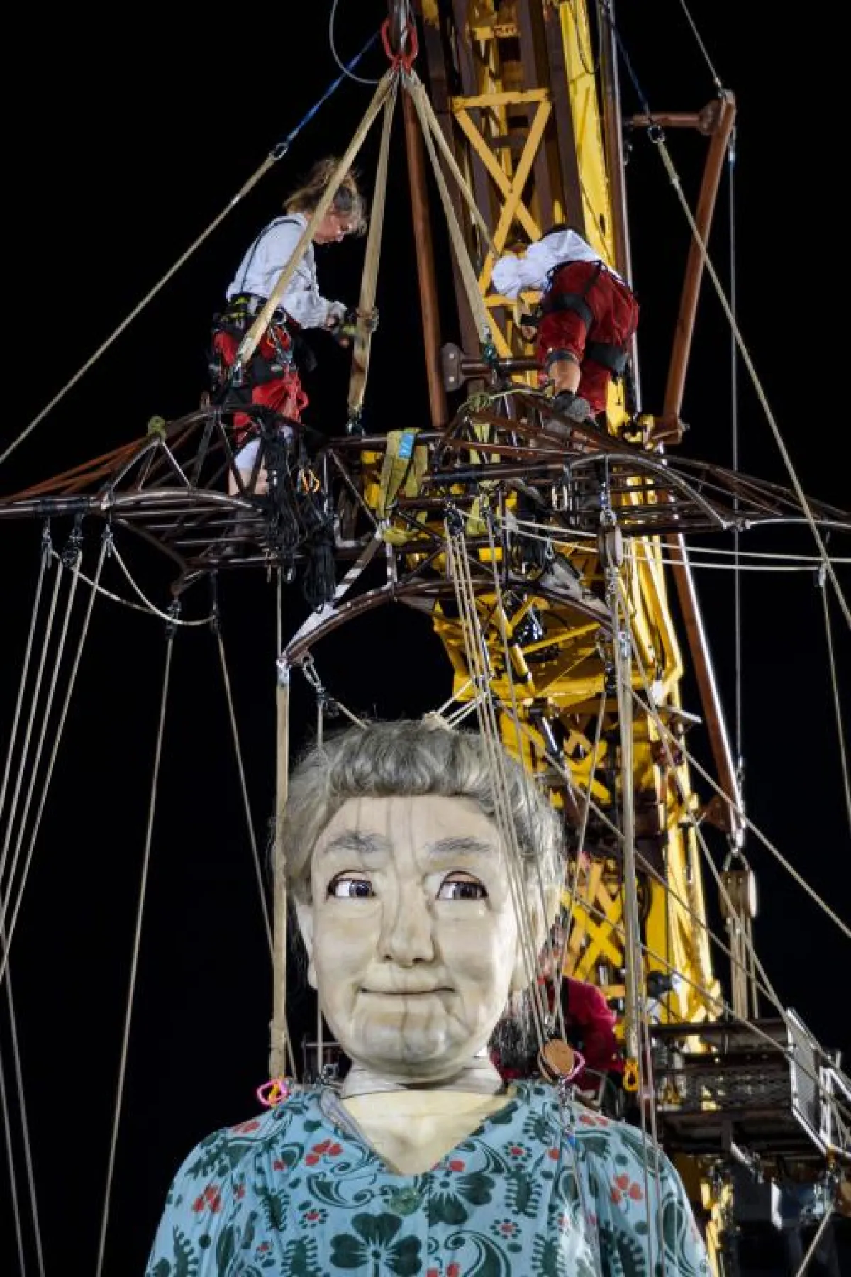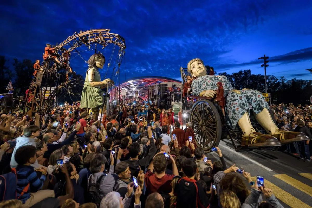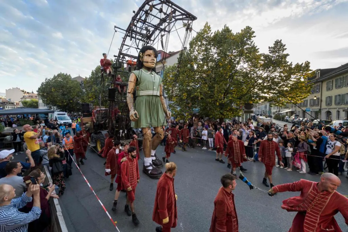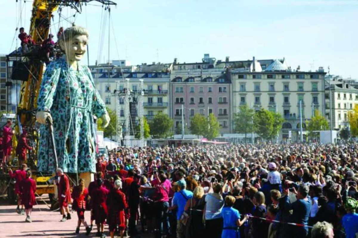 حيث شارك عشرات الفنانين في تحريك دمية بارتفاع ثمانية أمتار تجسد دور جدة عمرها "83 عاماً"، وأخرى ارتفاعها ستة أمتار تجسد حفيدتها البالغة من العمر "5 سنوات"، واللتين توقفتا في أماكن مختلفة في جنيف، لتناول الحلوى أو قيادة دراجة سكوتر، وسارت فرقة موسيقية خلف الدميتين.