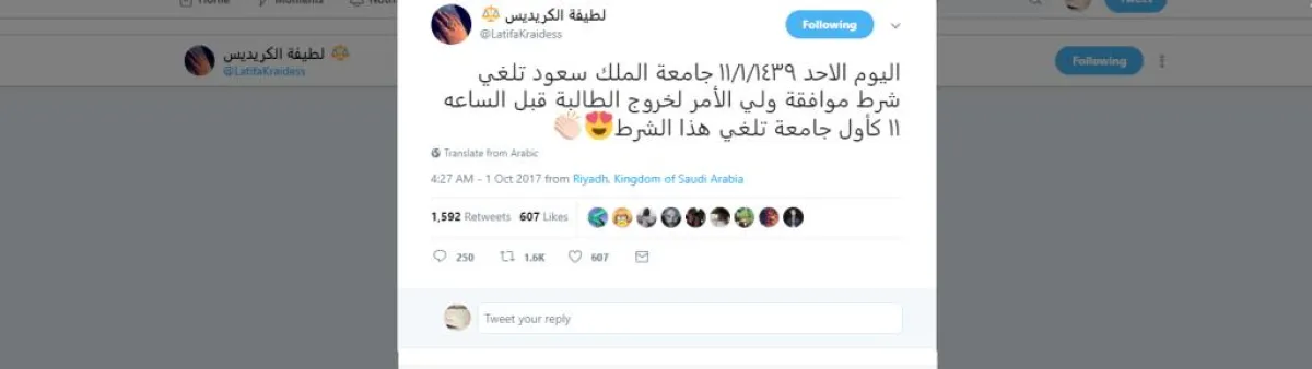 وعبرت الفتيات عن فرحتهن، حيث كتبت إحدى طالبات الجامعة، وهي @LatifaKraidess: "اليوم الأحد ١١/١/١٤٣٩ جامعة الملك سعود تلغي شرط موافقة ولي الأمر لخروج الطالبة قبل الساعة ١١ كأول جامعة تلغي هذا الشرط".
