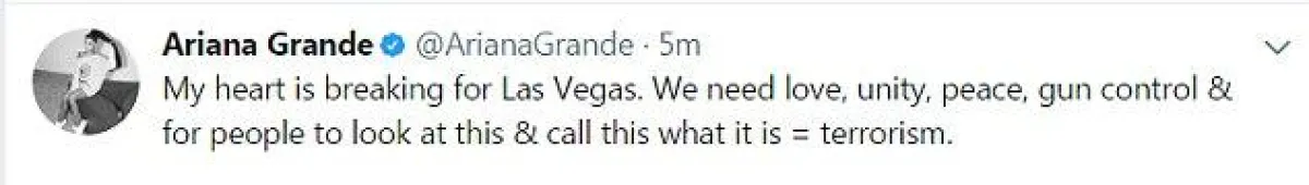 المغنية أريانا غراندي Ariana Grande: "قلبي ينفطر من أجل لاس فيغاس. نحتاج الى الحب والوحدة والسلام".