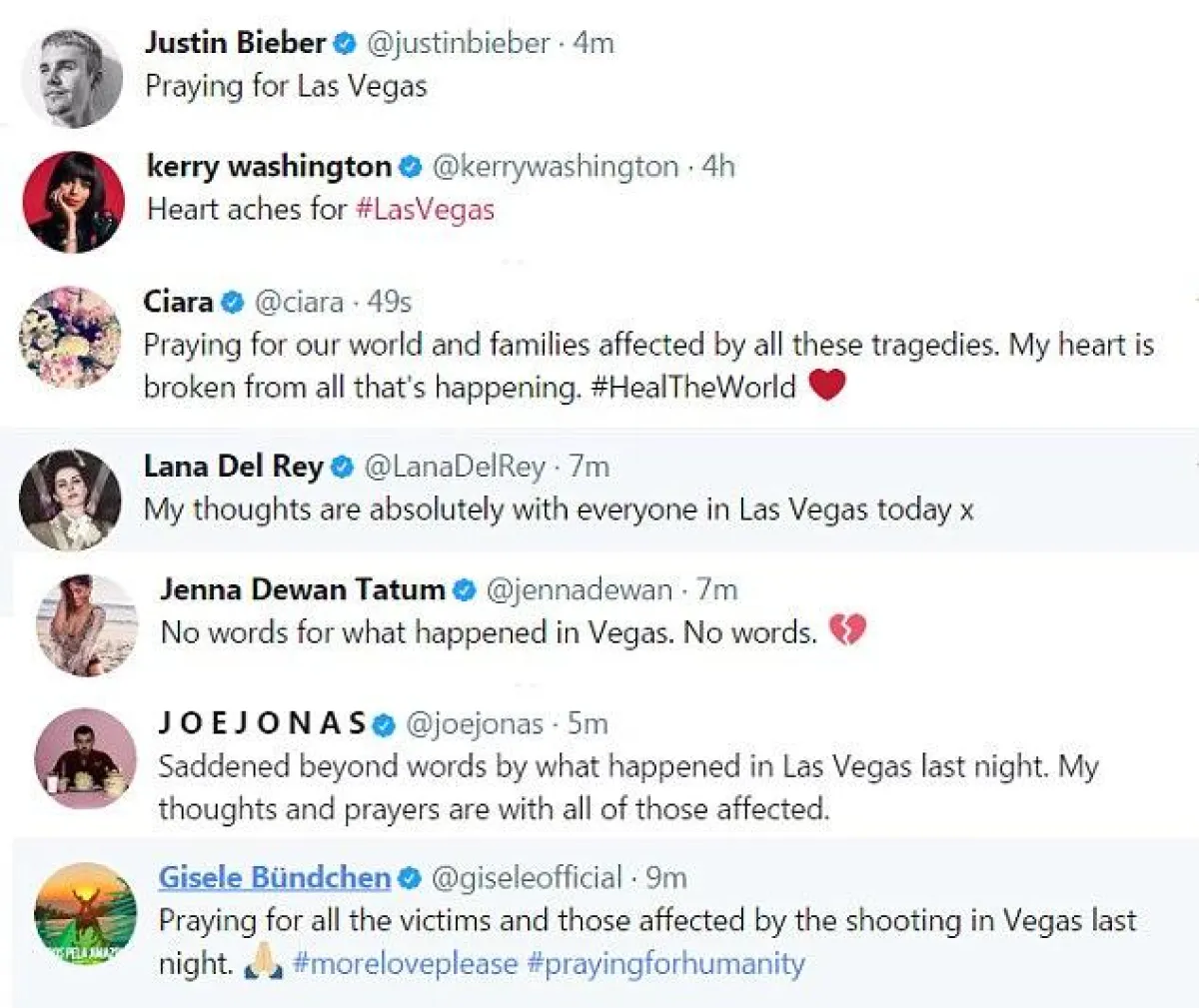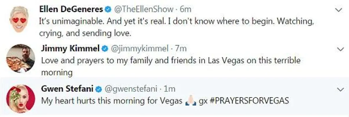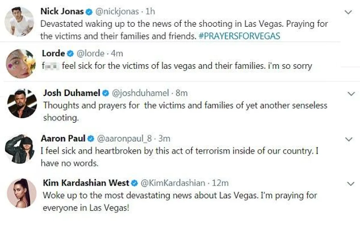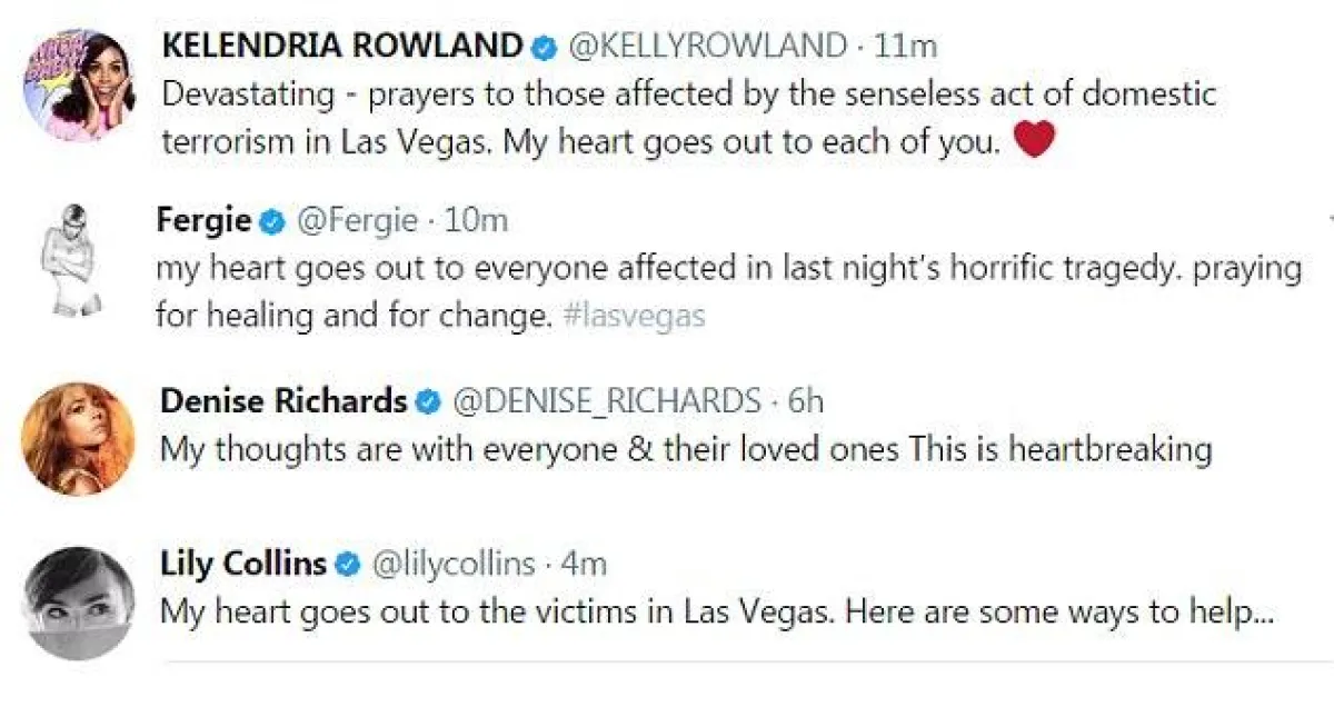 سياسيون وفنانون ونجوم عبروا عن رفضهم للمجزرة وتضامنهم مع أهالي الضحايا الـ58 والجرحى الذين فاق عددهم 515 شخصاً، وأبرز مشاهير العالم الذين غردوا ضمن هاشتاق #PrayForVegas هم: