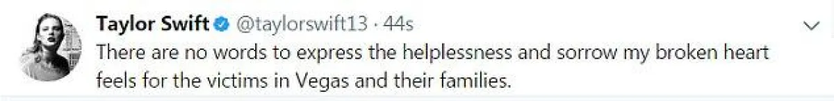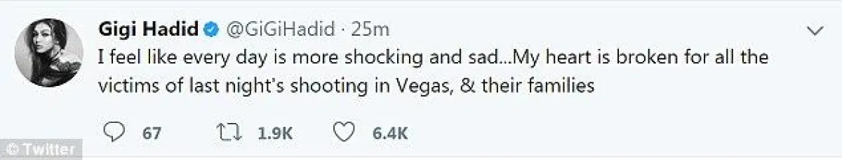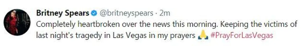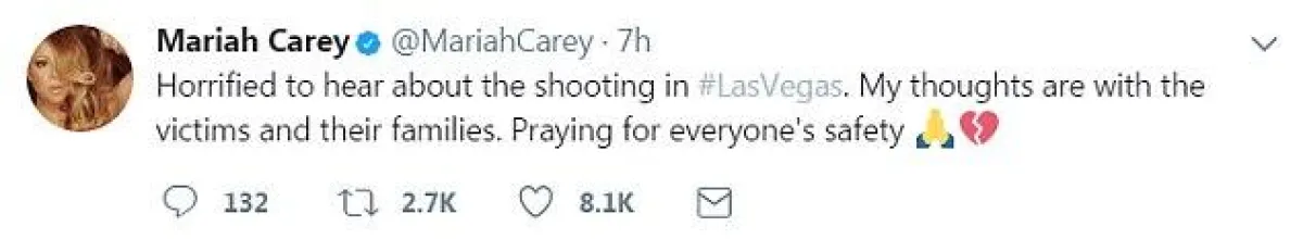 مقدة البرامج تايرا بانكس Tyra Banks: "قلبي مع الضحايا وعائلاتهم وأصدقائهم الذين عاشواه هذه المأساة المدمرة في لاس فيغاس".
