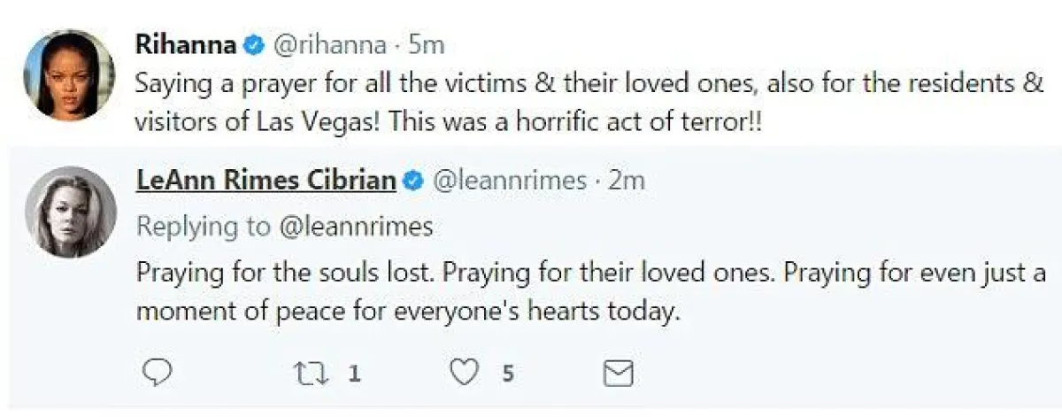 المغنية ريهانا Rihanna: "أصلي لجميع الضحايا وعائلاتهم، أيضاً للمواطنين والزائرين في لاس فيغاس.. إنه عمل إرهابي مروع".