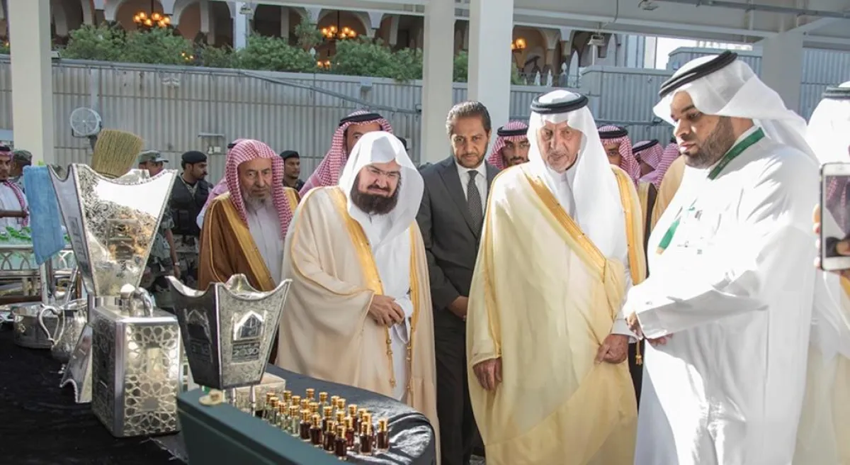 دشن مستشار خادم الحرمين الشريفين أمير منطقة مكة المكرمة الأمير خالد الفيصل المعرض التعريفي للأدوات المستخدمة في غسيل الكعبة المشرفة.