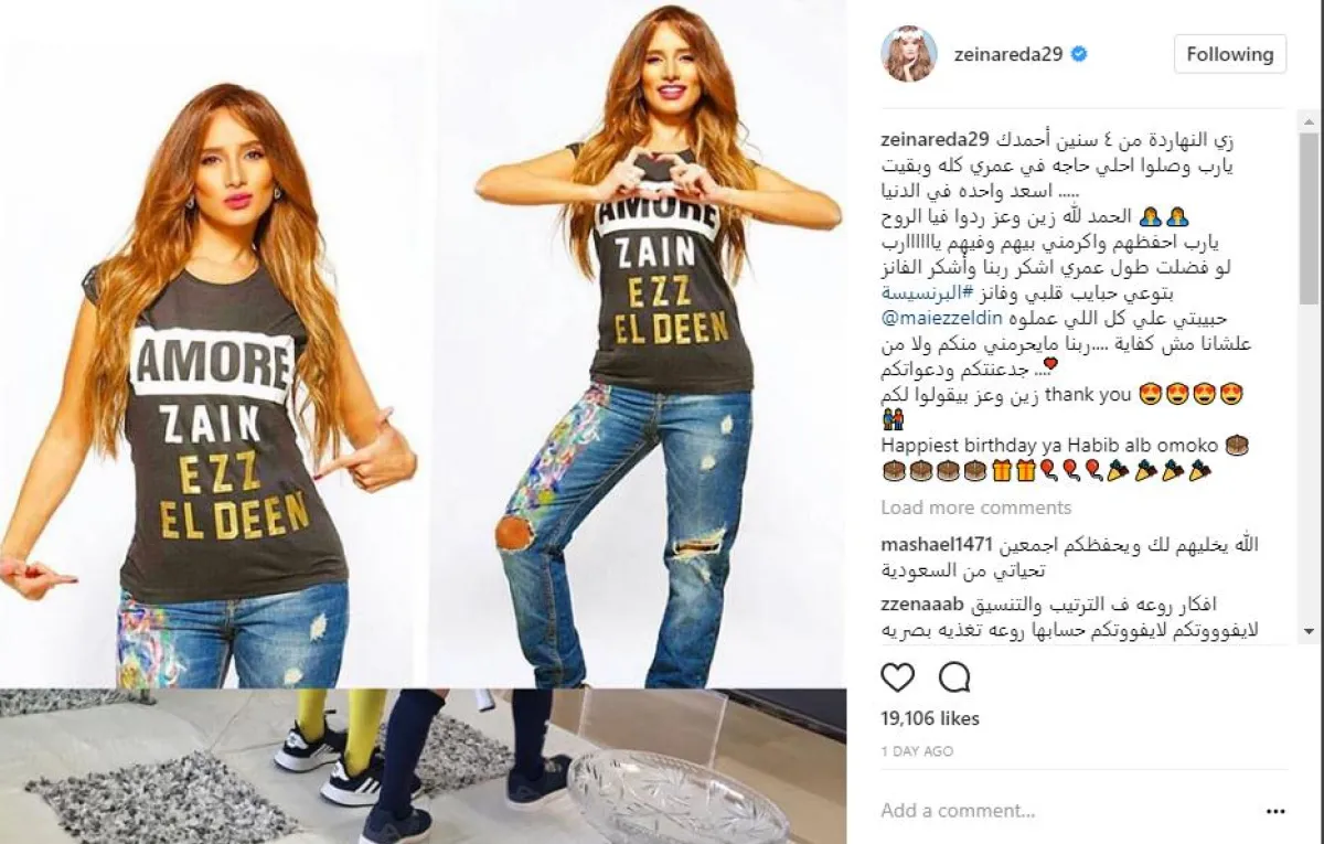 زينة بدأت الاحتفال بعيد ميلاد توأميها بنشر صورة لها وهي ترتدي تيشرت يحمل اسميهما وعلّقت على الصورة قائلة: النهاردة من ٤ سنين أحمدك يارب وصلوا احلى حاجة في عمري كله، وبقيت اسعد واحدة في الدنيا .. الحمد لله زين وعز ردوا فيا الروح، يارب احفظهم واكرمني بيهم وفيهم ياااااارب.