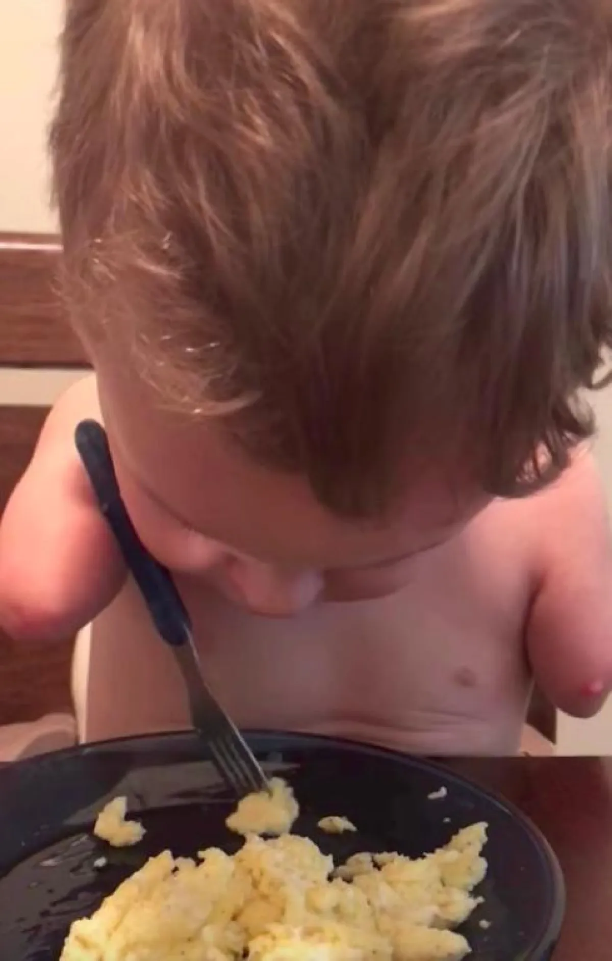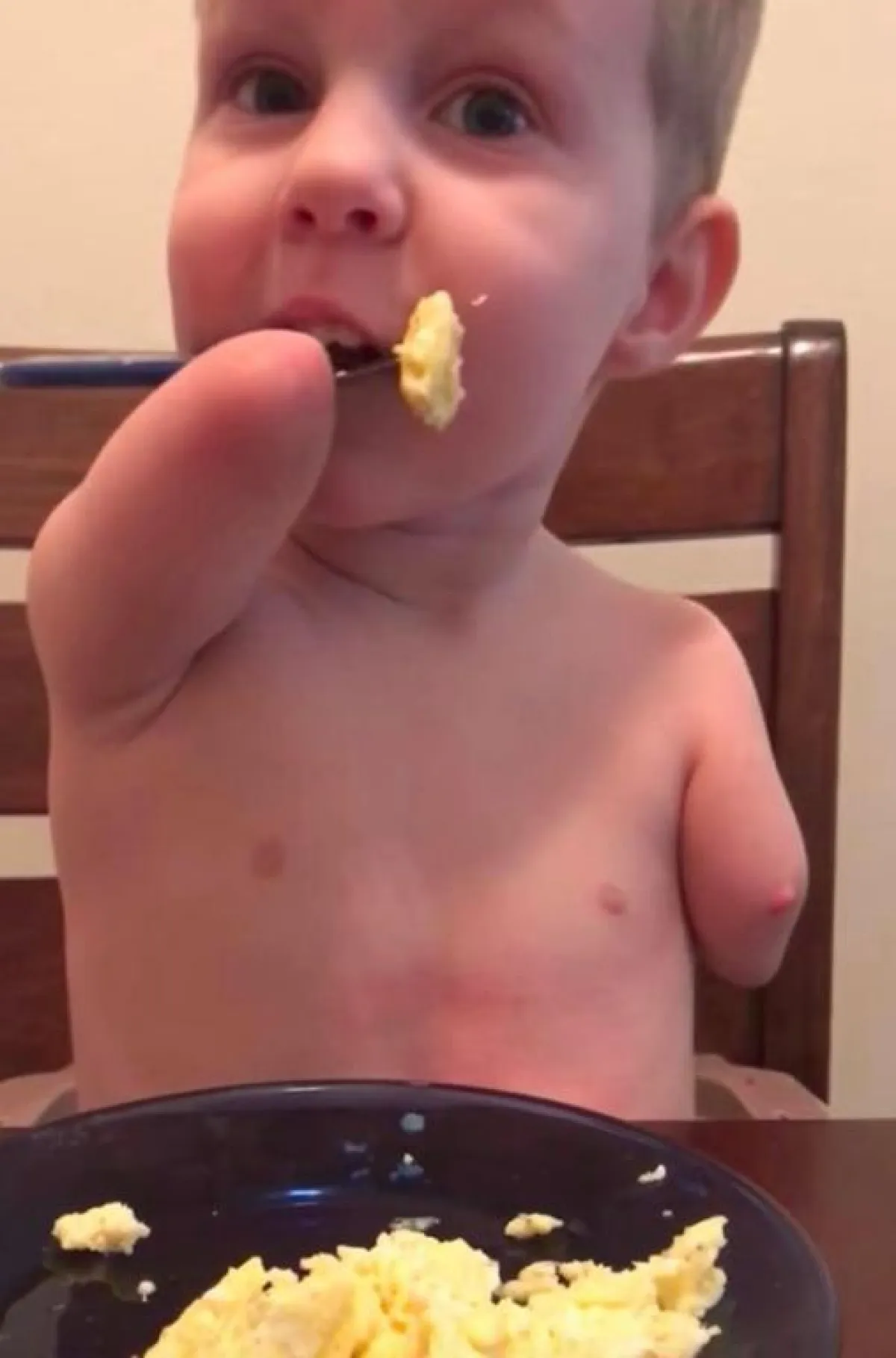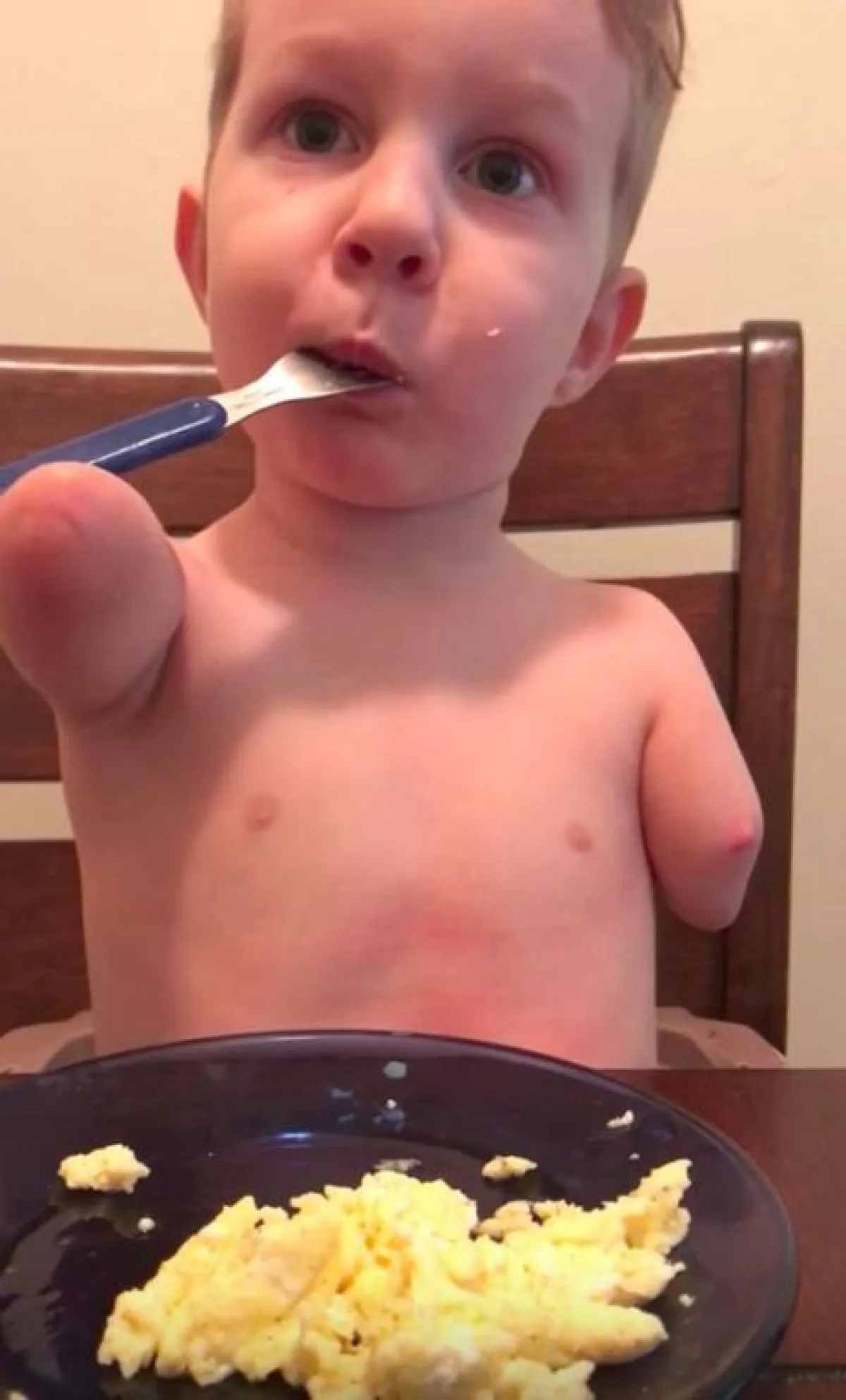 ووفقاً لـ«ميرور» البريطانية، كانت والدة الطفل ويدعى «كامدين»، البالغ من العمر 4 سنوات، قد نشرت مقطع فيديو على مواقع التواصل، يظهر فيه طفلها، وهو يستخدم الشوكة لتناول الطعام، رغم عدم امتلاكه ذراعين، حيث ولد وهو يعاني من متلازمة وراثية نادرة تدعى «فوكوميليا»، تسببت بتوقف نمو ذراعيه عند المرفقين، لكنها أصرت على أن تعلمه كيف يتناول طعامه بيده ويتحدى إعاقته.