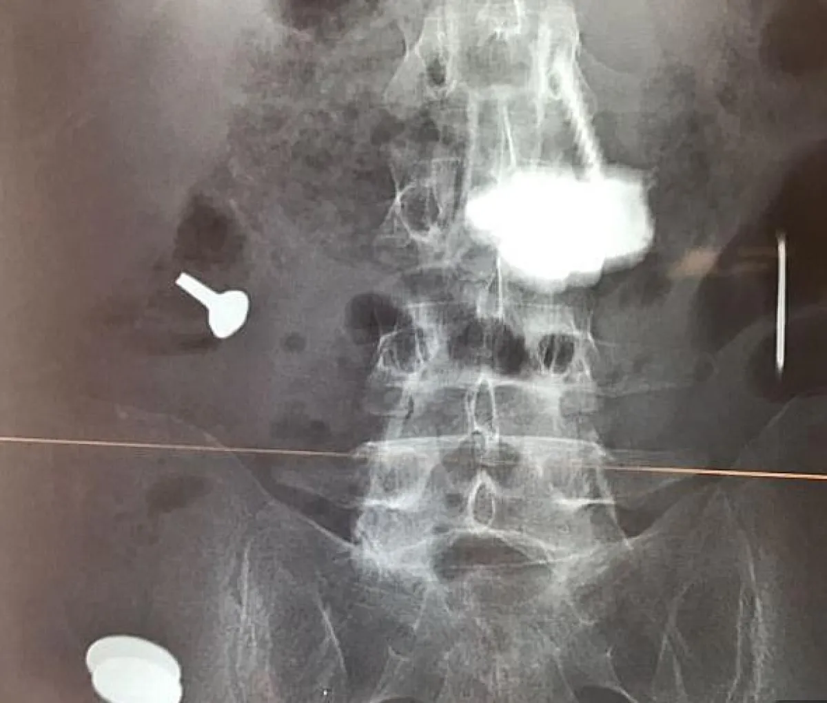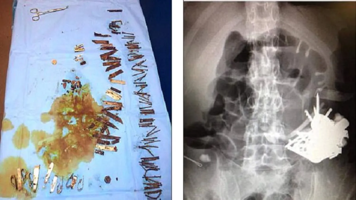 وبعد 8 أشهر، نُقل المريض إلى المستشفى للسبب نفسه، ثم خضع للجراحة، حيث وجد الأطباء آثارًا للمسامير والسكاكين، والأدوات الحادة الأخرى في بطنه.