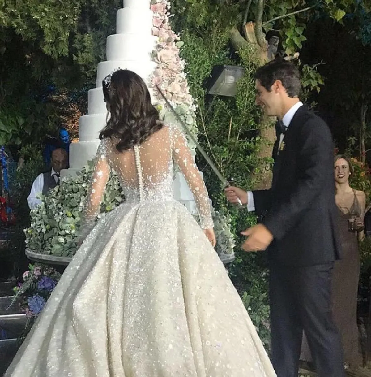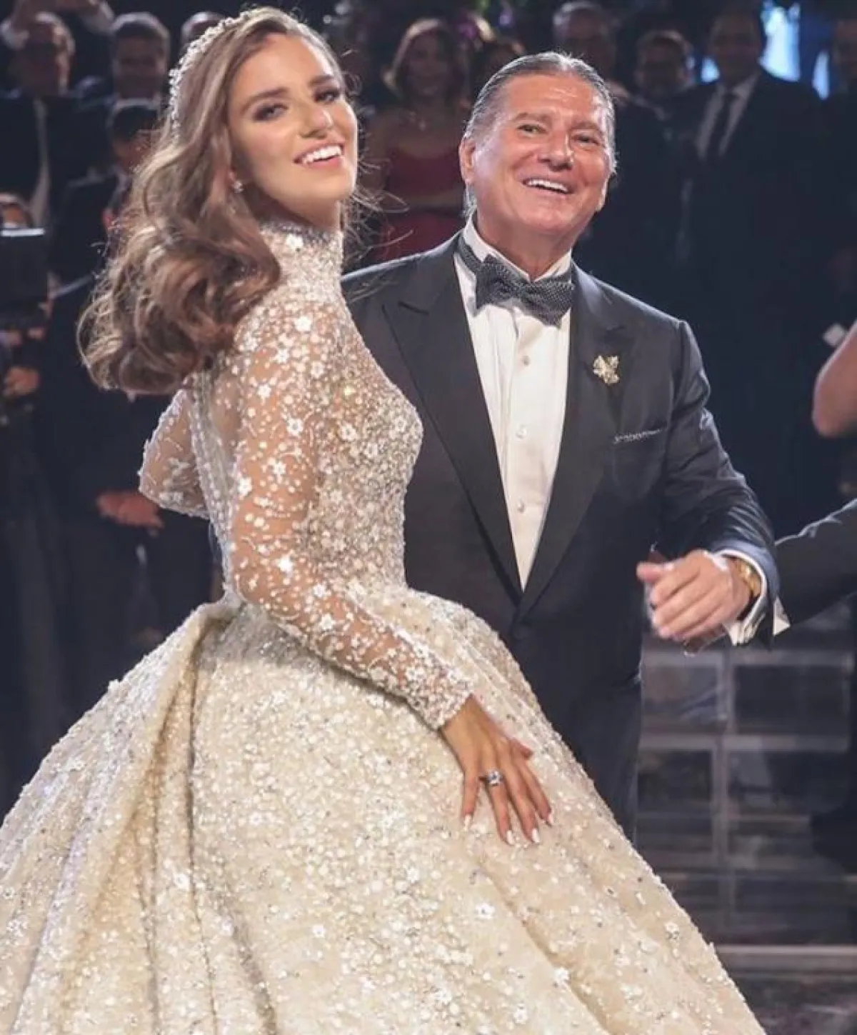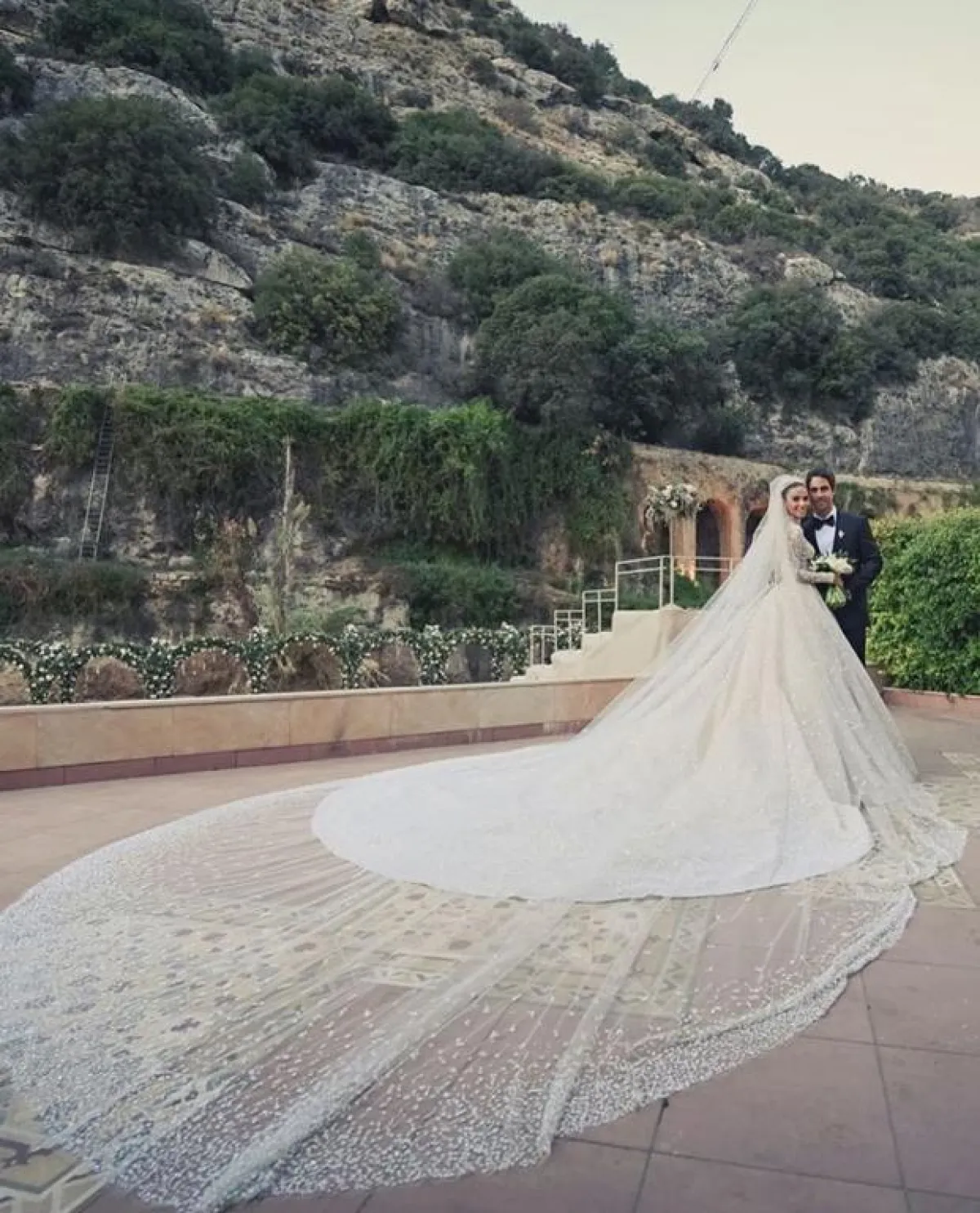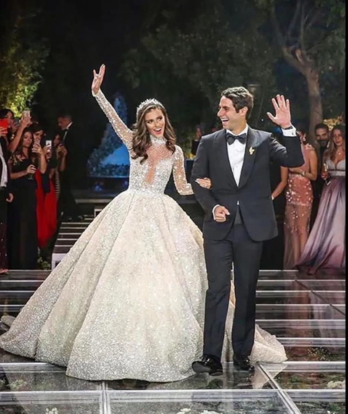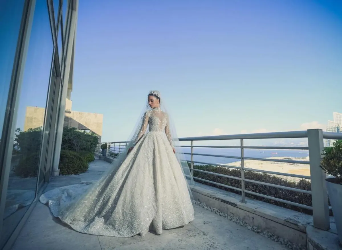 وعلى الرغم من السريّة التامة التي فرضتها على حفل زفافها الذي أقيم في لبنان، إلا أنّ المصمم العالمي زهير مراد شارك محبّيه على انستقرام الصورة الأولى للعروس التي تألقت بفستان أسطوري مستوحى من تفاصيل قصة خيالية، حيث اعتمدت على فستان منفوش مرصّع بالألماس بالكامل، لتبدو وكأنها أميرة.