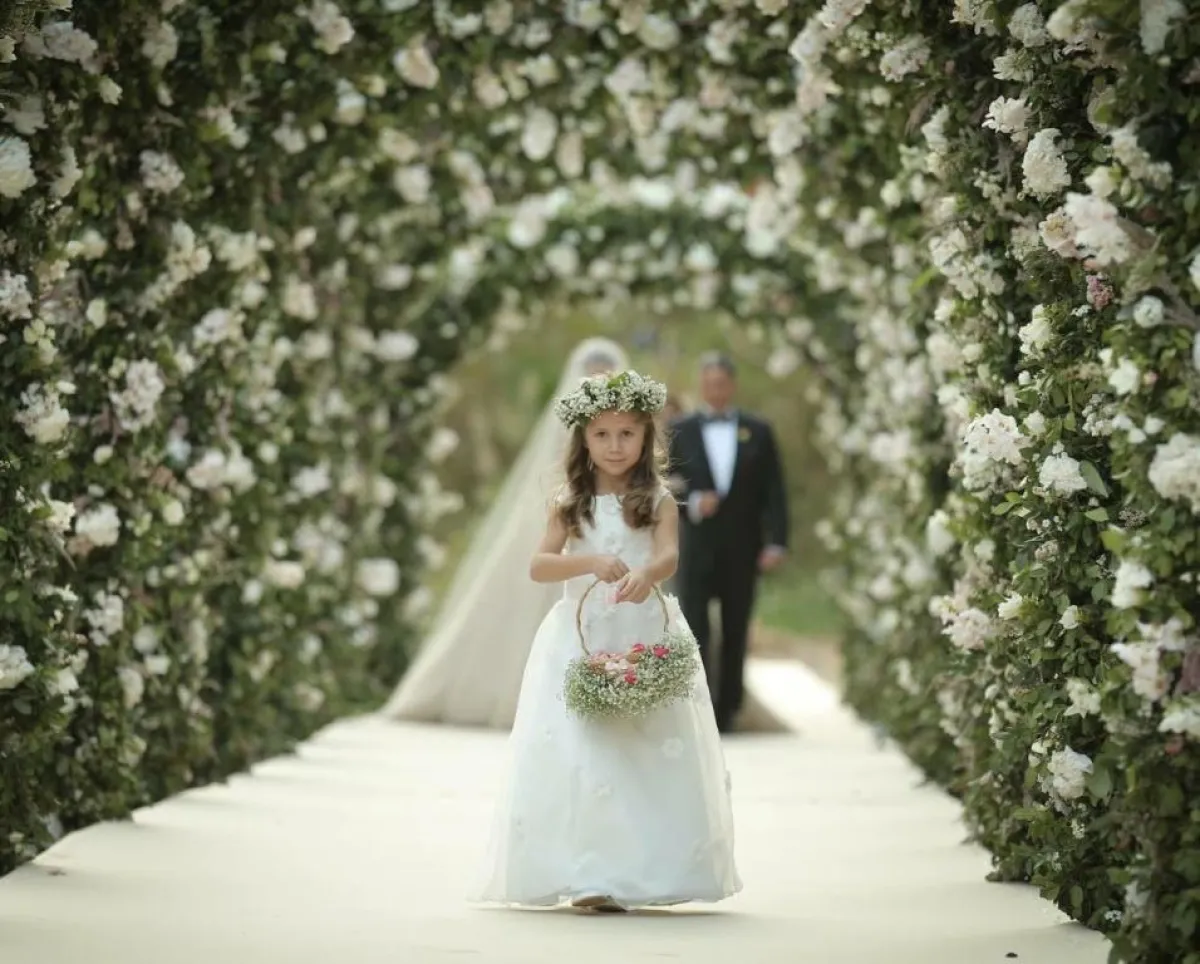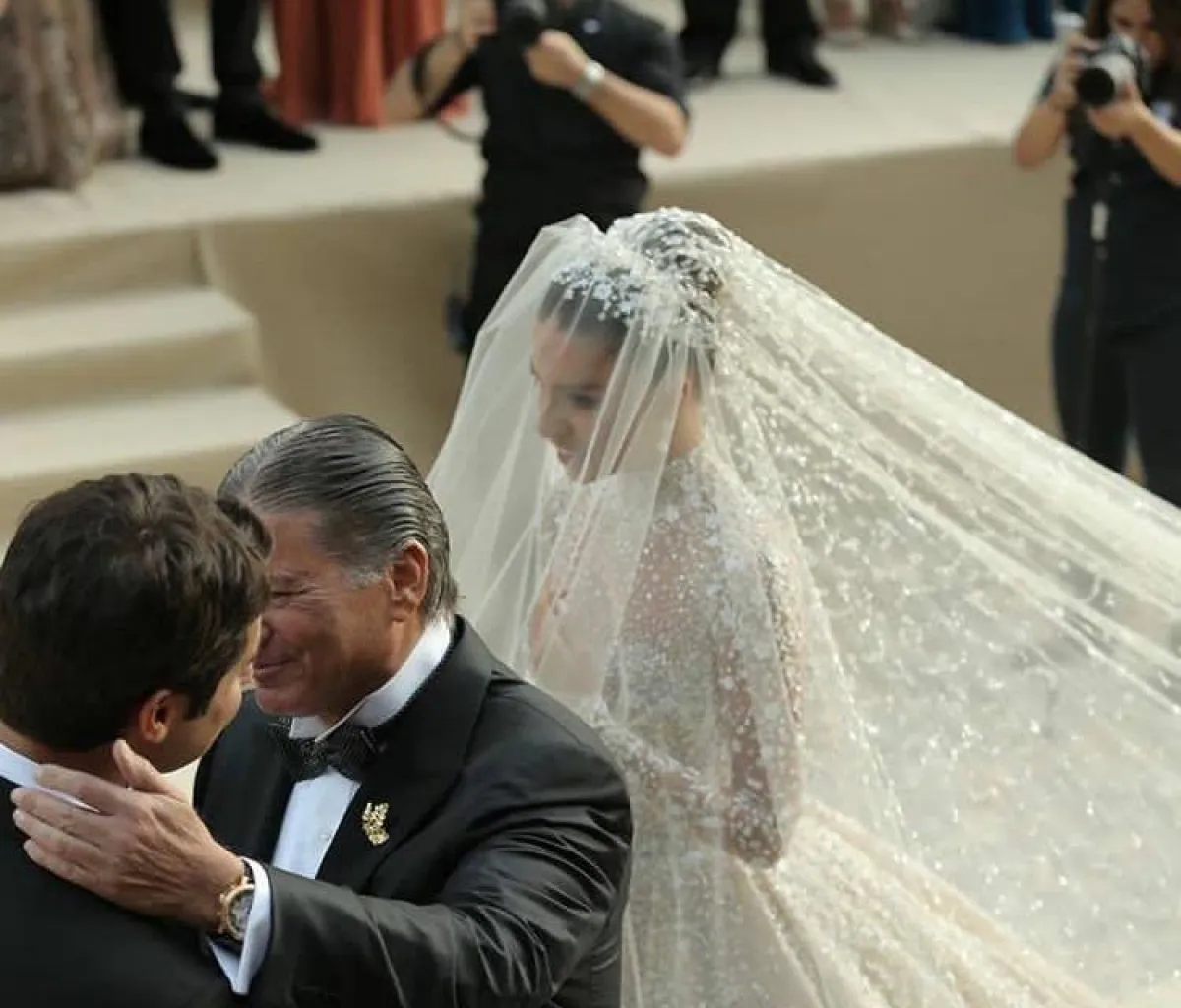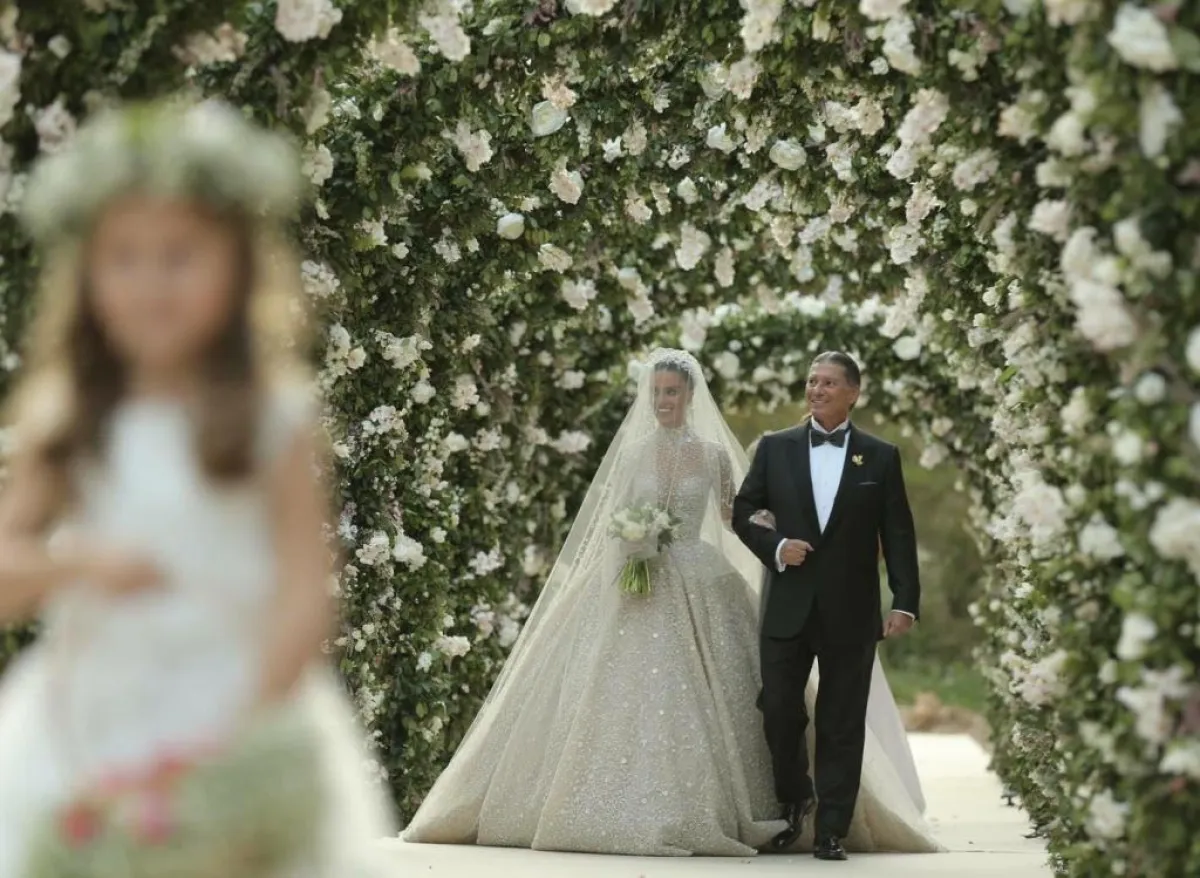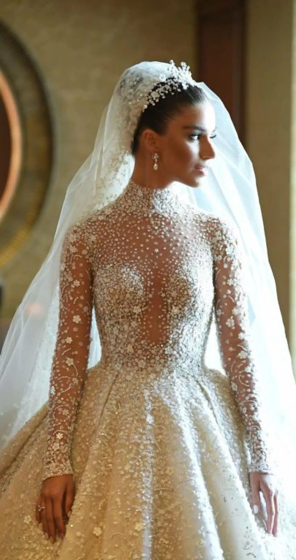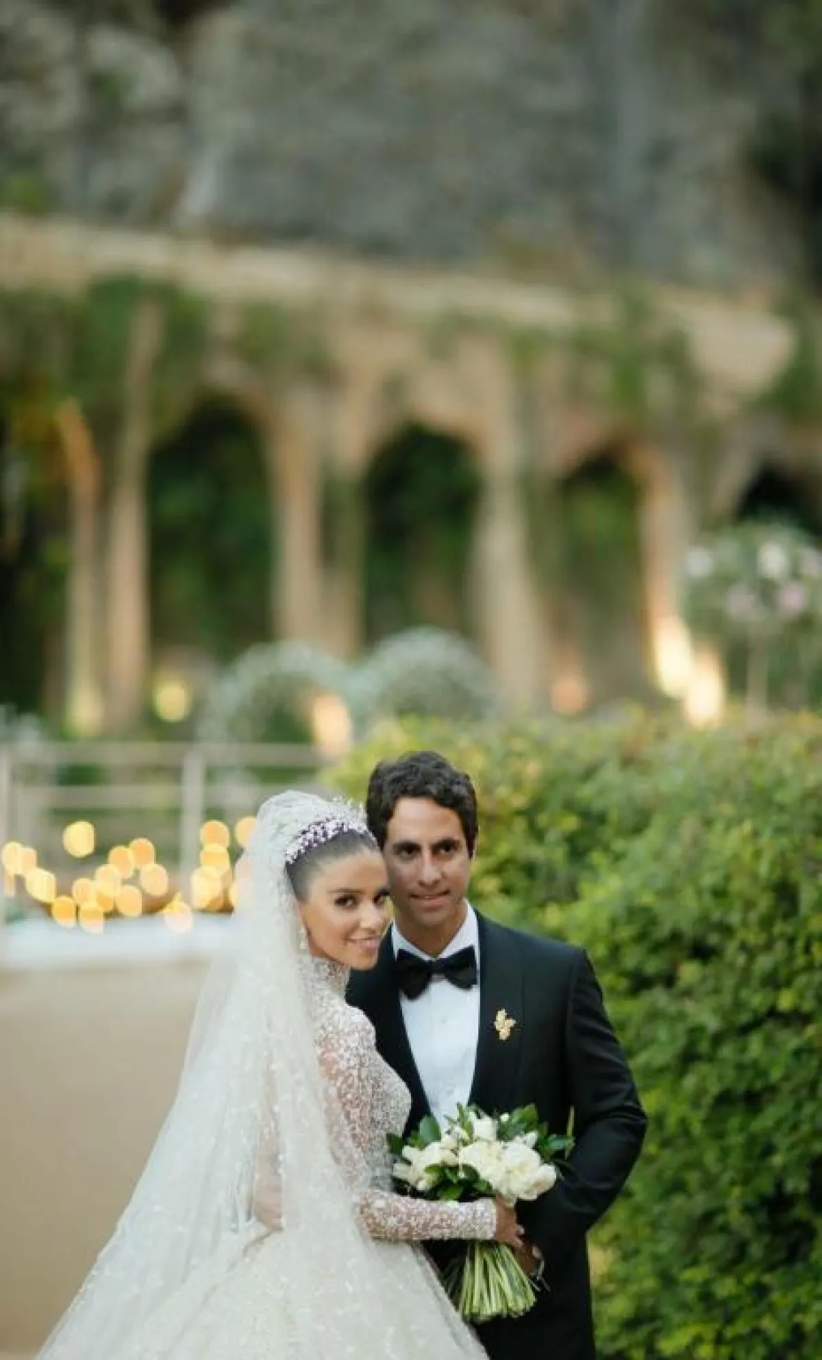 وعلى الرغم من السريّة التامة التي فرضتها على حفل زفافها الذي أقيم في لبنان، إلا أنّ المصمم العالمي زهير مراد شارك محبّيه على انستقرام الصورة الأولى للعروس التي تألقت بفستان أسطوري مستوحى من تفاصيل قصة خيالية، حيث اعتمدت على فستان منفوش مرصّع بالألماس بالكامل، لتبدو وكأنها أميرة.