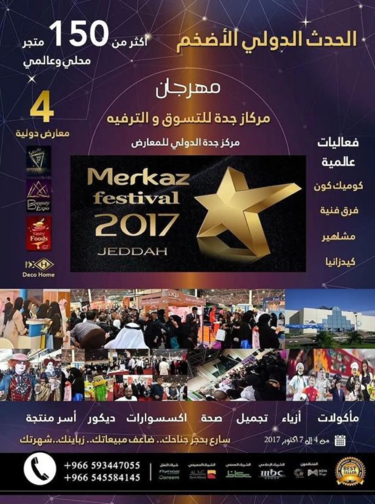 يتضمن المهرجان فعاليات ترفيهية عالمية (كوميك كون - كيدزانيا - فرق فنية وفلوكلورية - سوق المبدعين - لقاءات و ورش عمل مع النجوم). كما يضم 4 معارض متخصصة هي: معرض تيستي فودز اكسبو 2017 (للمأكولات والمنتجات الغذائية)، معرض فاشن فير 2017 (للأزياء والمجوهرات والموضة) معرض ديكوهوم اكسبو (للديكور والفنون البصرية والتجهيزات المنزلية) معرض بيوتي اكسبو ( للتجميل والصحة).