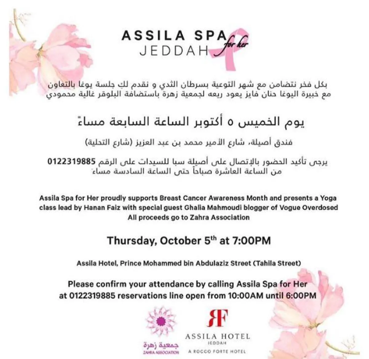 ستعقد جلسة يوغا مع الخبيرة حنان فايز باستضافة البلوقر "غالية محمودي"، قيمة الجلسة 200 ريال، وسيرجع ريع المبالغ المالية لجمعية زهرة لمكافحة سرطان الثدي.