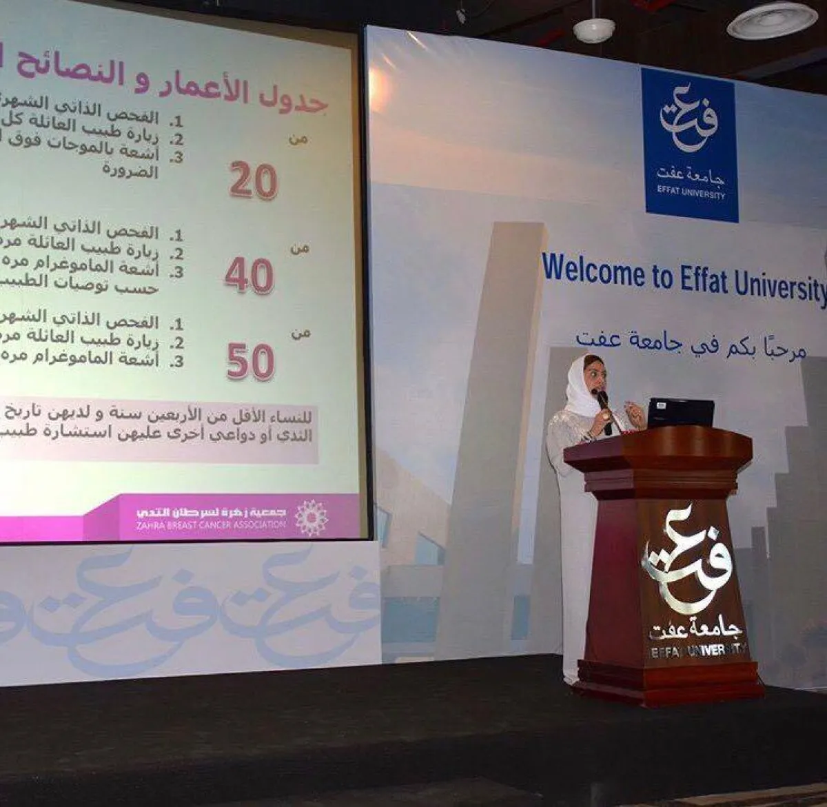 الأسبوع الأول: محاضرة توعوية عن مرض سرطان الثدي وأهمية الكشف المبكر عنه، من قبل الأستاذة تغريد فطاني.